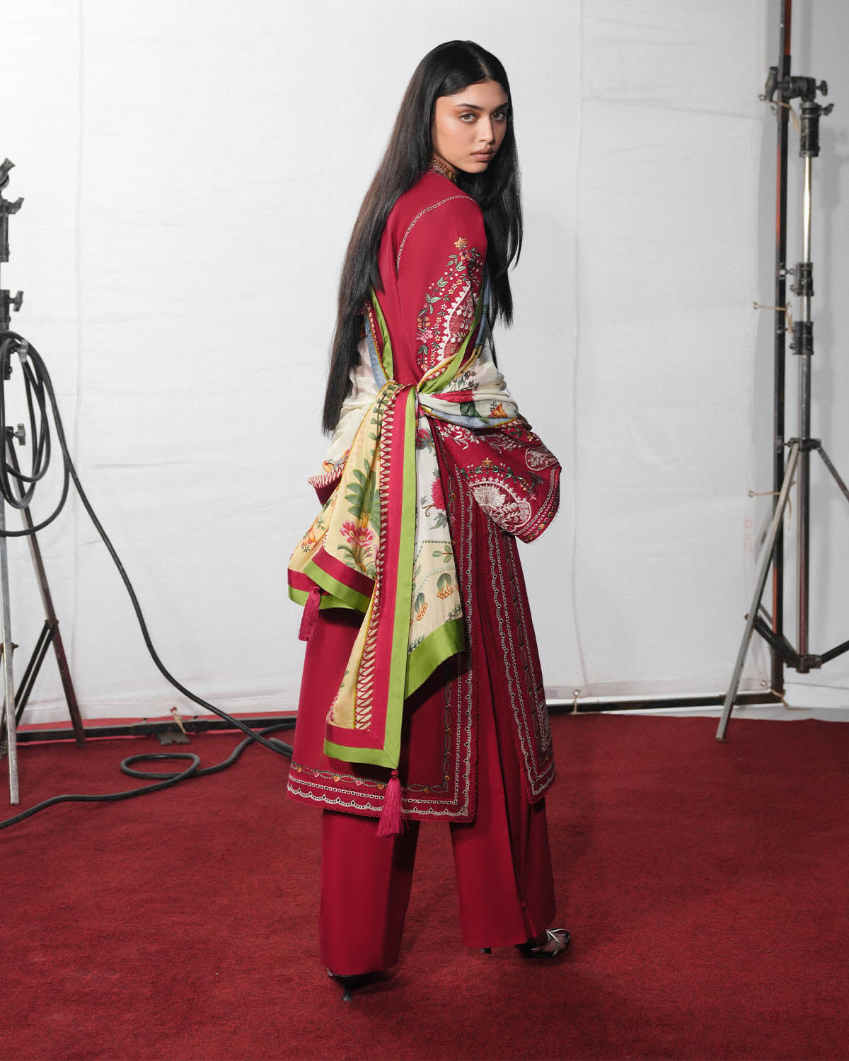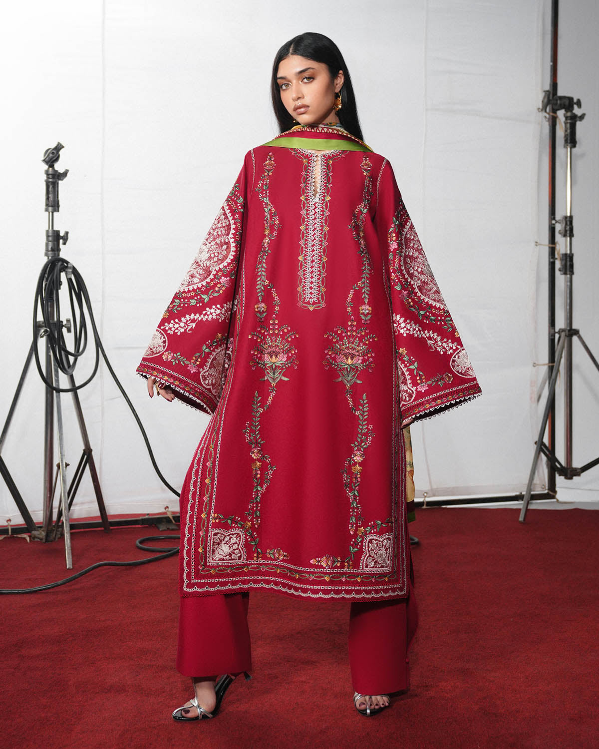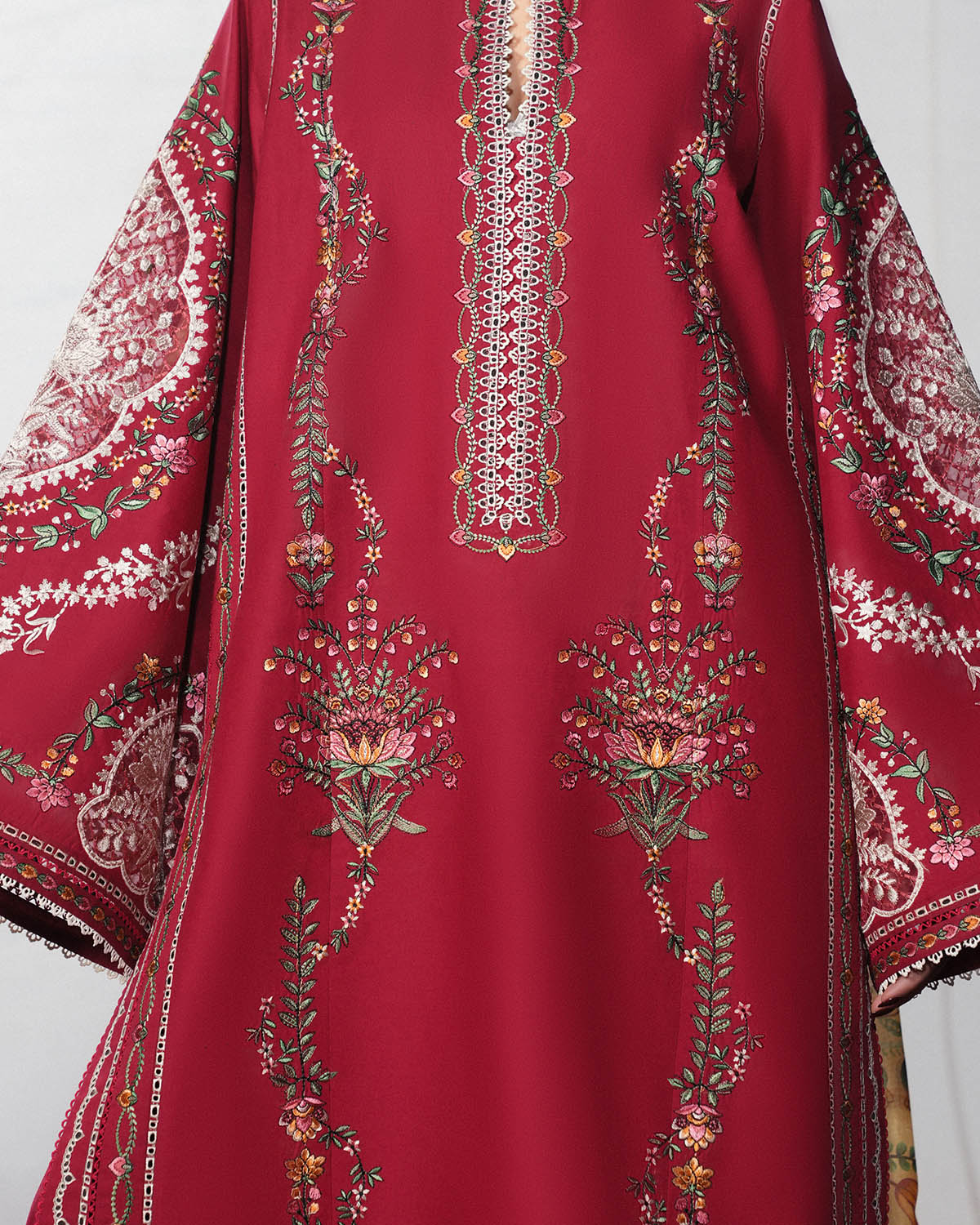 • PRODUCT DESCRIPTION: A classic red long shirt adorned with multicolor floral embroidery is paired with beautifully detailed bell sleeves, featuring monochrome embroidered organza patches for an added touch of refinement. The look is completed with a red, dyed pleated trouser that adds structure and flow, while a digital printed silk dupatta brings in a soft contrast and elevates the ensemble with a contemporary finish.