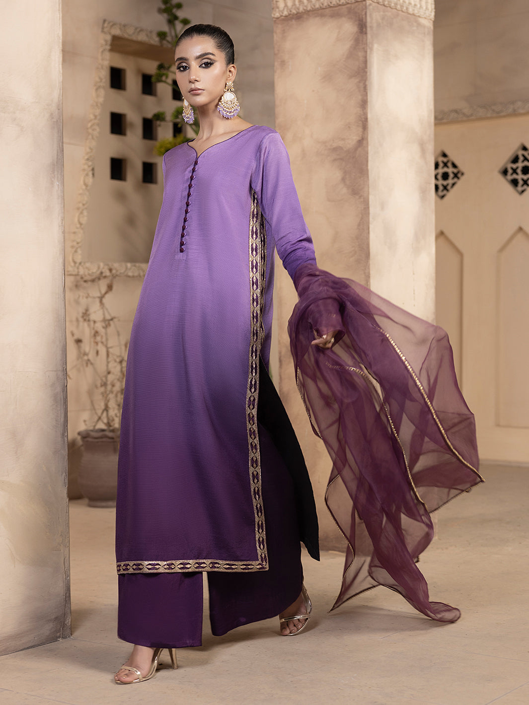 Hemstitch Embroidered Raw Silk Ready to Wear 3Pc Suit - Raania