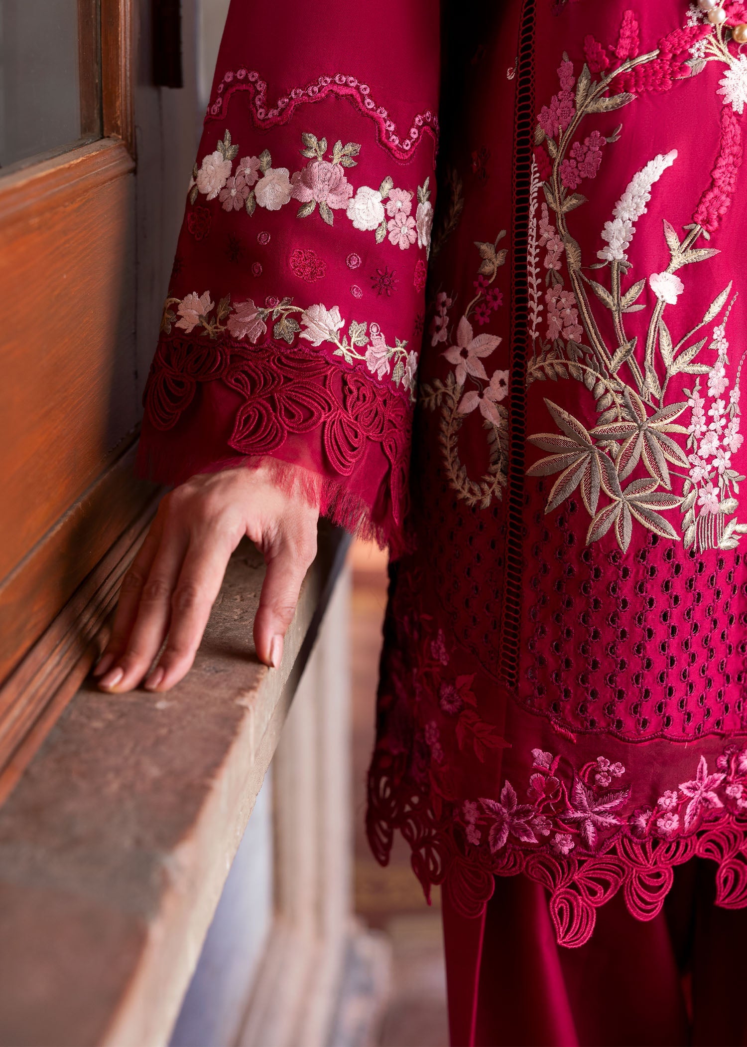 PRODUCT ESCRIPTION: Our final reveal is the epitome of feminine grace. Enchanted with delicate floral embroideries in shades of berry and soft blush threadwork on the daman along with cutwork embroidery finished with a ghara border on organza. This ensemble evokes the dreamy elegance of hand-sketched botanicals reminiscent to a secret garden. A feather-light monar dupatta-its pallus adorned with ethereal florals drifting in a gentle breeze,