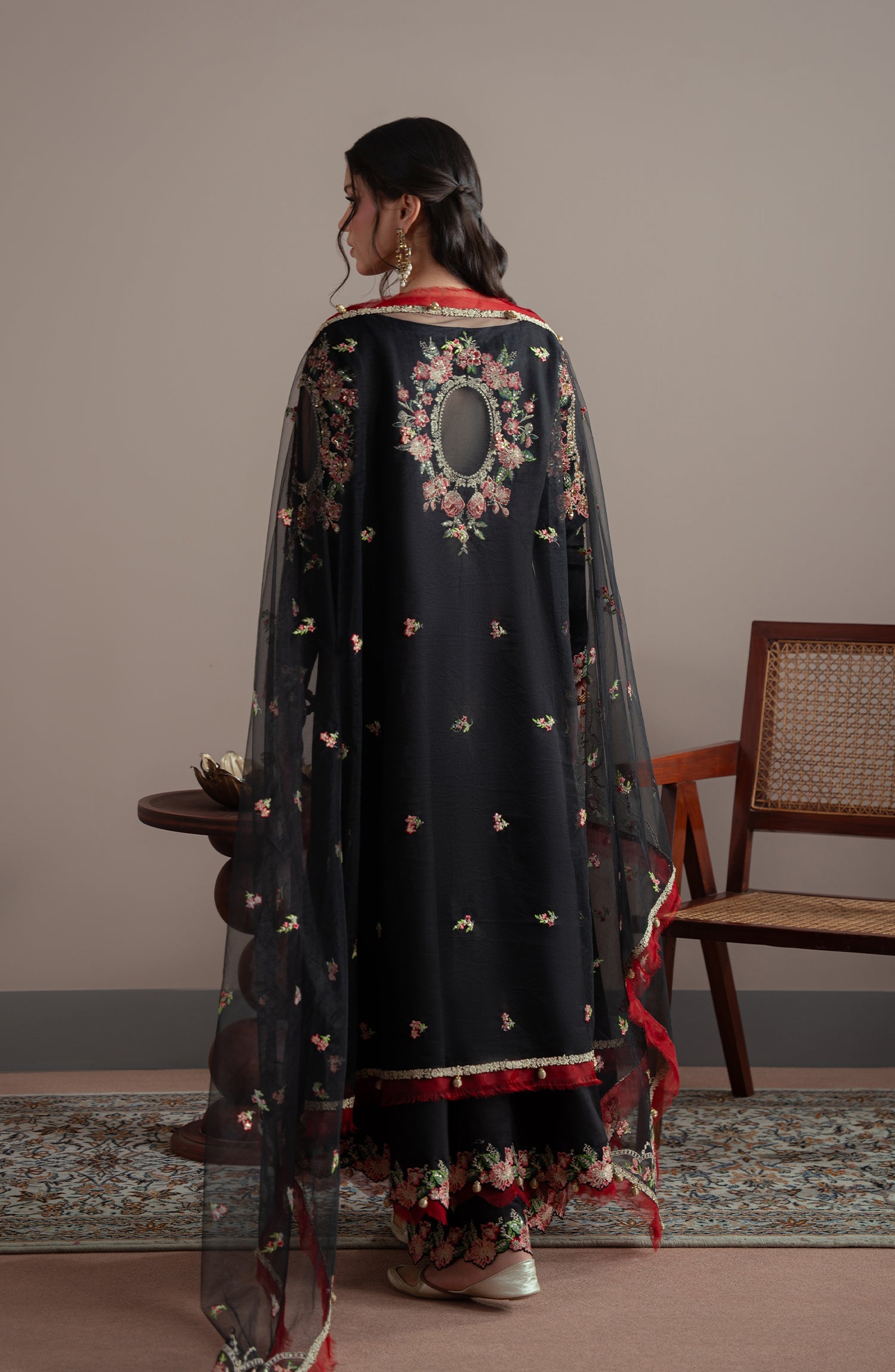 • An everlasting classic — this black raw silk shirt exudes timeless elegance with its rich texture and graceful fall. Paired with a sleek raw silk trouser for a polished appeal, the look is elevated by a delicately crafted net dupatta that adds a touch of ethereal charm. A versatile ensemble, perfect for evening soirées and grand festive occasions.