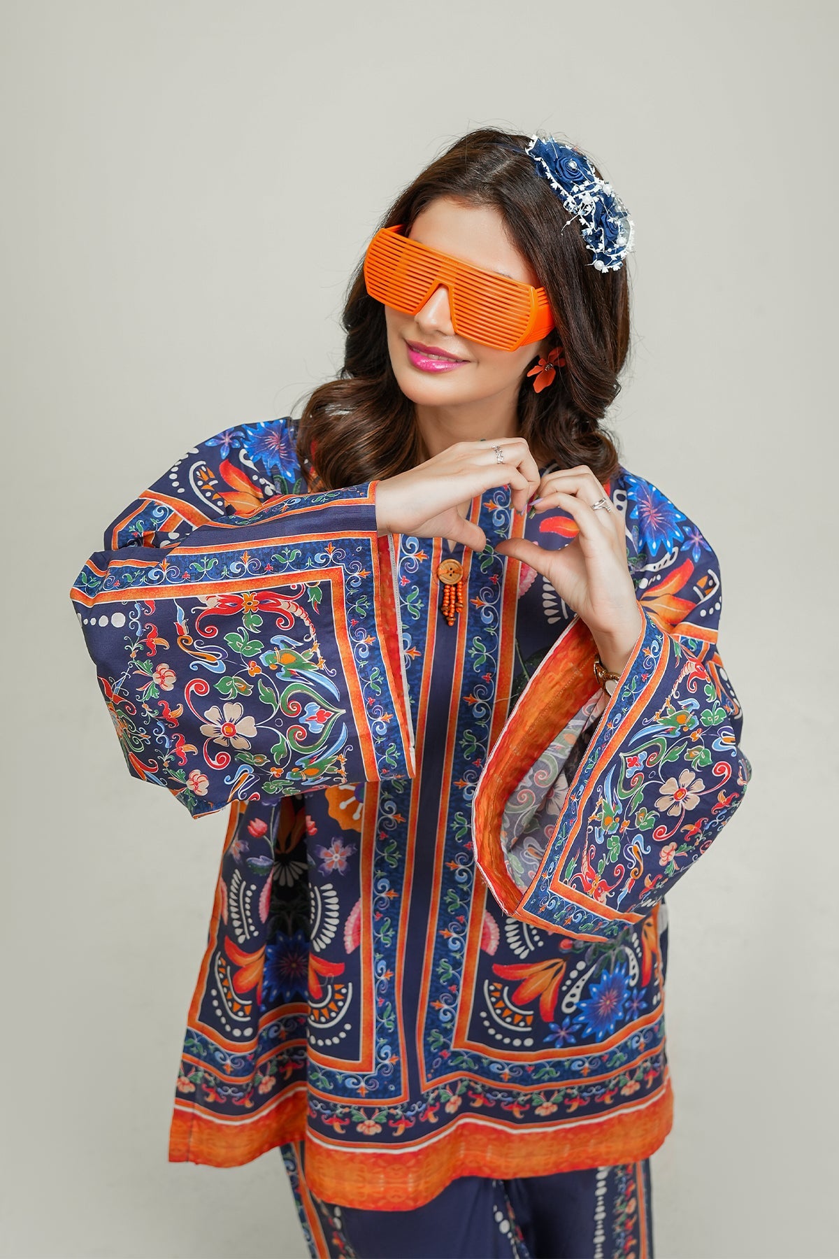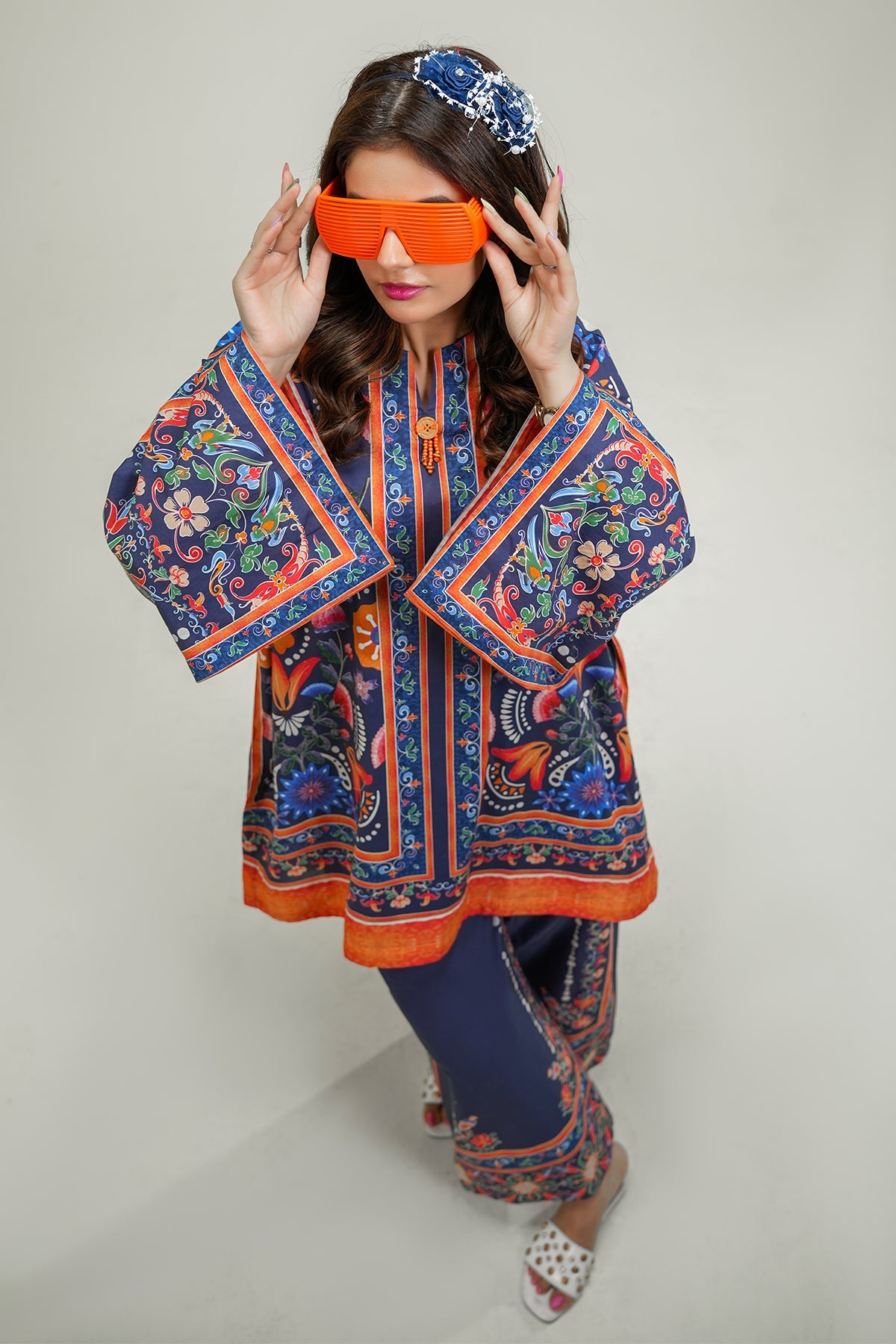 Vibrant navy co-ord set with bold orange accents and intricate floral patterns, perfect for a lively, eye-catching ensemble.