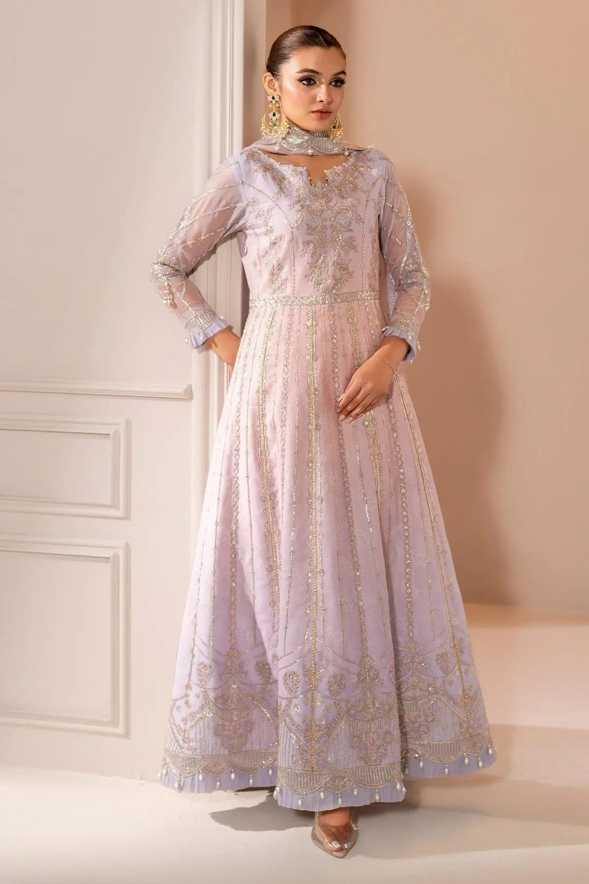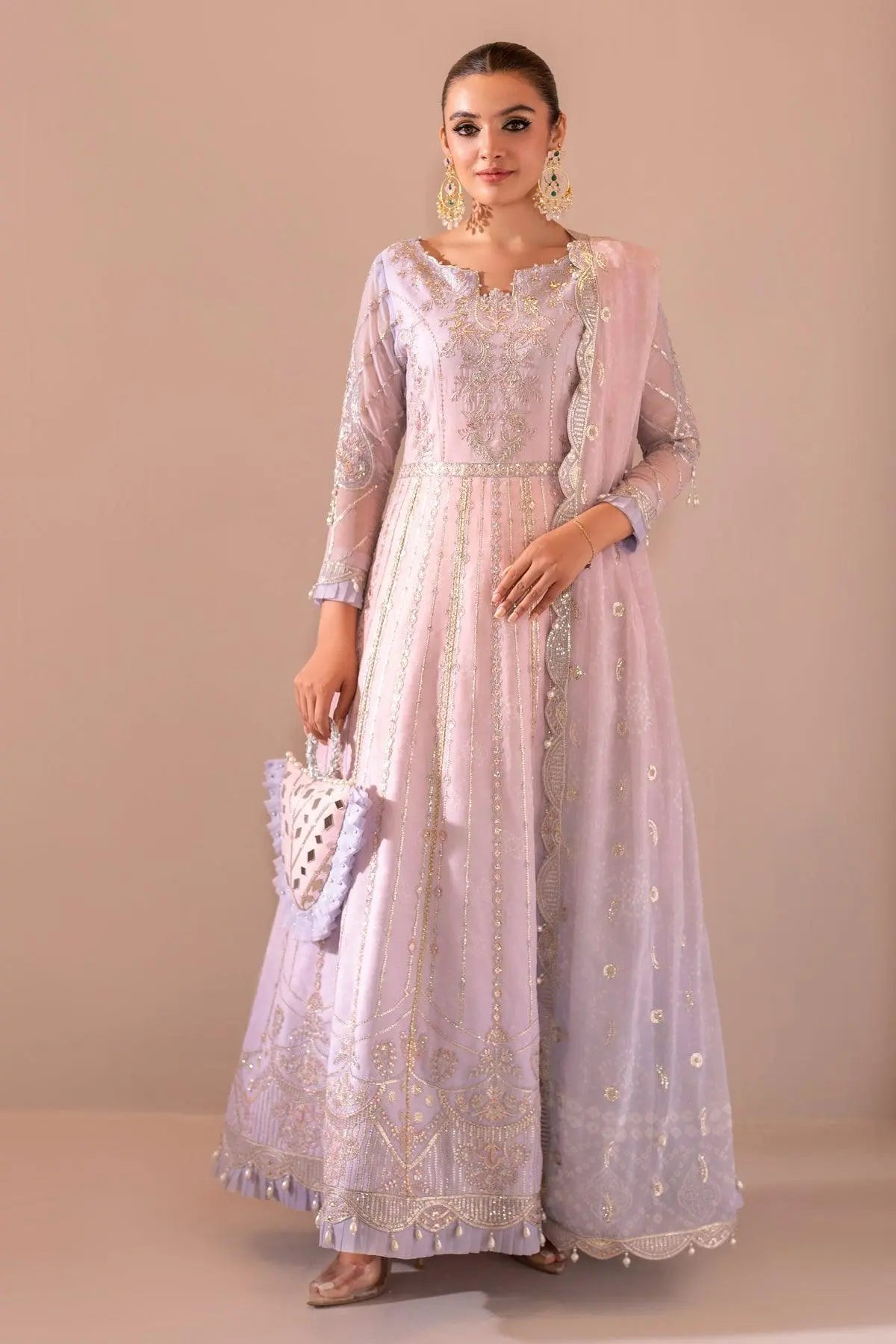 • DESCRIPTION: Parinaaz is a captivating blend of traditional and modern styles, featuring pastel hues in a stunning lilac and powder pink dress. The embroidered bodice and sleeves are beautifully adorned with sequins and embroidery work. This ensemble is paired with a shaded chiffon dupatta, showcasing detailed embroidery, and tonal raw silk trousers.