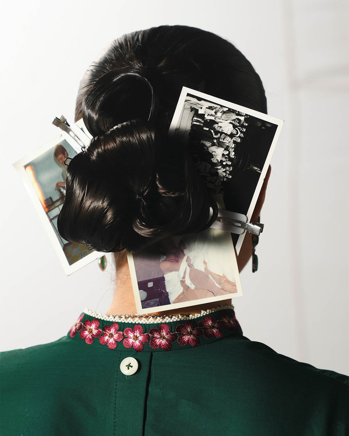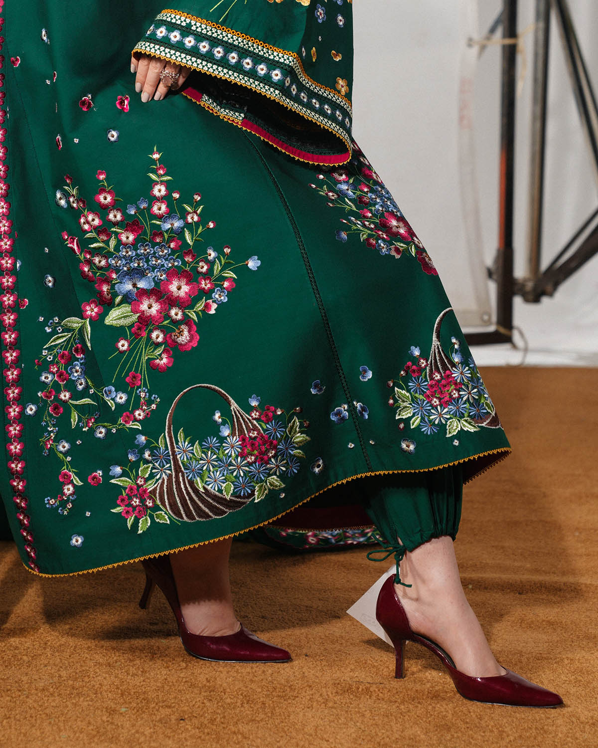 - PRODUCT DESCRIPTION: A long green shirt adorned with multicolor floral embroidery is elegantly complemented by bell sleeves featuring matching embroidered borders, creating a refined and graceful silhouette. The ensemble is paired with green dyed harem pants that offer fluidity and comfort, while a multicolor floral-embroidered chiffon dupatta adds a delicate, sophisticated finishing touch.