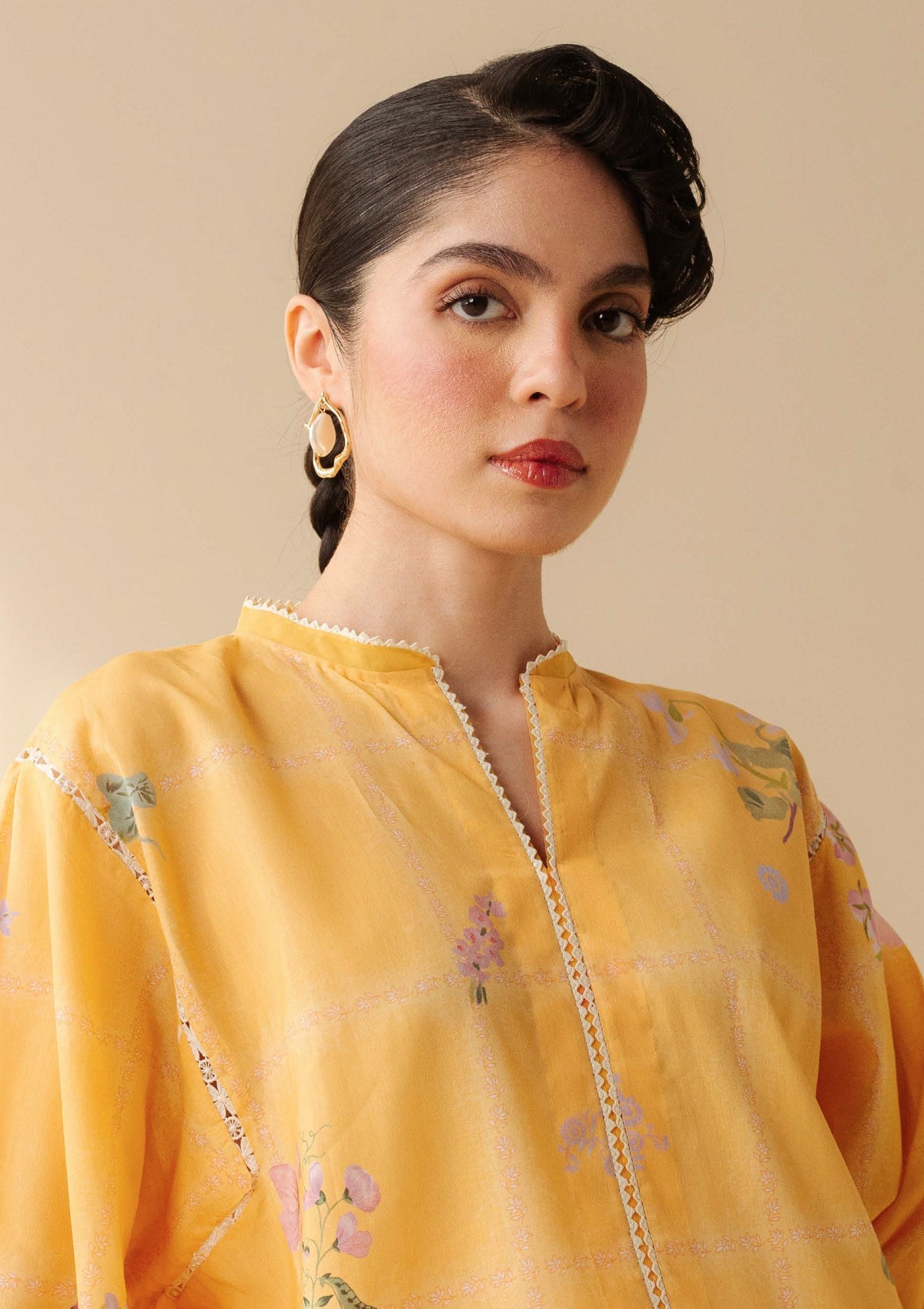 • A playful yellow print shirt teamed with cuffed trousers and a dusty-toned dupatta for an effortlessly chic look.