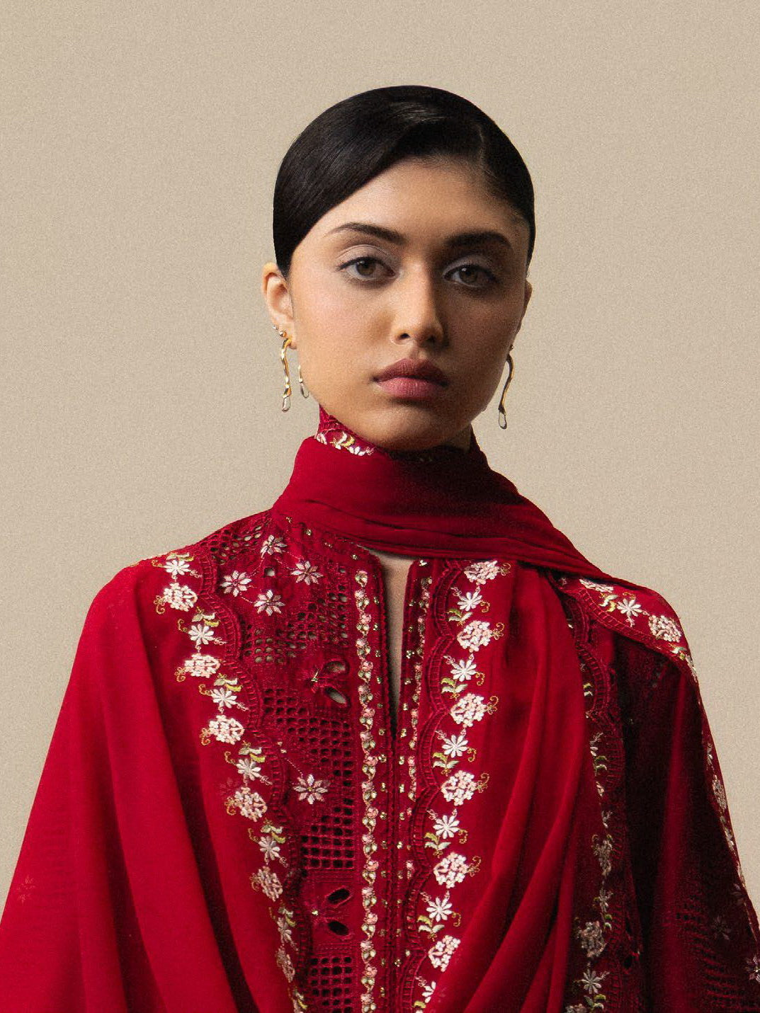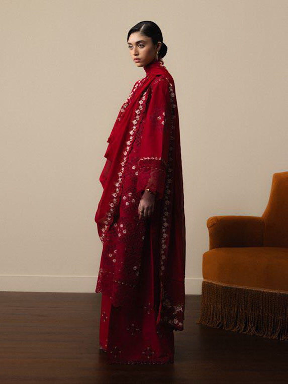 DESCRIPTION: Akari is crafted in striking red with delicate jaali-inspired embroidery, paired with a coordinating embroidered dupatta and finely detailed