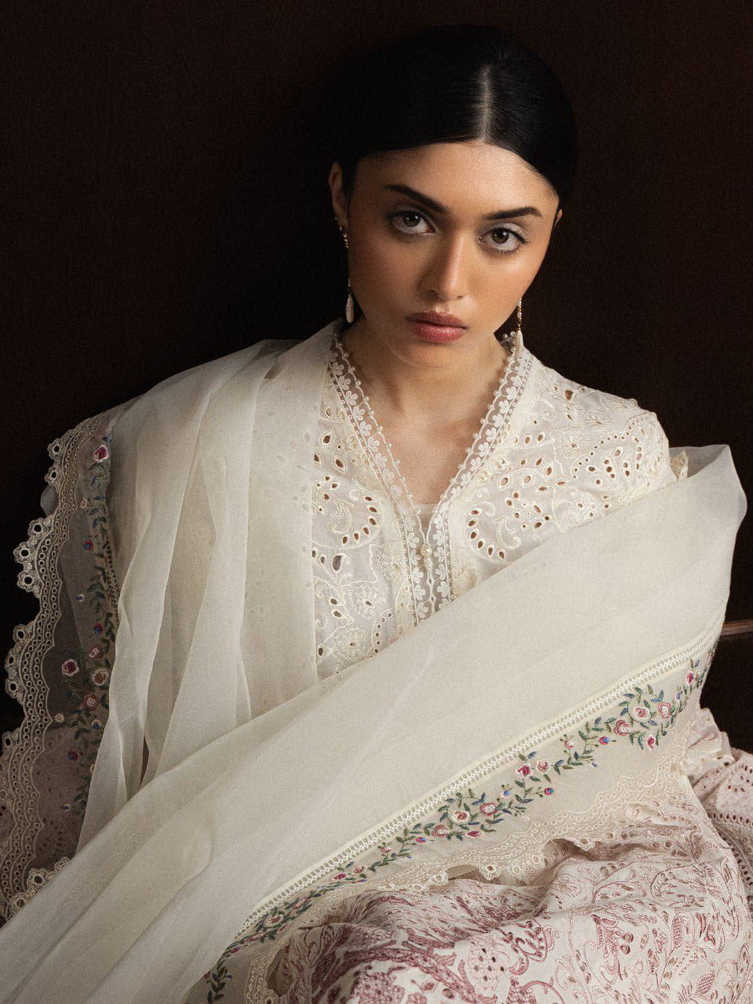 • DESCRIPTION: Hoshimi is bathed in off-white with bold chikankari and lace-inspired embroidery, paired with a coordinating embroidered dupatta and dyed