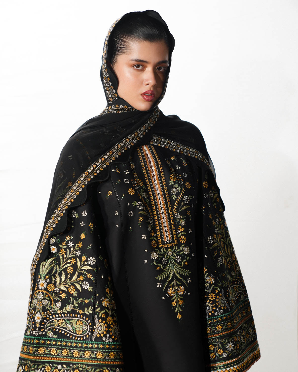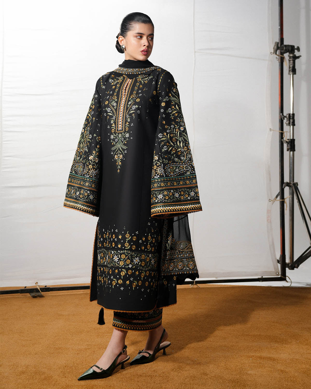 • PRODUCT DESCRIPTION: A striking black long shirt, richly adorned with multicolour traditional embroidery and delicate tilla work, exudes timeless sophistication. The matching bell sleeves, detailed with the same intricate embroidery and tilla, add a graceful, flowing dimension. Paired with black dyed culottes featuring embroidered borders, the ensemble is completed with a multicolour, tilla-embroidered chiffon dupatta, bringing movement, texture, and a refined classical charm to the overall look.