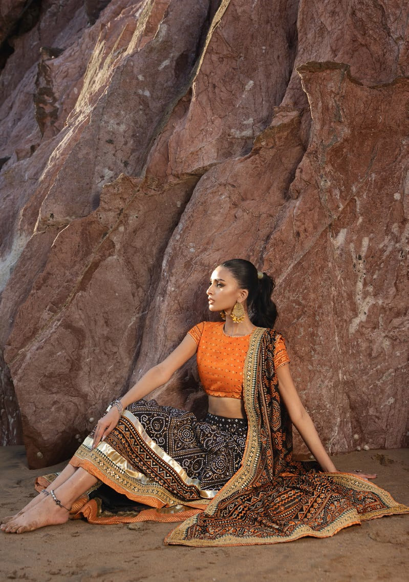 • Gold & Lacquer Printed Raw Silk Lehnga with