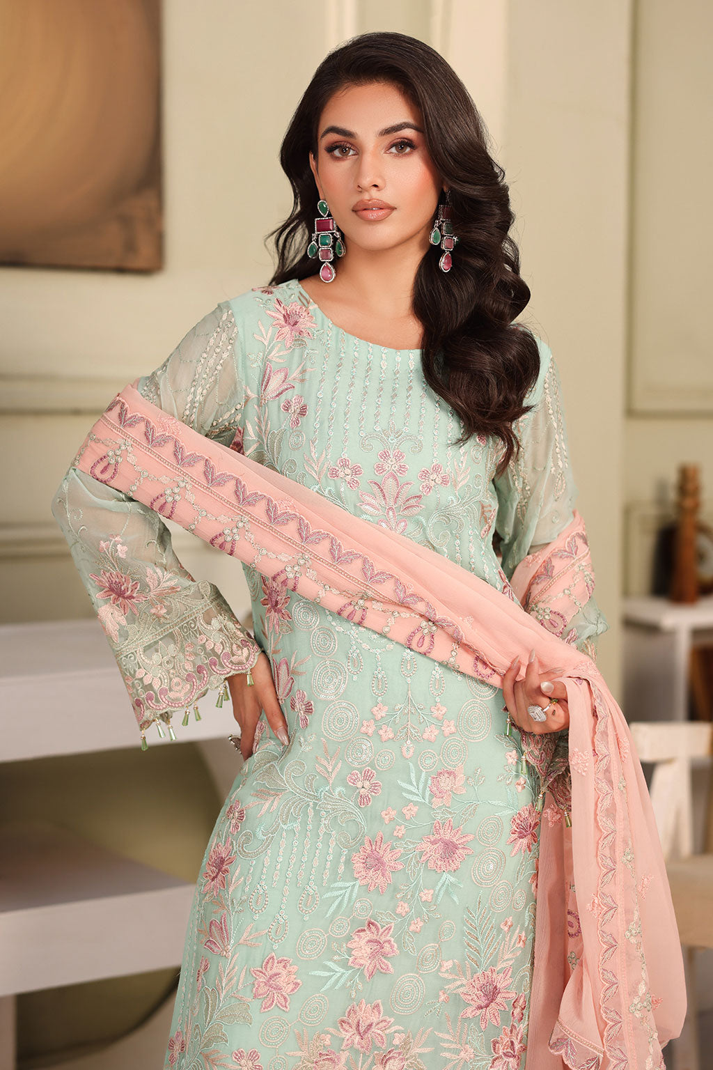 • Chiffon Embroidered Front with Siquence