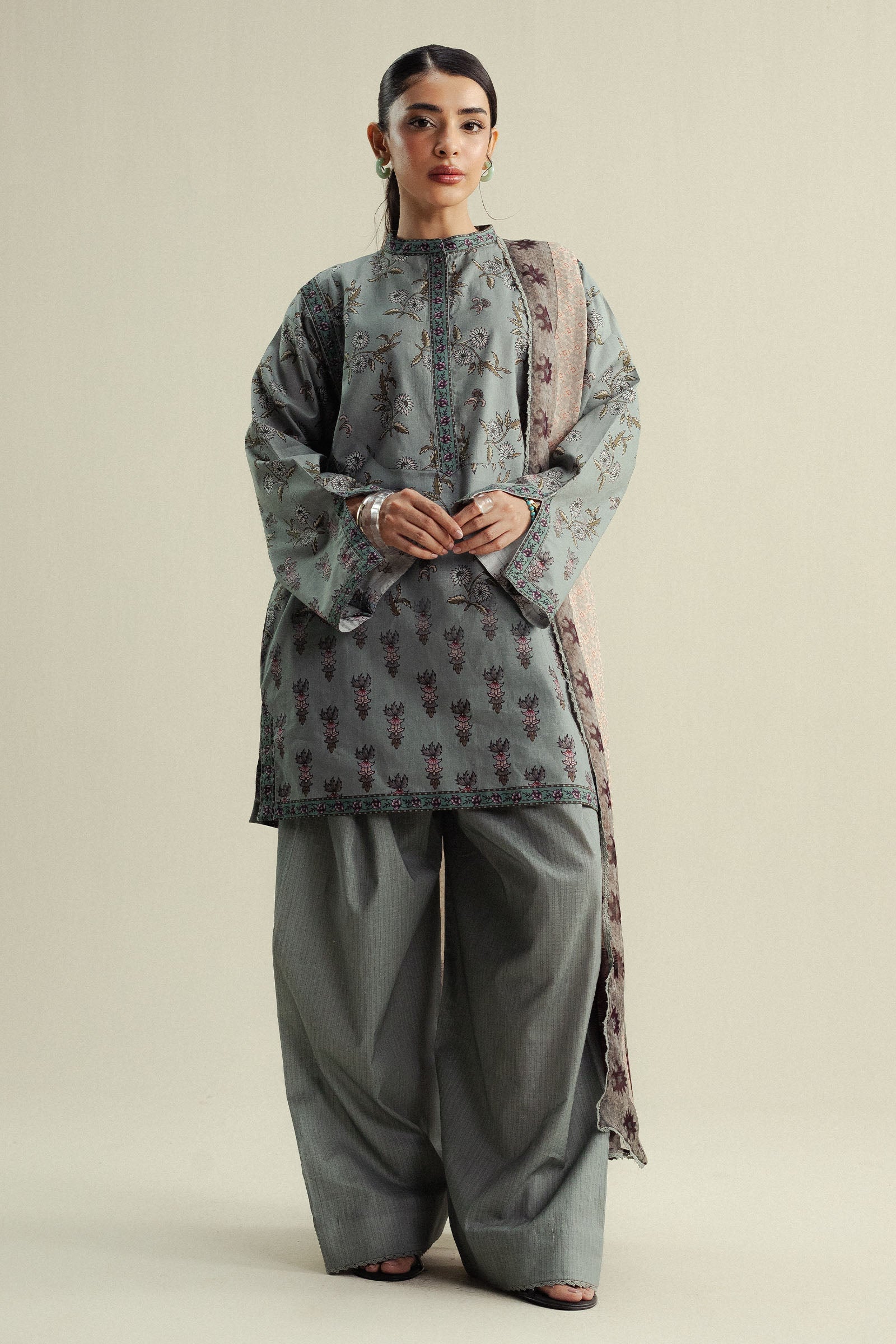 - DESCRIPTION: A soft mist green shirt paired with a plain trouser and a pastel gray dupatta, blending serenity with understated elegance.