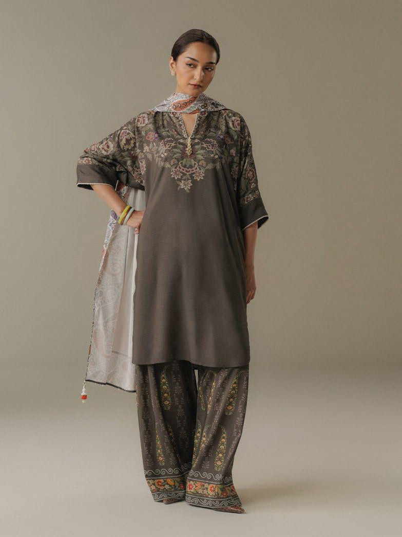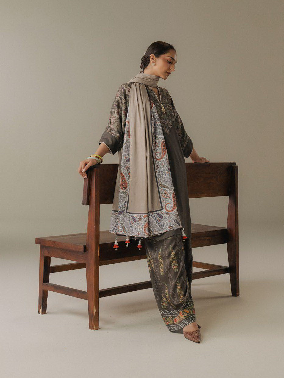 - DESCRIPTION: An umber shirt paired with matching umber trousers featuring intricate block print detailing. The look is complemented by a dusty pink shawl adorned with paisley-inspired motifs, creating a warm and graceful ensemble that beautifully balances earthy richness with soft femininity.