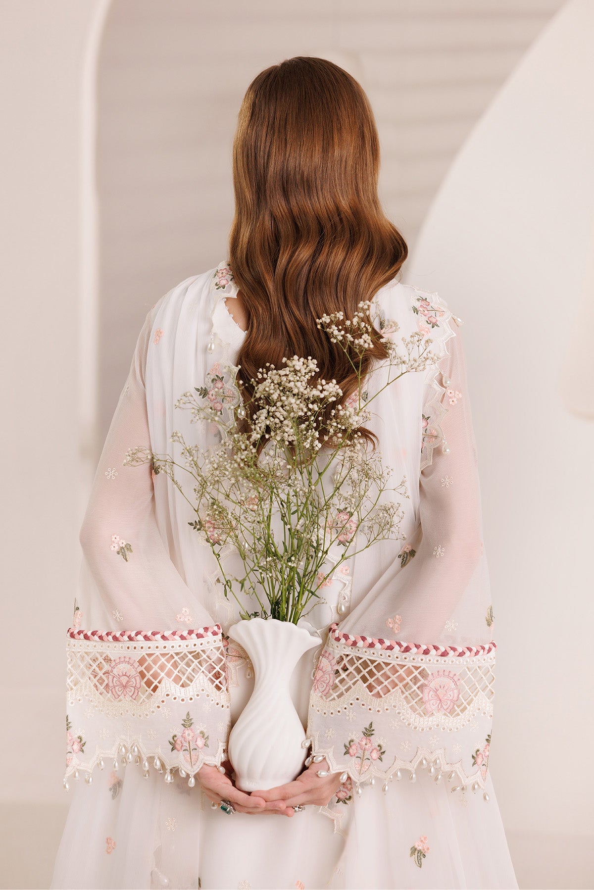 - DESCRIPTION: This soft white chiffon shirt features delicate floral embroidery and intricate threadwork, adding a unique and refined touch. Paired with raw silk trousers and an embroidered chiffon dupatta, the ensemble effortlessly blends elegance with cultural charm.