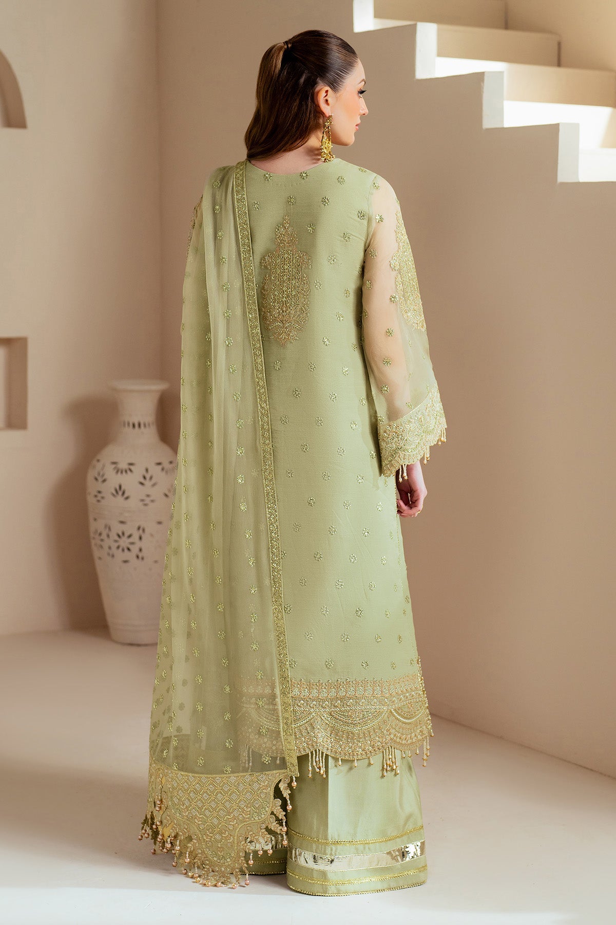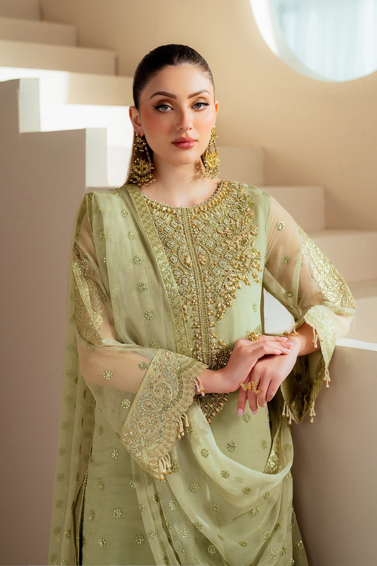 • DESCRIPTION: The "Alish" ensemble showcases a stunning mint green shirt, lavishly embroidered and expertly crafted from soft bamber chiffon. Intricate hand embellishments, including beads, pearls, and sequins, enhance its delicate design. The neckline, adorned with heavy embroidery, and the exquisitely designed sleeves add to the opulence of the piece. Completing the look is a flowing chiffon dupatta and raw silk trousers, imparting an ethereal and enchanting touch to this festive ensemble.