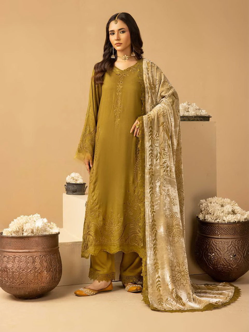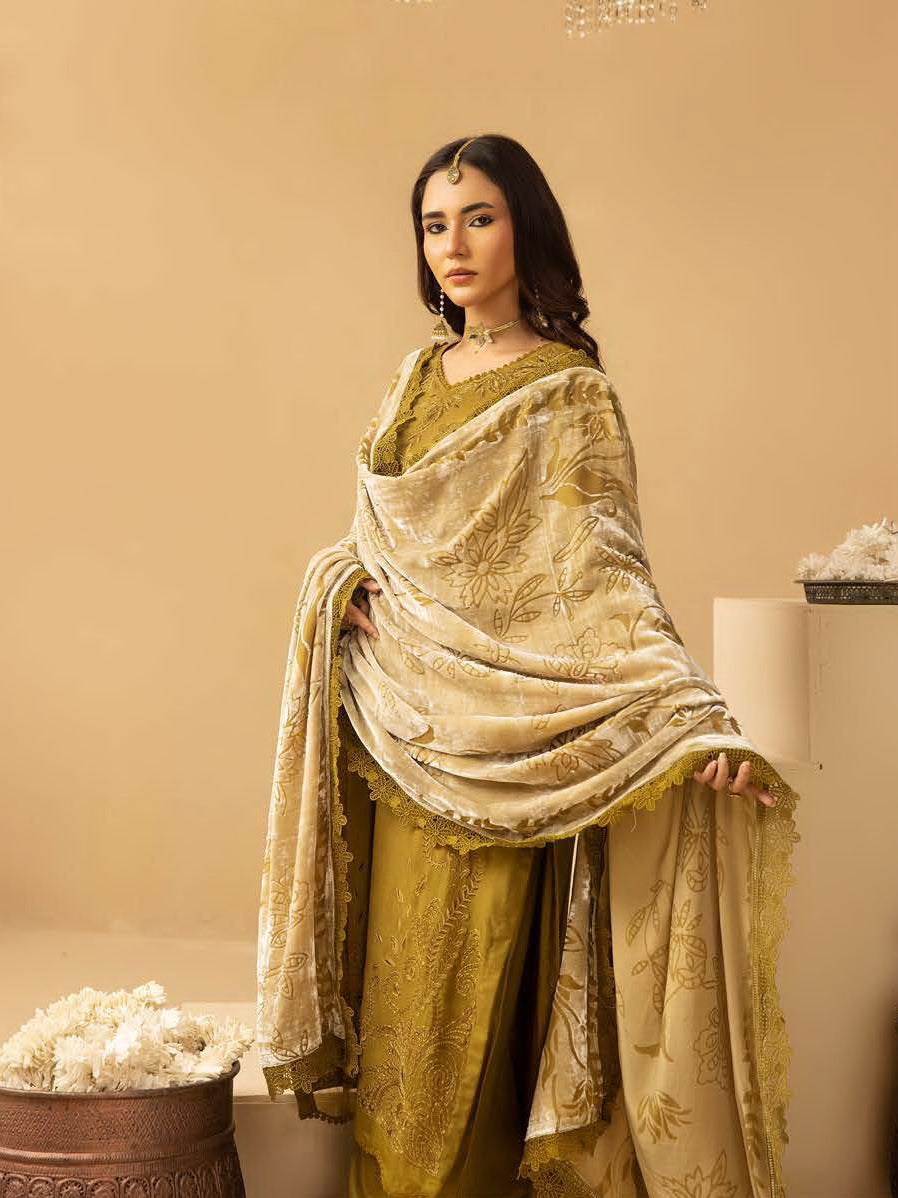 • Embroidered Leather Peach Collection With Velvet Palachi Shawl.