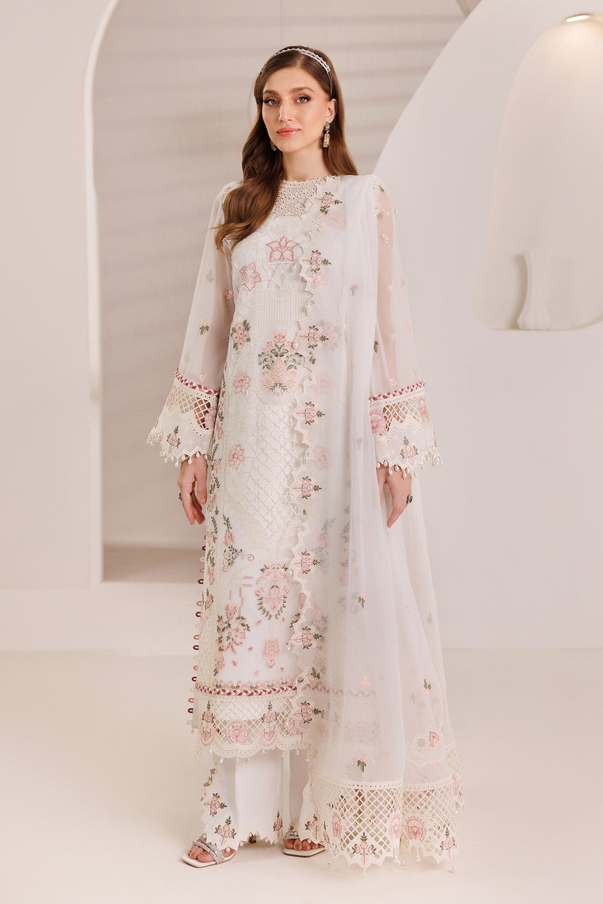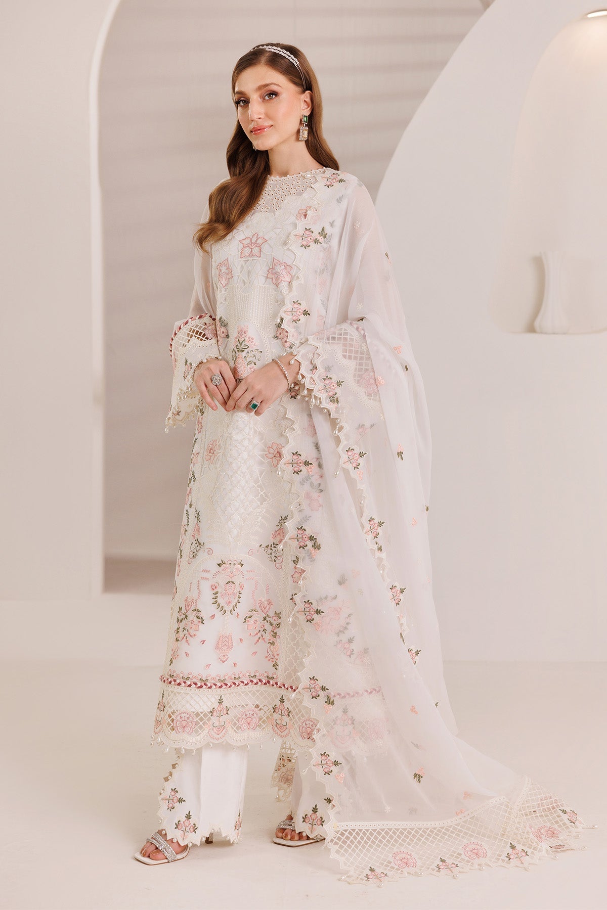 - DESCRIPTION: This soft white chiffon shirt features delicate floral embroidery and intricate threadwork, adding a unique and refined touch. Paired with raw silk trousers and an embroidered chiffon dupatta, the ensemble effortlessly blends elegance with cultural charm.