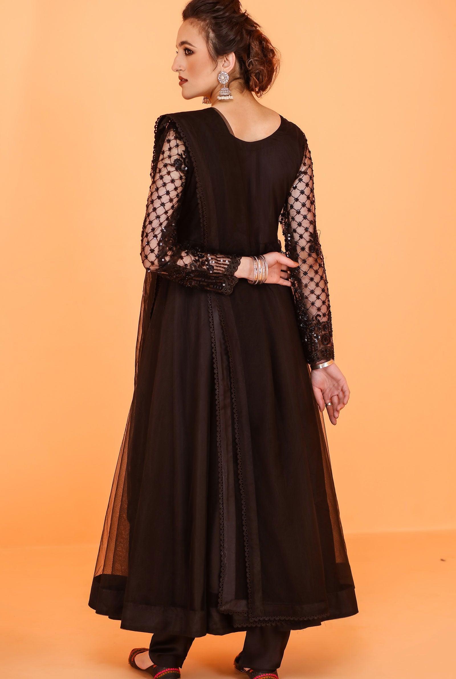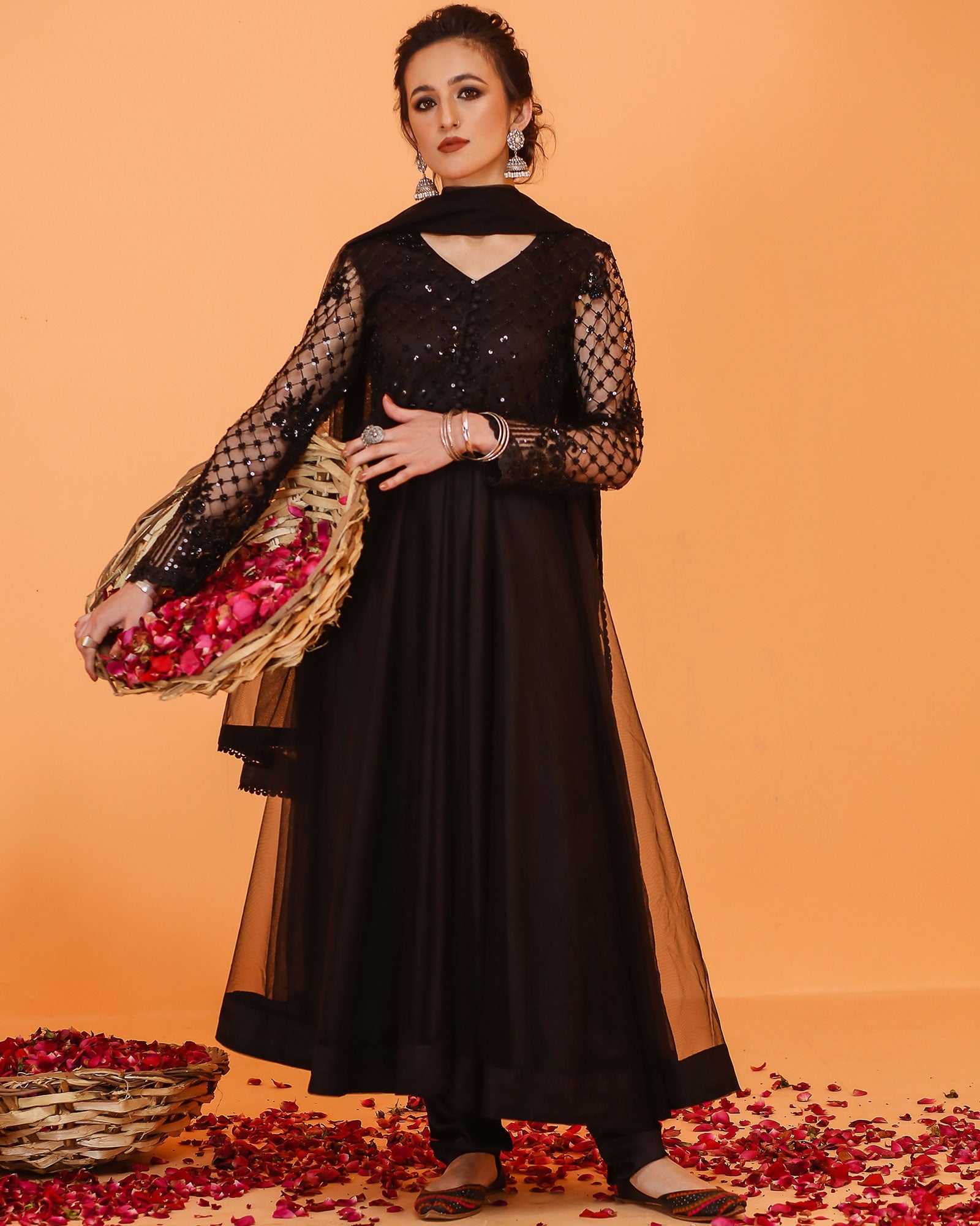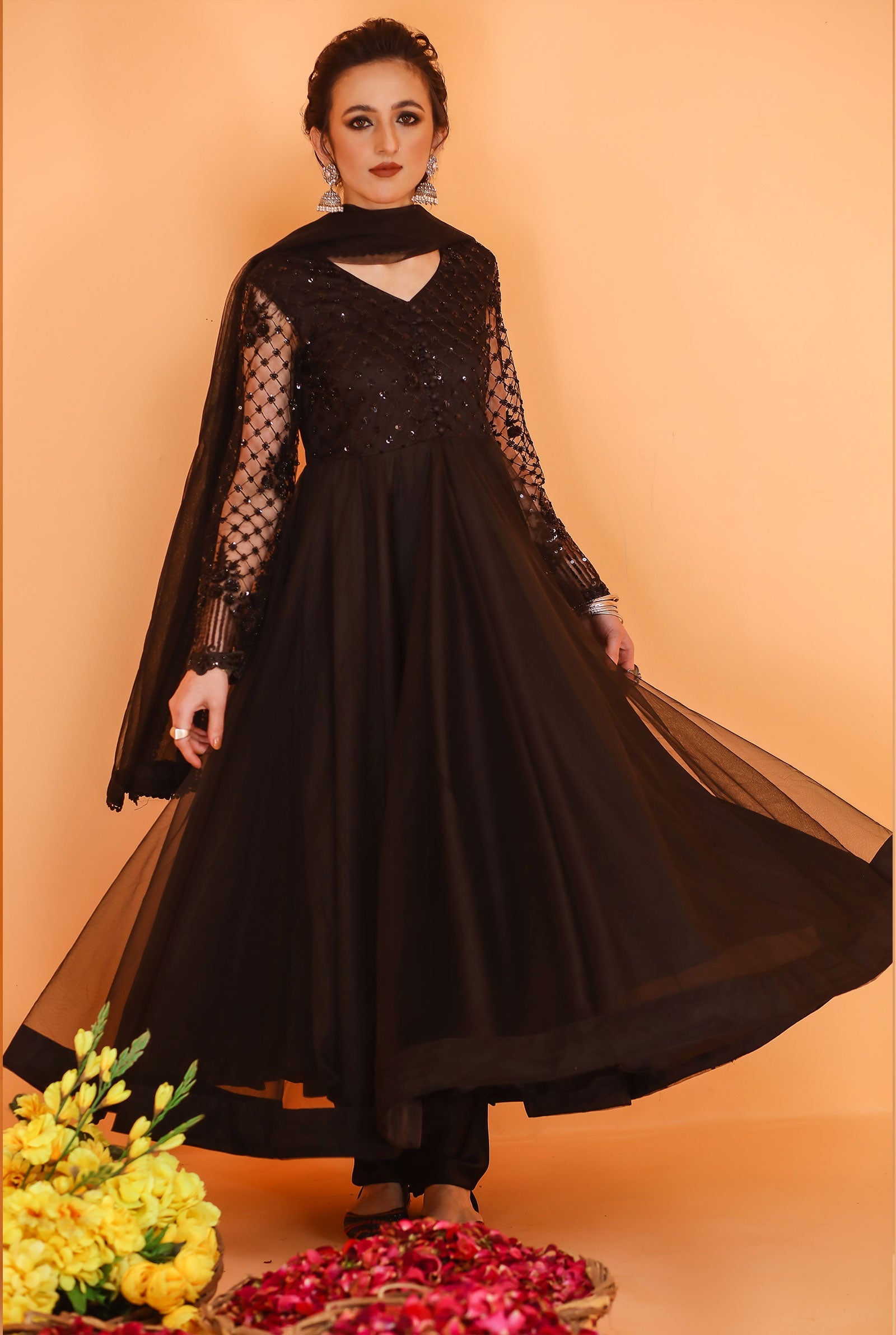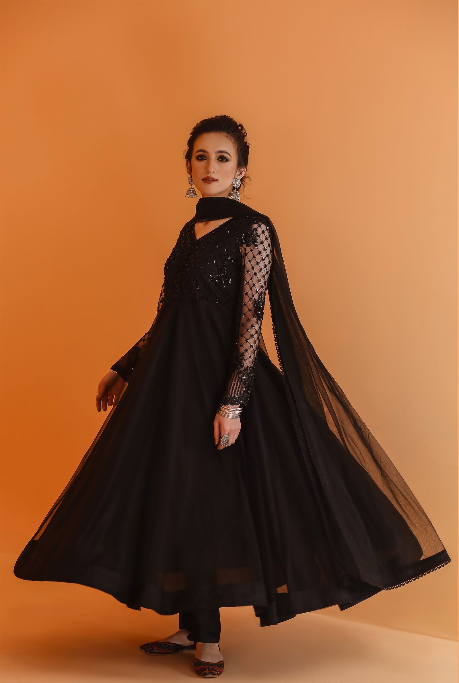 Features our signature cutout neckline with delicate pearl, Sitara, and black tilla embroidery on the front and sequins. And with the umbrella cut long frock paired with black churidar pajama and an organza net dupatta with an inspiring design is the ultimate look for all evening party wear.