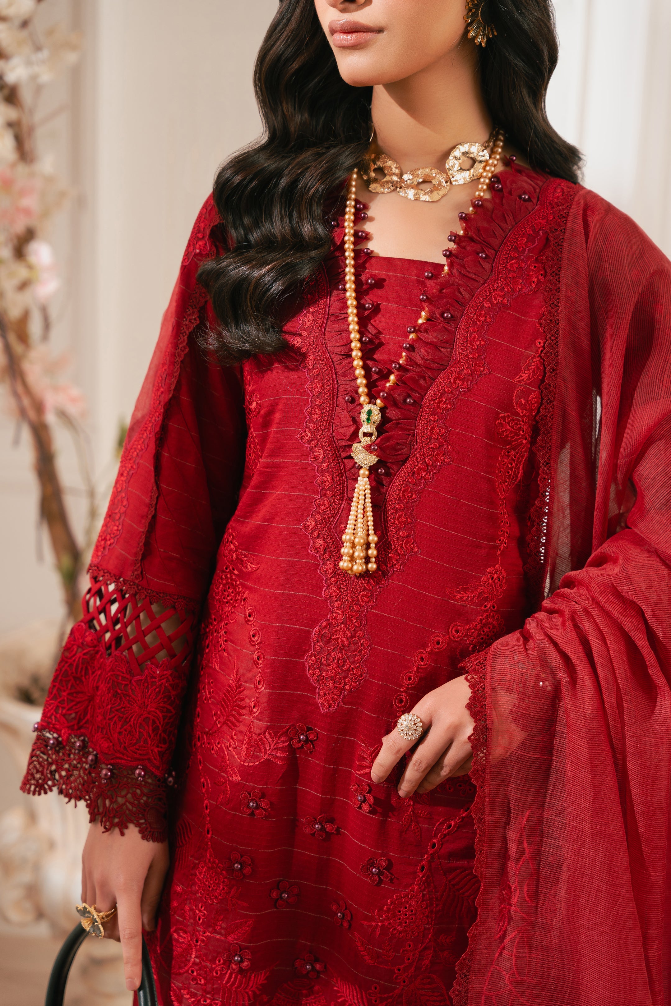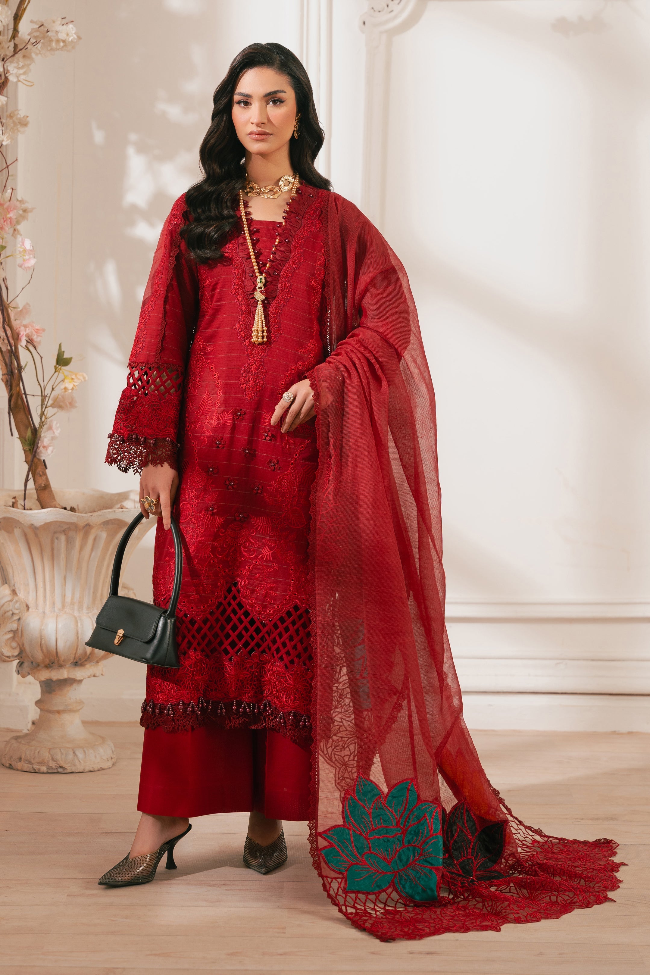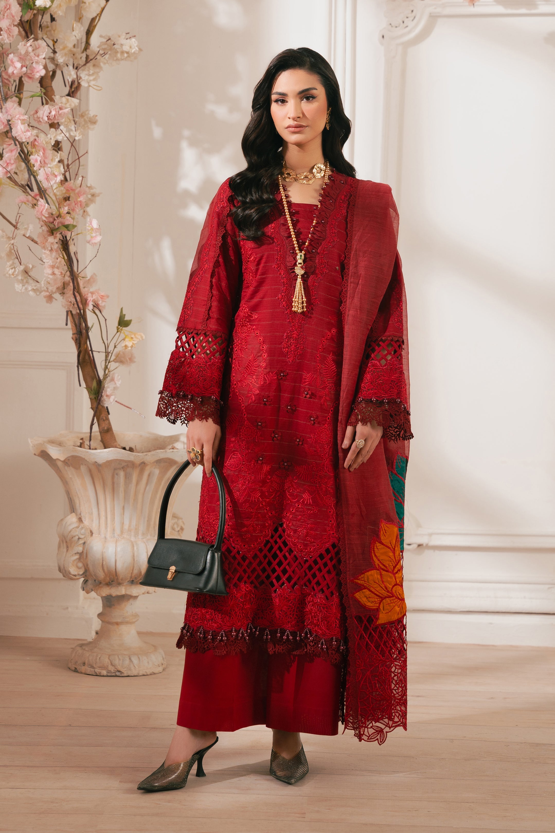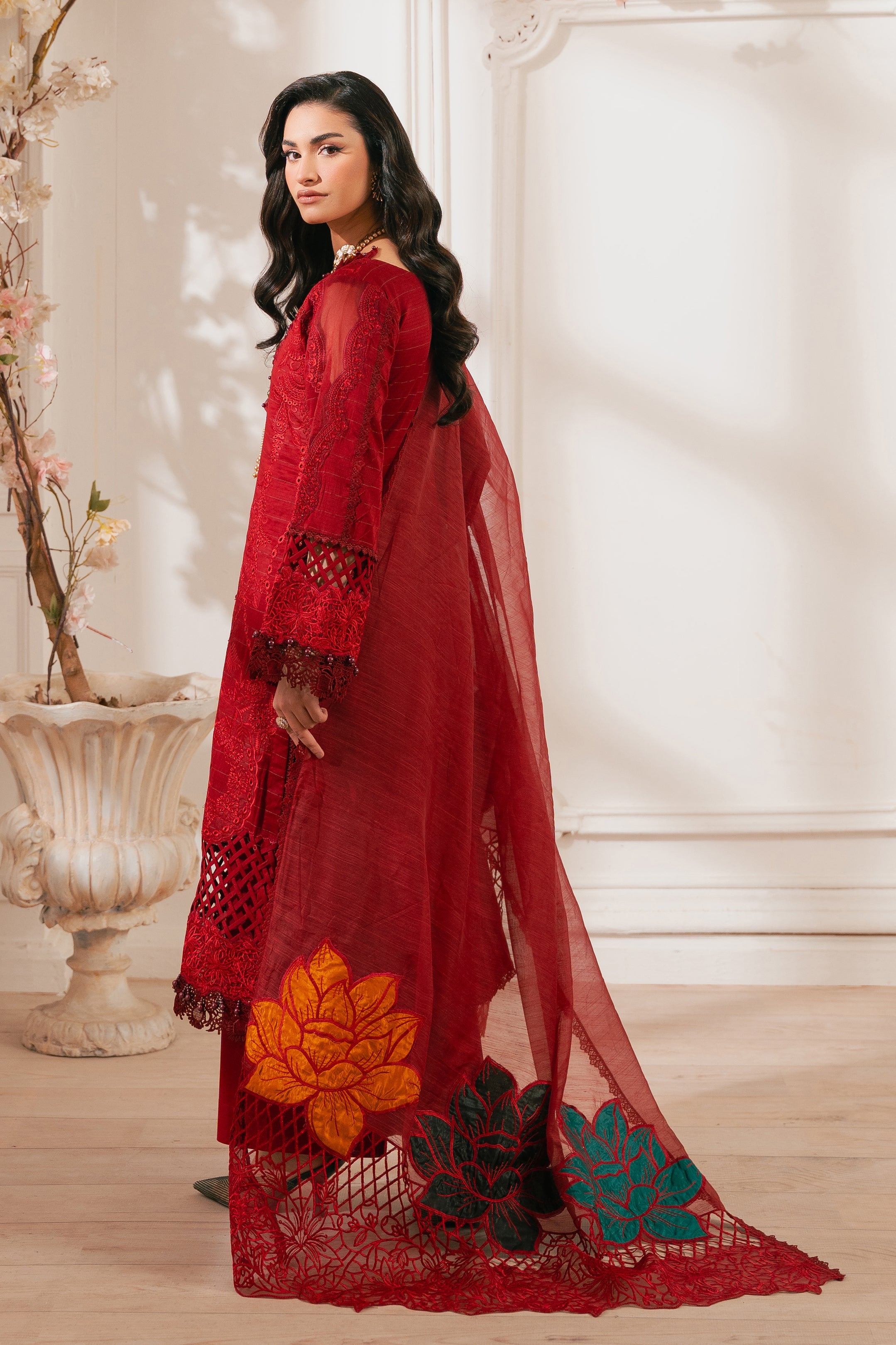 - DESCRIPTION: This stunning radishroon ensemble showcases our signature delicate embroidery with cutout details on the front. The intricate floral patterns create a classic and elegant look, paired with matching pants featuring heavy floral motifs. Completing the outfit is a beautiful cotton net dupatta adorned with exquisite embroidery, paying homage to the timeless beauty of florals.
