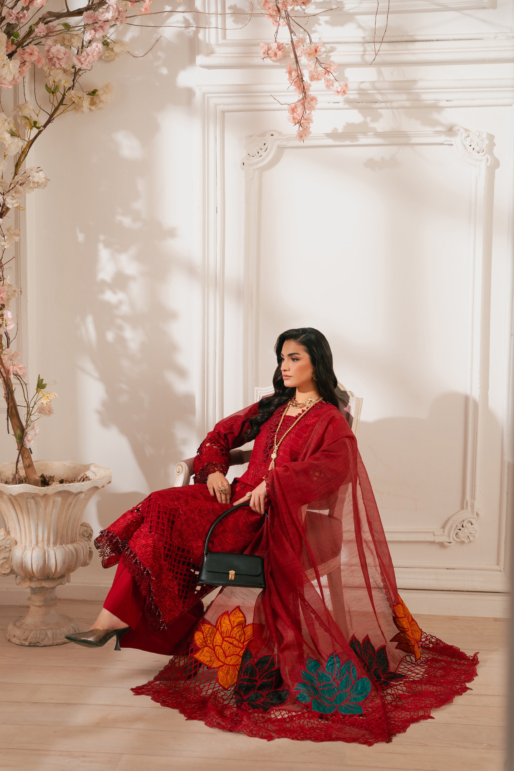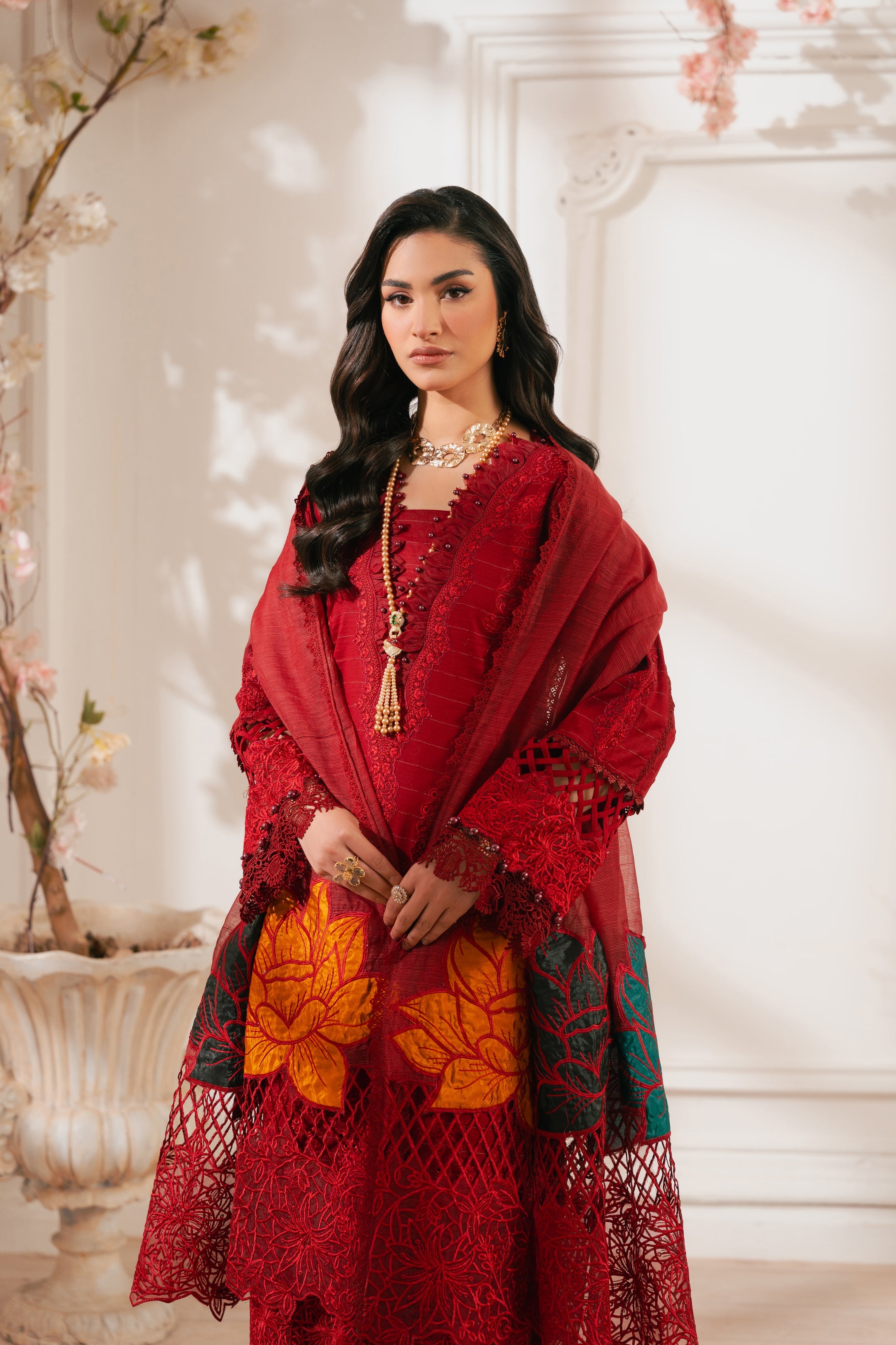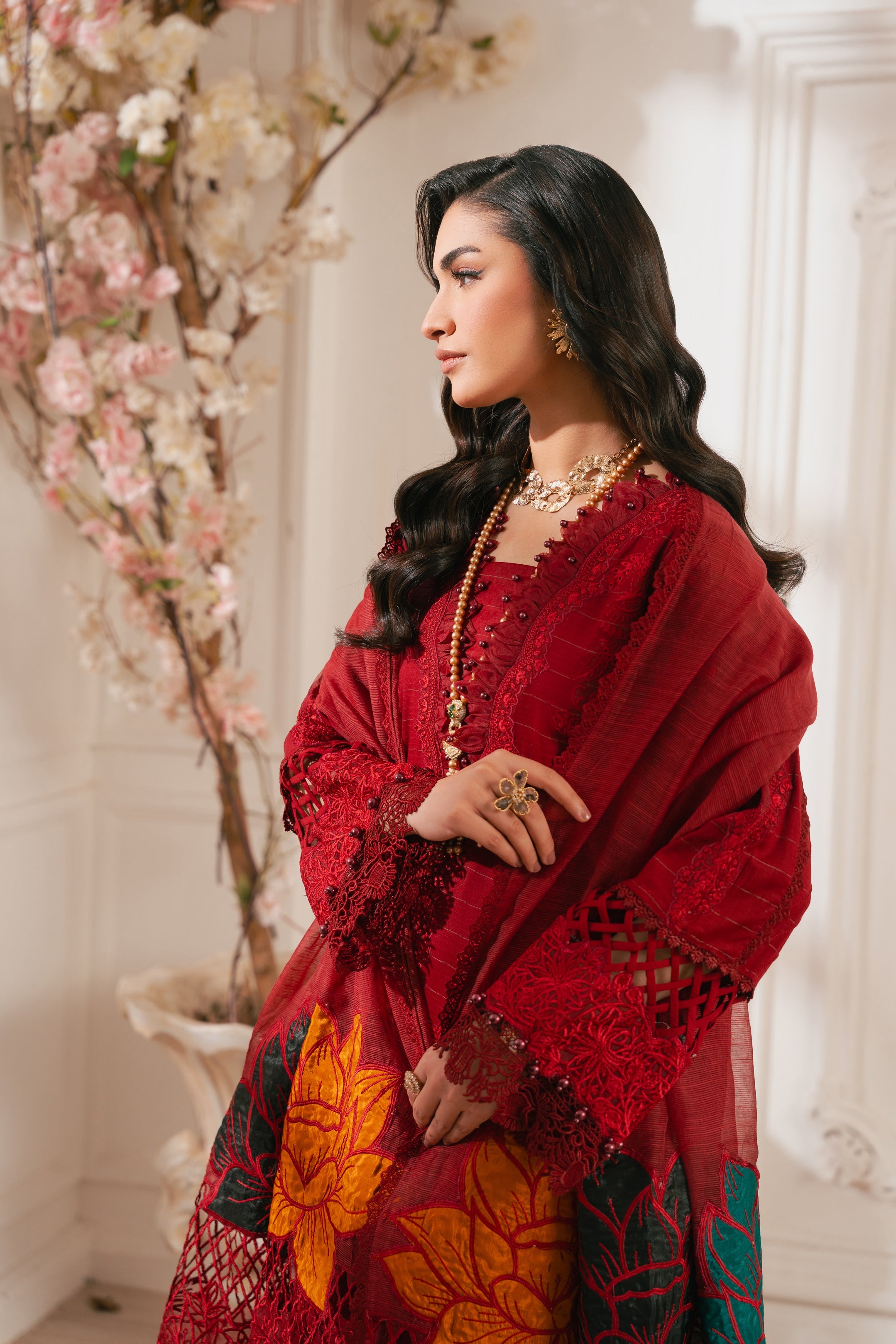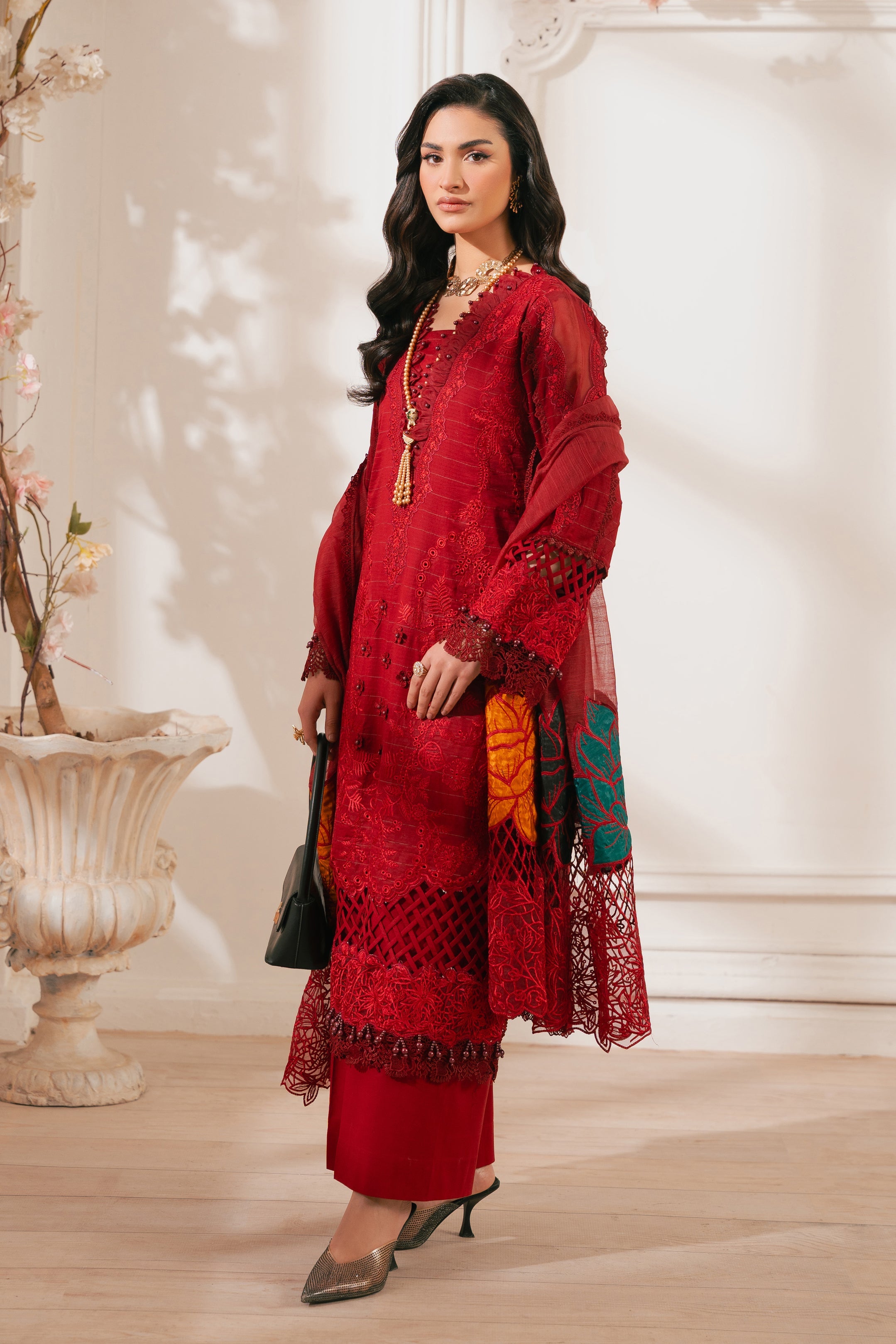 - DESCRIPTION: This stunning radishroon ensemble showcases our signature delicate embroidery with cutout details on the front. The intricate floral patterns create a classic and elegant look, paired with matching pants featuring heavy floral motifs. Completing the outfit is a beautiful cotton net dupatta adorned with exquisite embroidery, paying homage to the timeless beauty of florals.