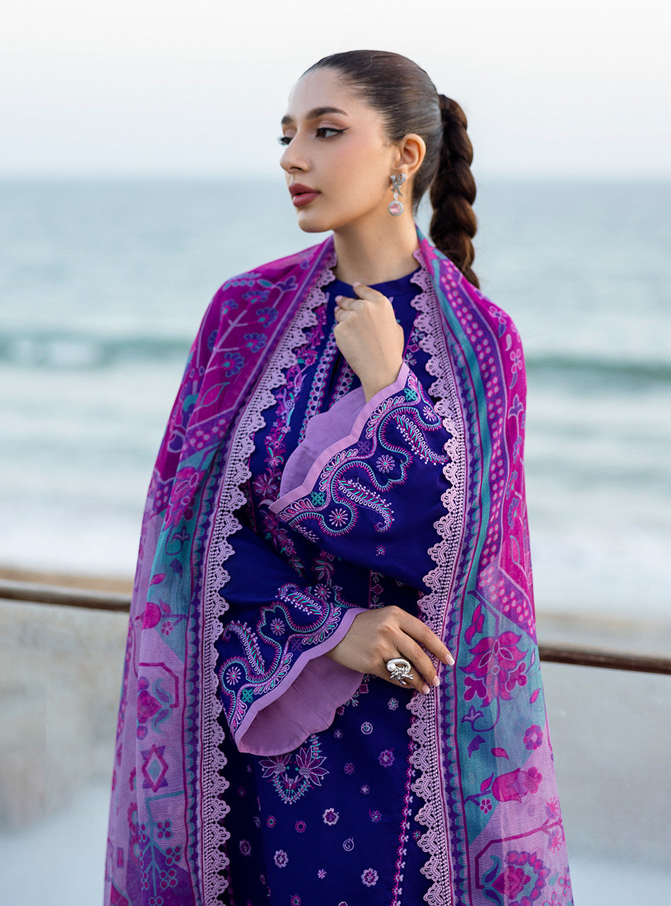 • DESCRIPTION: This violet 3-piece Lawn suit features rich and intricate embroidery across the front, neckline, sleeves, and hem. It is paired with a contrasting printed dupatta showcasing detailed patterns in coordinating tones of purple and other colors. The set is completed with plain matching trousers.
