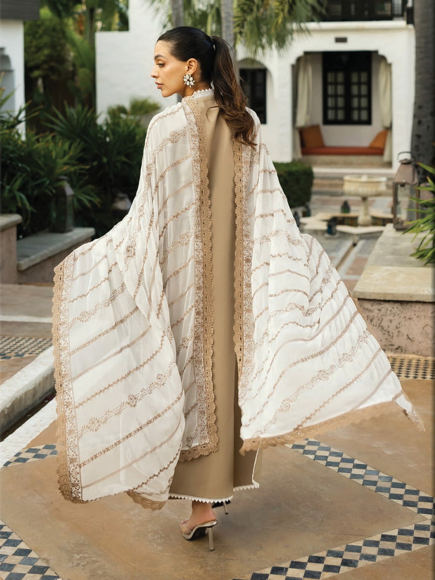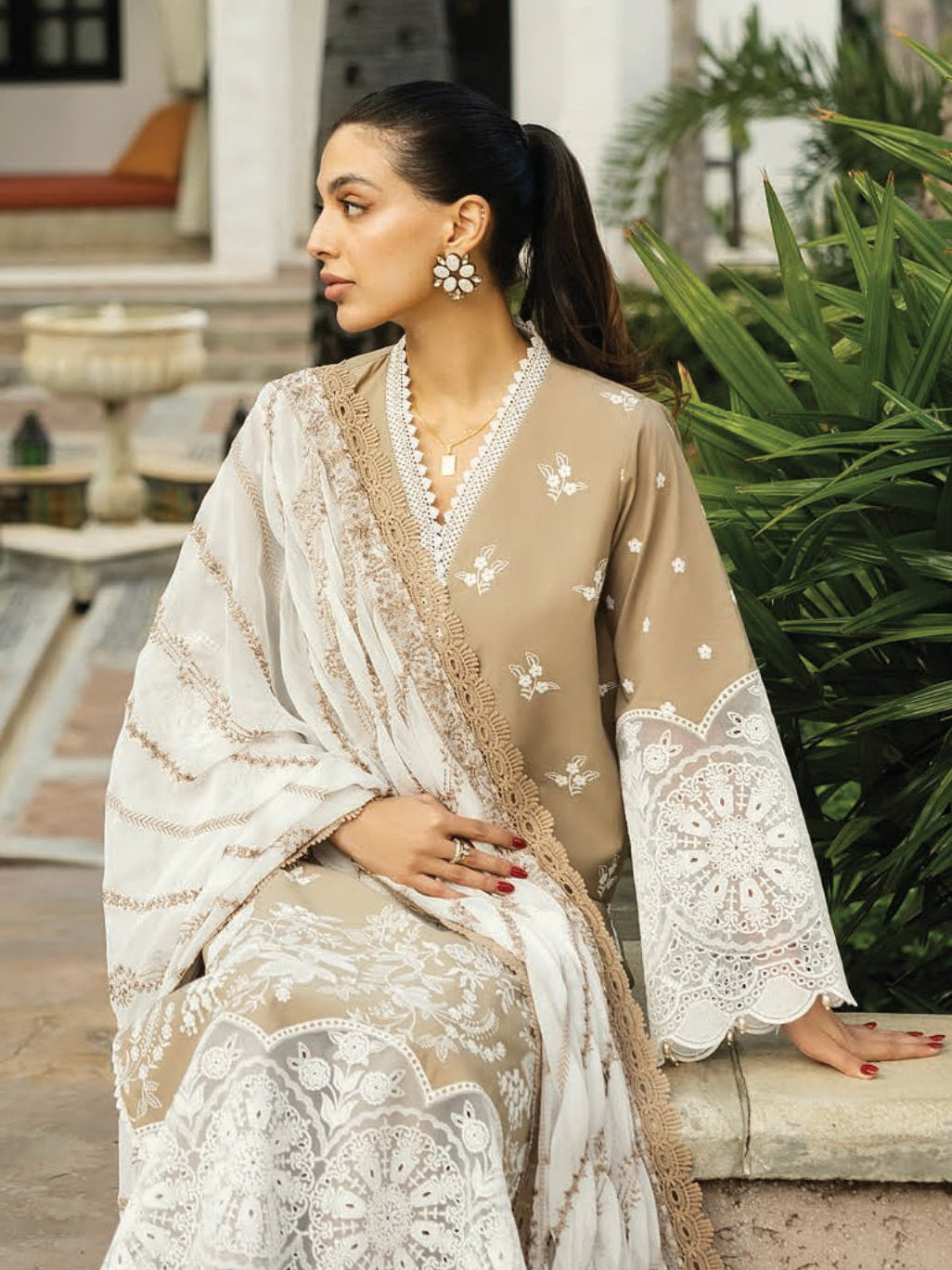 - DESCRIPTION: This elegant beige 3-piece suit showcases the timeless beauty of chikankari embroidery. The intricate white work delicately adorns the shirt, creating a captivating contrast against the subtle beige backdrop. The detailed patterns highlight the neckline, sleeves, and hemline, adding a touch of traditional charm. The accompanying chiffon dupatta features complementary embroidery, enhancing the overall sophistication of the ensemble.