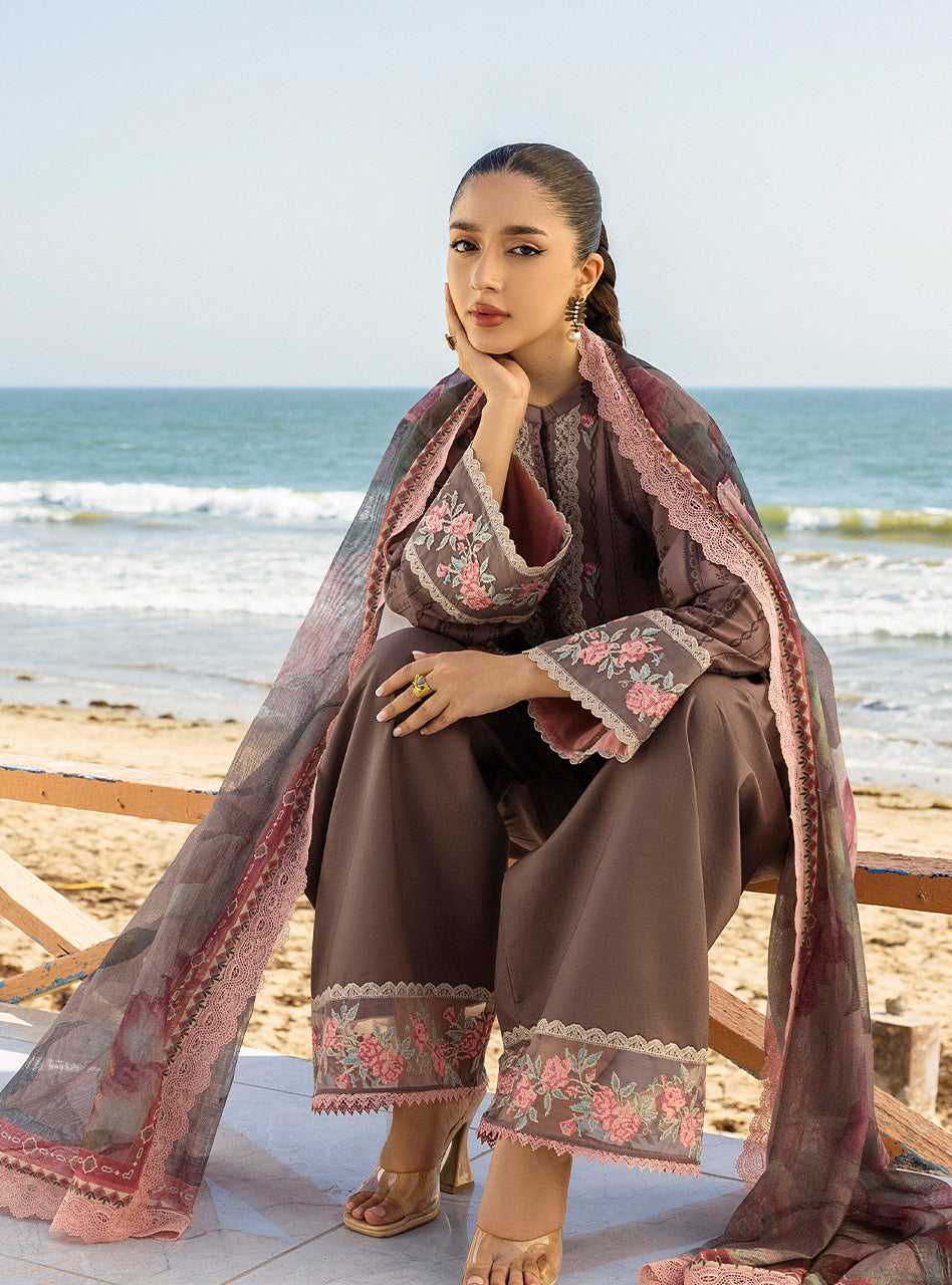 - DESCRIPTION: This beautiful brown 3-piece printed Lawn suit features a sophisticated vertical print and delicate floral embroidery all over with embroidered neckline, sleeves, and daman border on organza. It is paired with a lovely matching dupatta adorned with a large, artistic floral print. The set is finished with simple matching trousers.