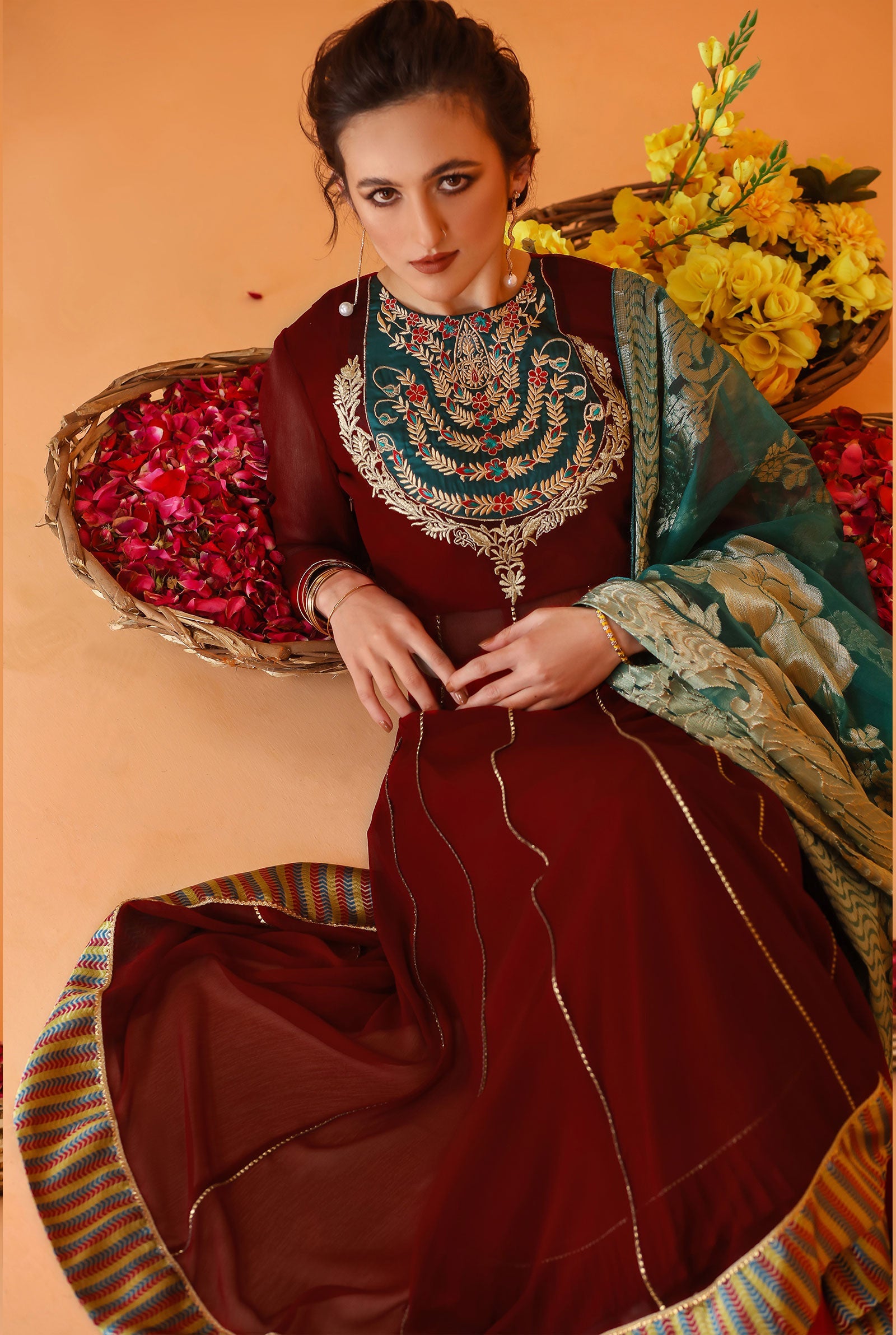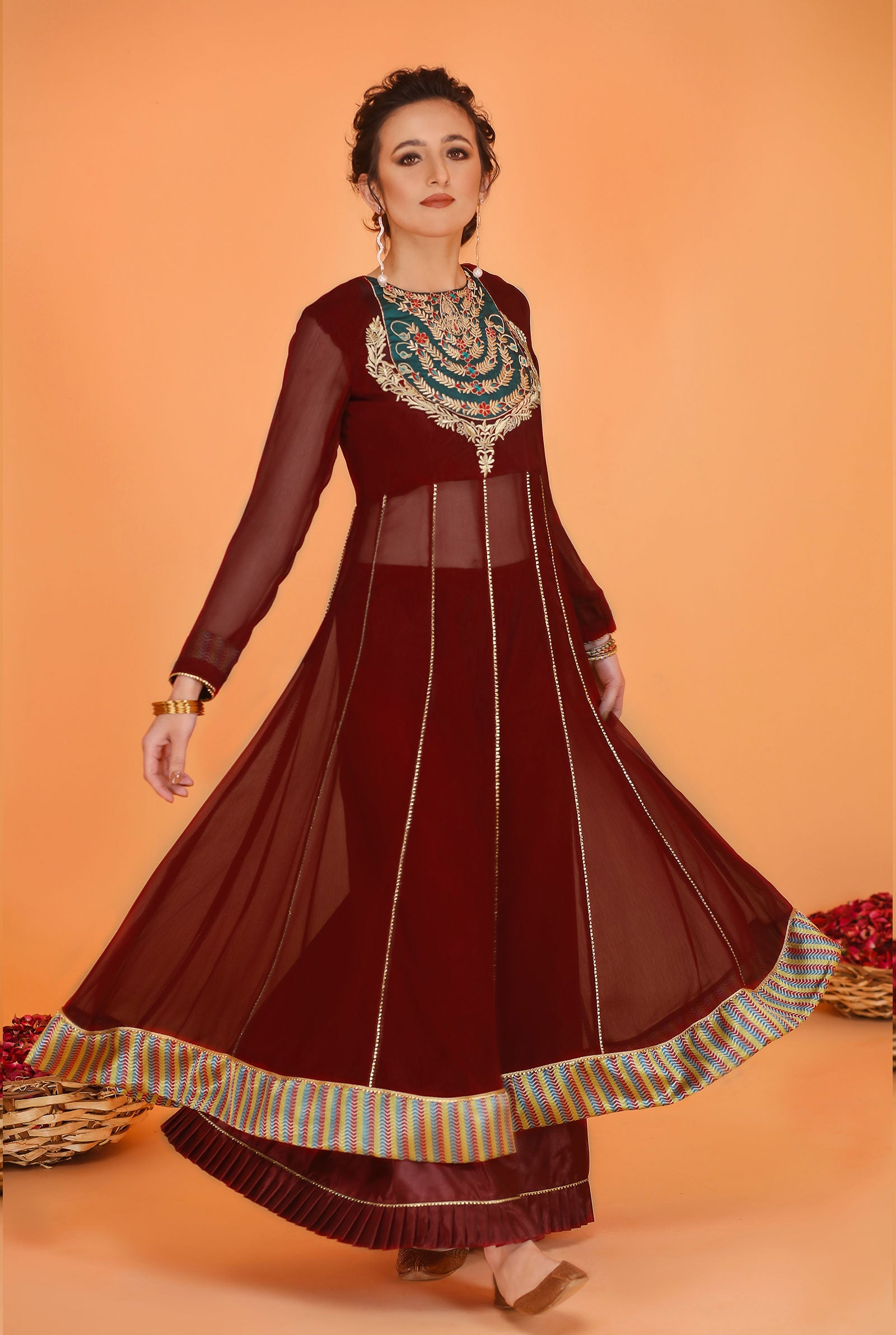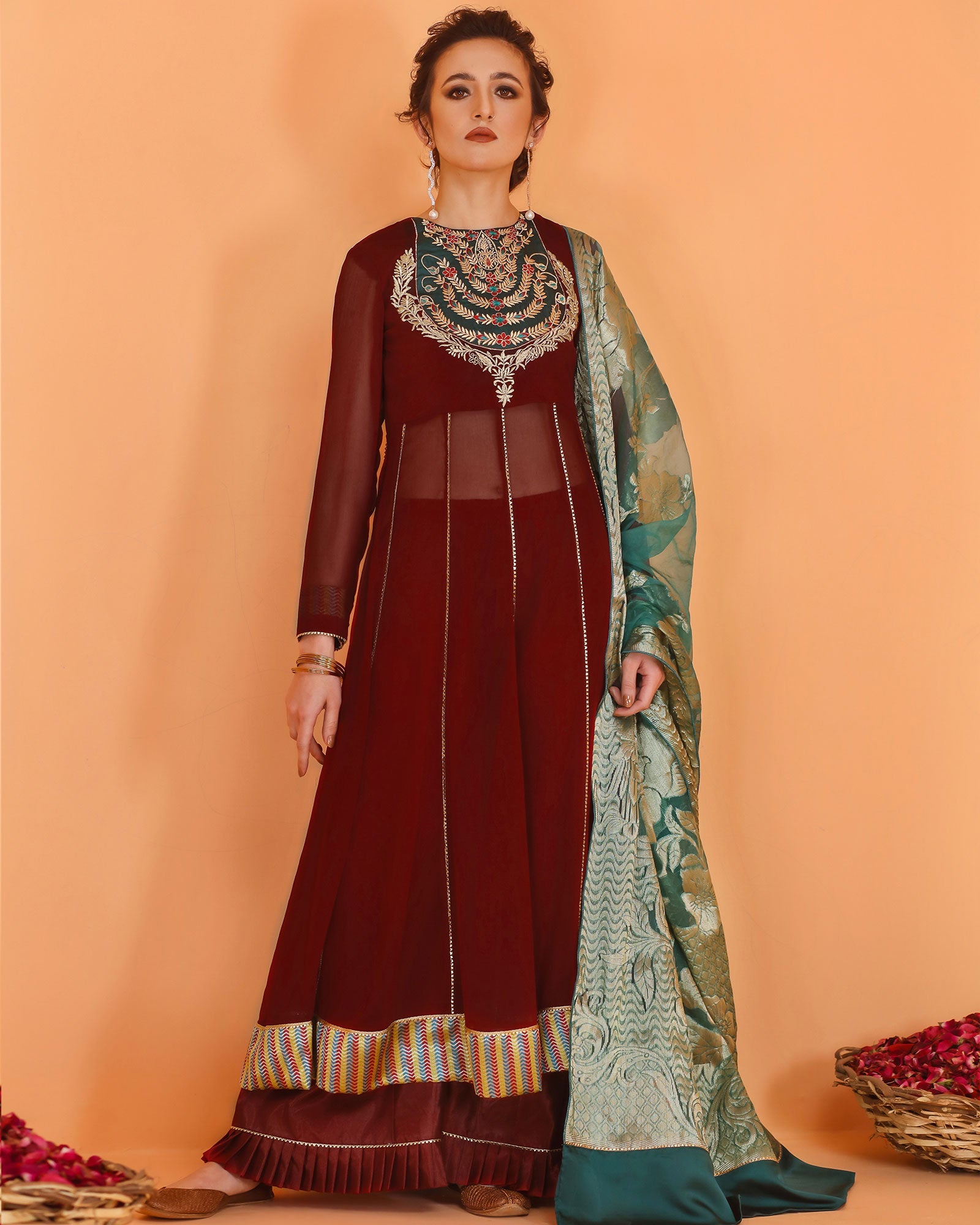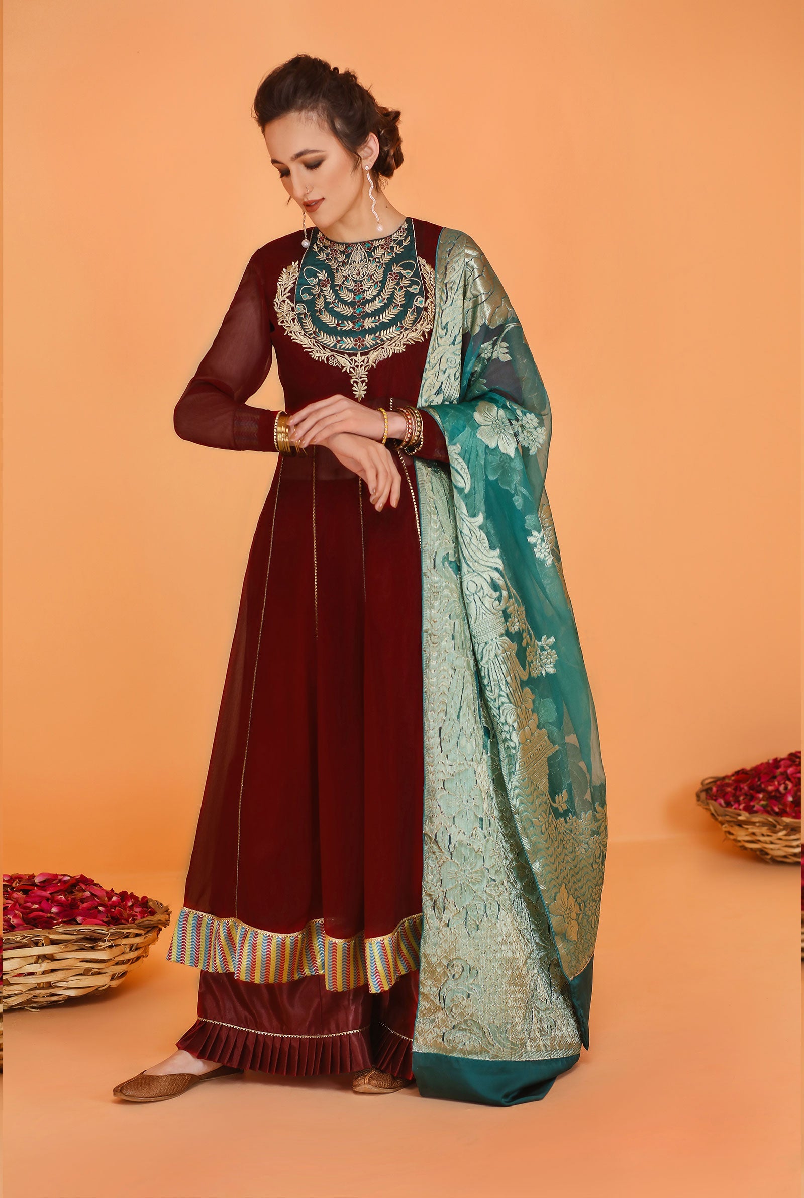 Our pure chiffon comes with a long frock has neckline embroidery with a combination of pastel colors and is embellished with laces and patches all around the damn. And paired with the organza dupatta with satin pallu giving it a complete fashion look.