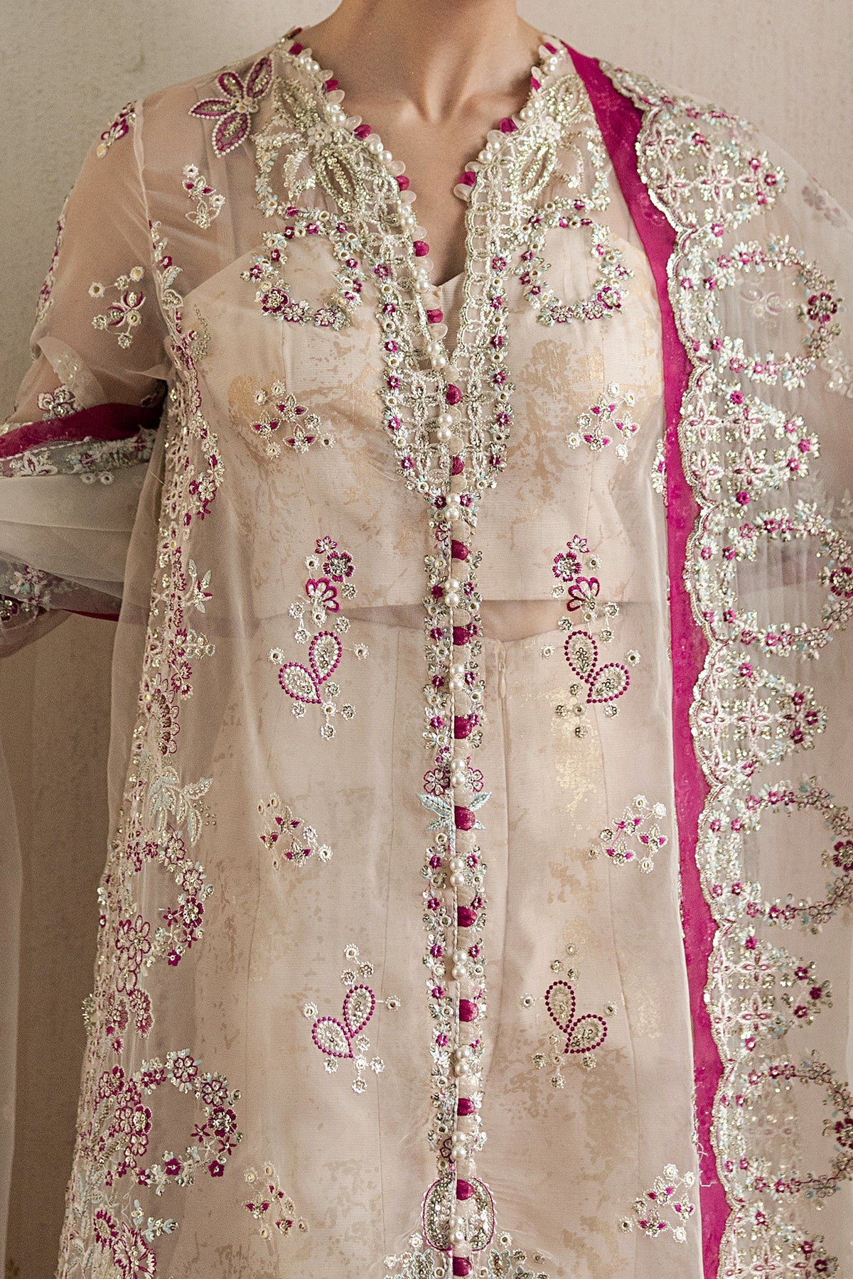 • DESCRIPTION: This ethereal ivory ensemble is adorned with intricate threadwork and sequins in shades of fuchsia and silver. The long, graceful silhouette is complemented by sheer embroidered sleeves and scalloped detailing that adds a touch of refinement. Paired with a coordinated dupatta edged in bold fuchsia borders and delicate motifs, the look strikes the perfect balance between soft femininity and striking elegance. A timeless choice for festive occasions and evening celebrations where grace meets grandeur.