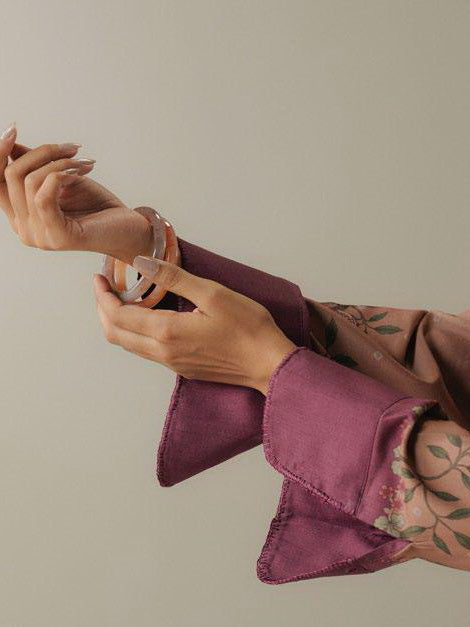 • DESCRIPTION: A dusty pink shirt inspired by modern chintz patterns, paired with matching dusty pink trousers featuring delicate block print details. The ensemble is beautifully complemented by a shawl in soft shades of gray and pink, creating a refined, feminine, and effortlessly graceful look.