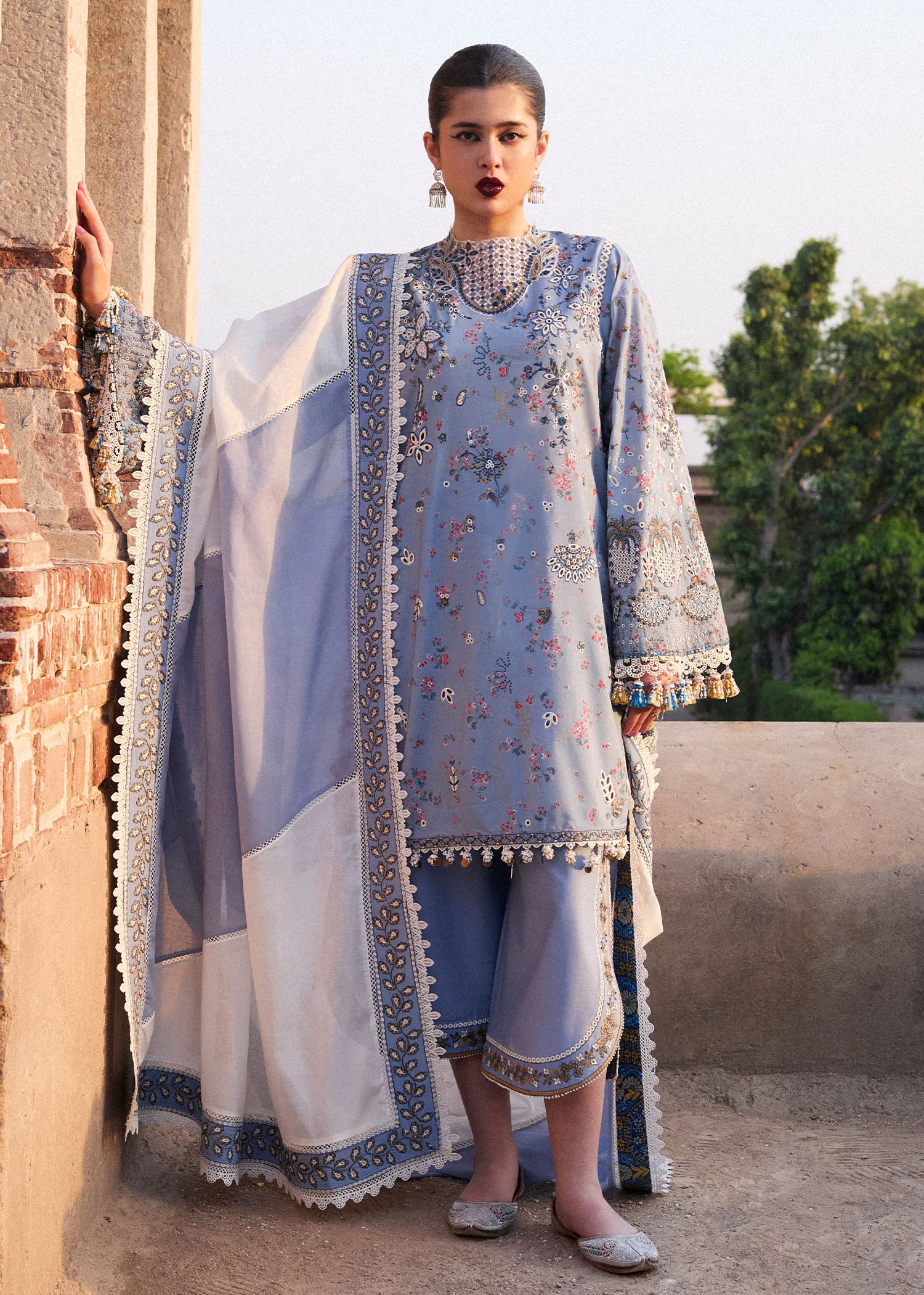 - PRODUCT DESCRIPTION: An ice blue printed shirt ensemble crafts a picturesque view of trendy modernity, infused with skillfully executed embroidery on the finest lawn fabric. Modern embroidery stitches add detailed accents. Alluring modern elements are combined with intricate embroidery in hues of ivory, blue, and mustard, creating an ethereal aesthetic. The design features an embroidered neck patch and modern sleeves with borring technique throughout the shirt, lending a contemporary effect. A color-blocked dupatta, paired with matching cotton trousers featuring embroidery, completes this dazzling and modern silhouette.
