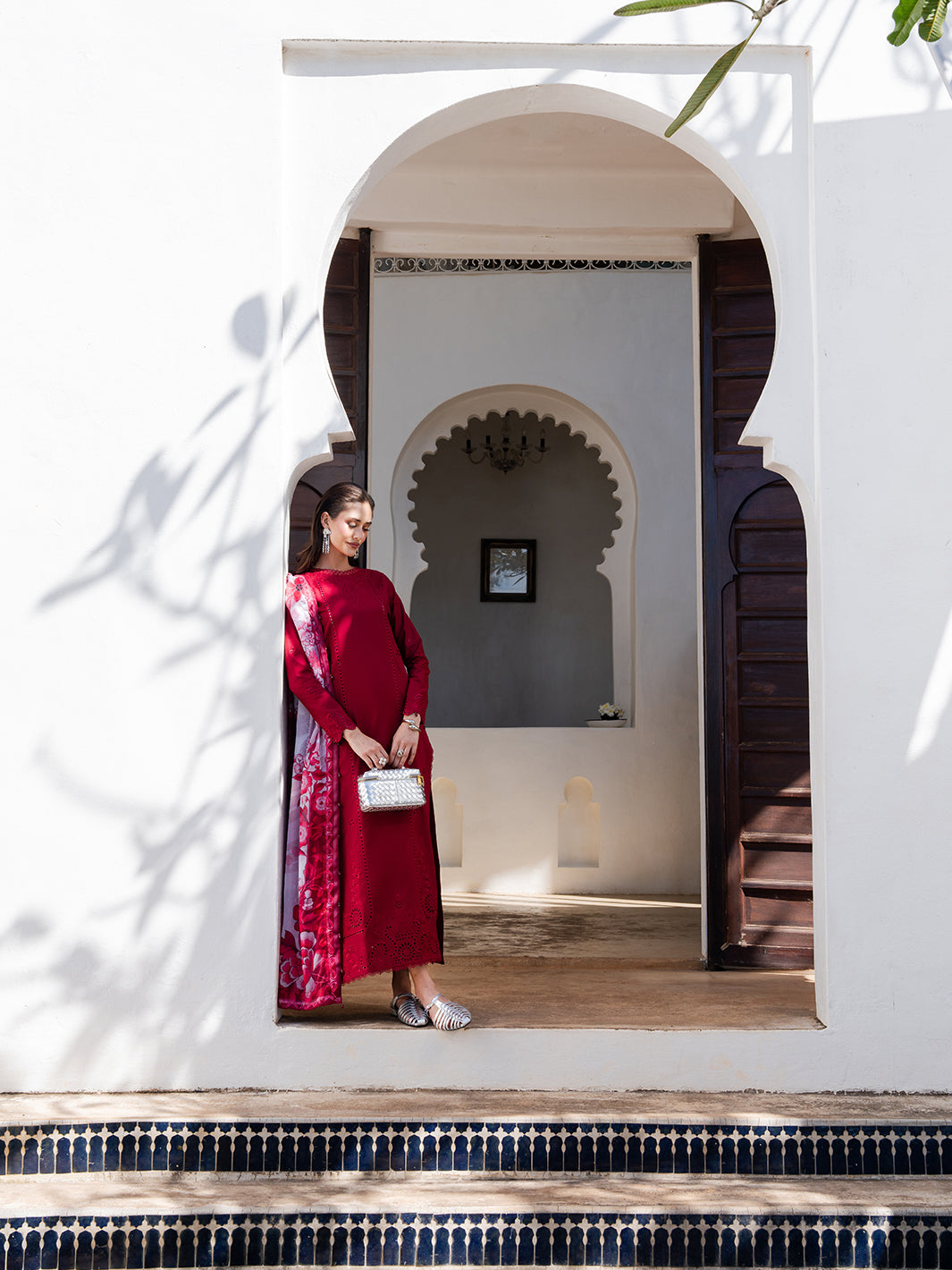 • DESCRIPTION: Step into the season with Rangrez from the Dareen Luxury Lawn collection where delicate embroidery meets effortless sophistication. The soft lawn fabric embraces comfort, while the organza neckline patch and digital silk dupatta add subtle drama. Paired with plain dyed trousers, this ensemble is designed to make a quiet luxurious statement at every gathering.