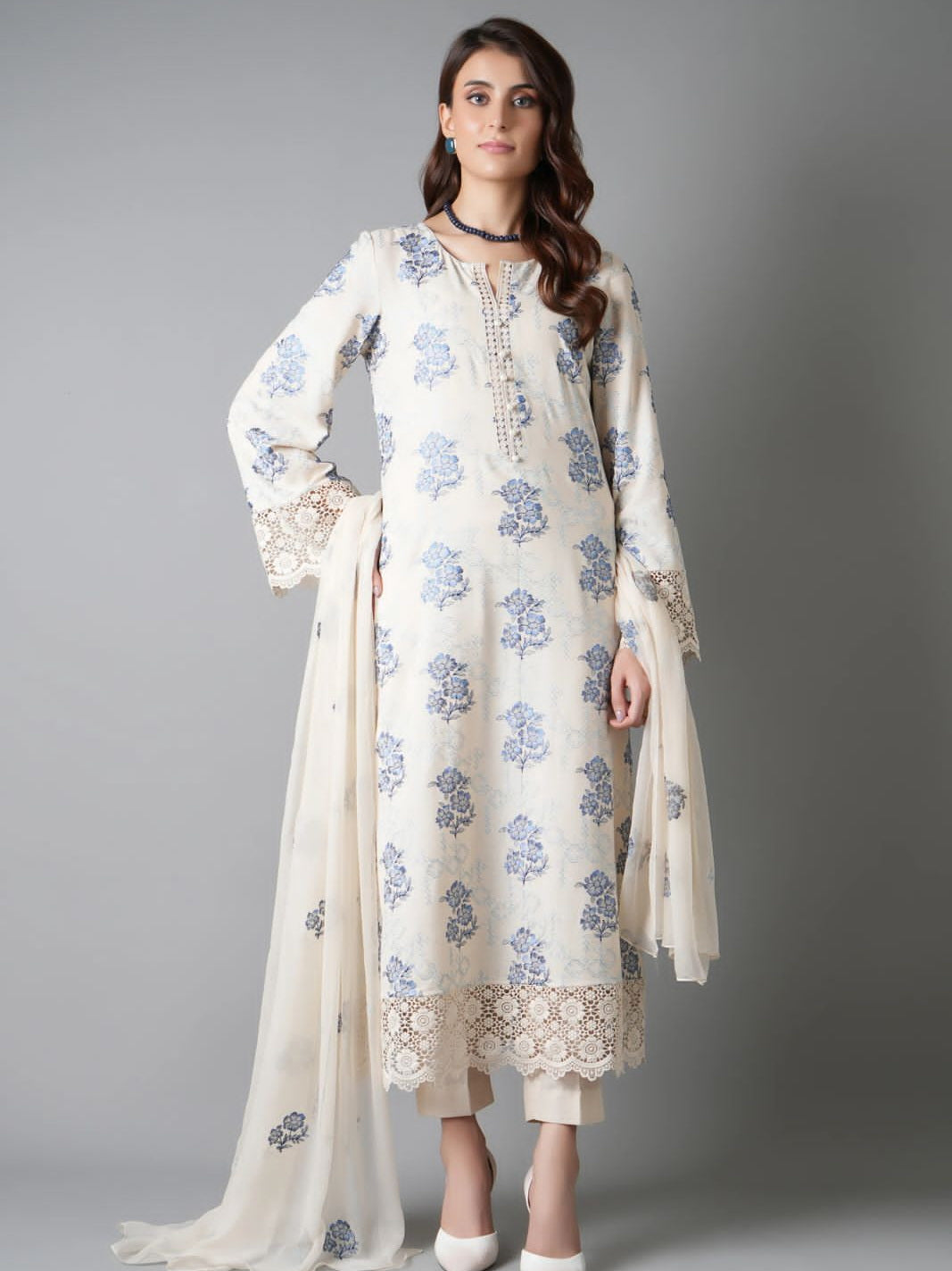 Faisal Fabrics Store Online offers the Biggest range of Pakistani original branded designer suits, having complete Chikankari Karandi winter collection, embroidered & printed dresses in chiffon, cotton, khaddar, linen & jacquard fabrics. Also provide stitching services.