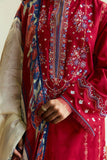 • DESCRIPTION: A bold crimson light jacquard set with folk embroidery, paired with a classic ivory silk dupatta—striking yet timeless, with a nod to tradition.