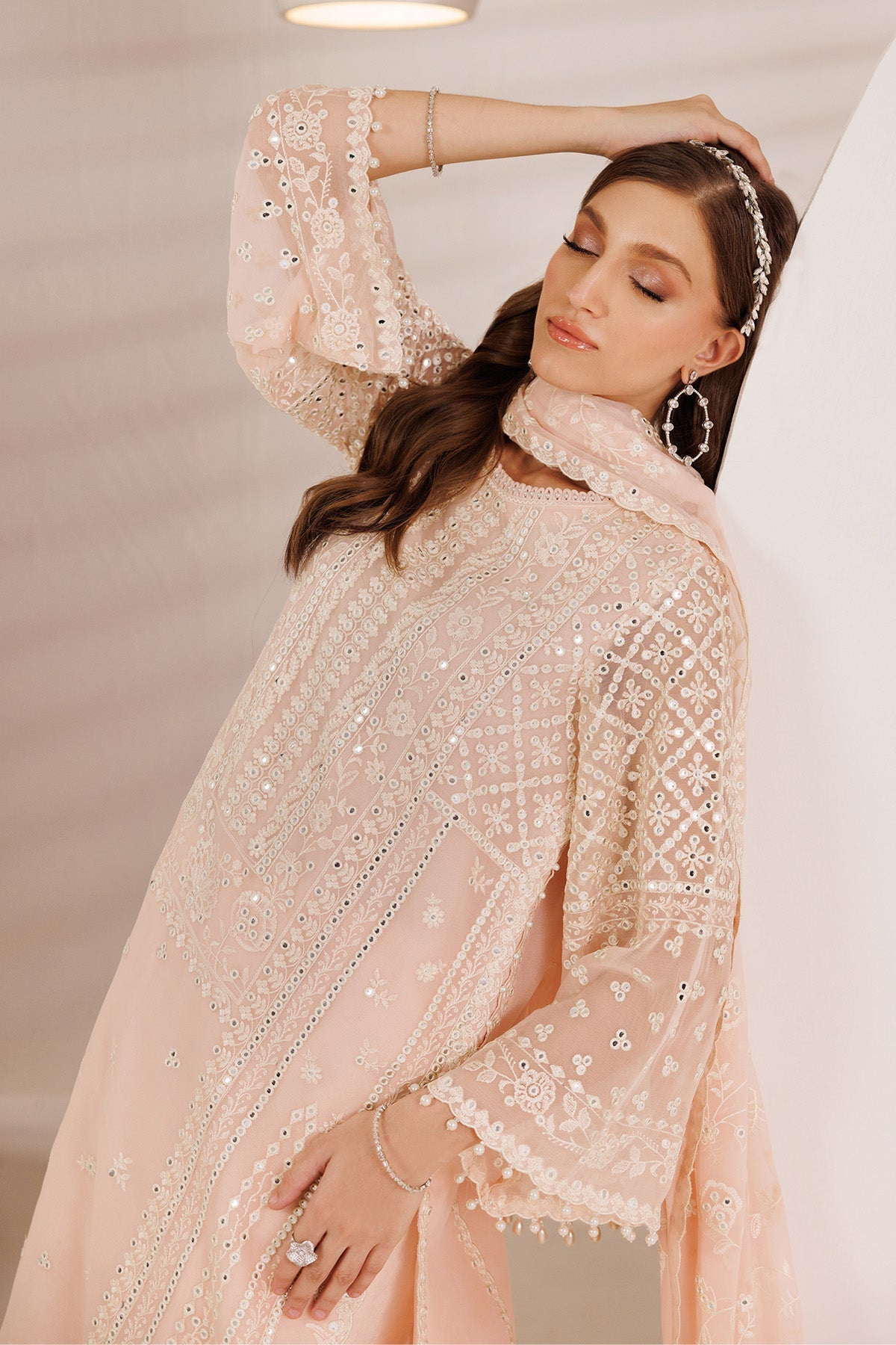 - DESCRIPTION: A pastel pink shirt adorned with intricate foil embroidery adds a subtle shimmer to the front, hem, and sleeves with delicate patterns. Paired with raw silk trousers and draped in richly embroidered chiffon dupatta featuring a finely detailed border, this is elegance that speaks softly, but stands strong.