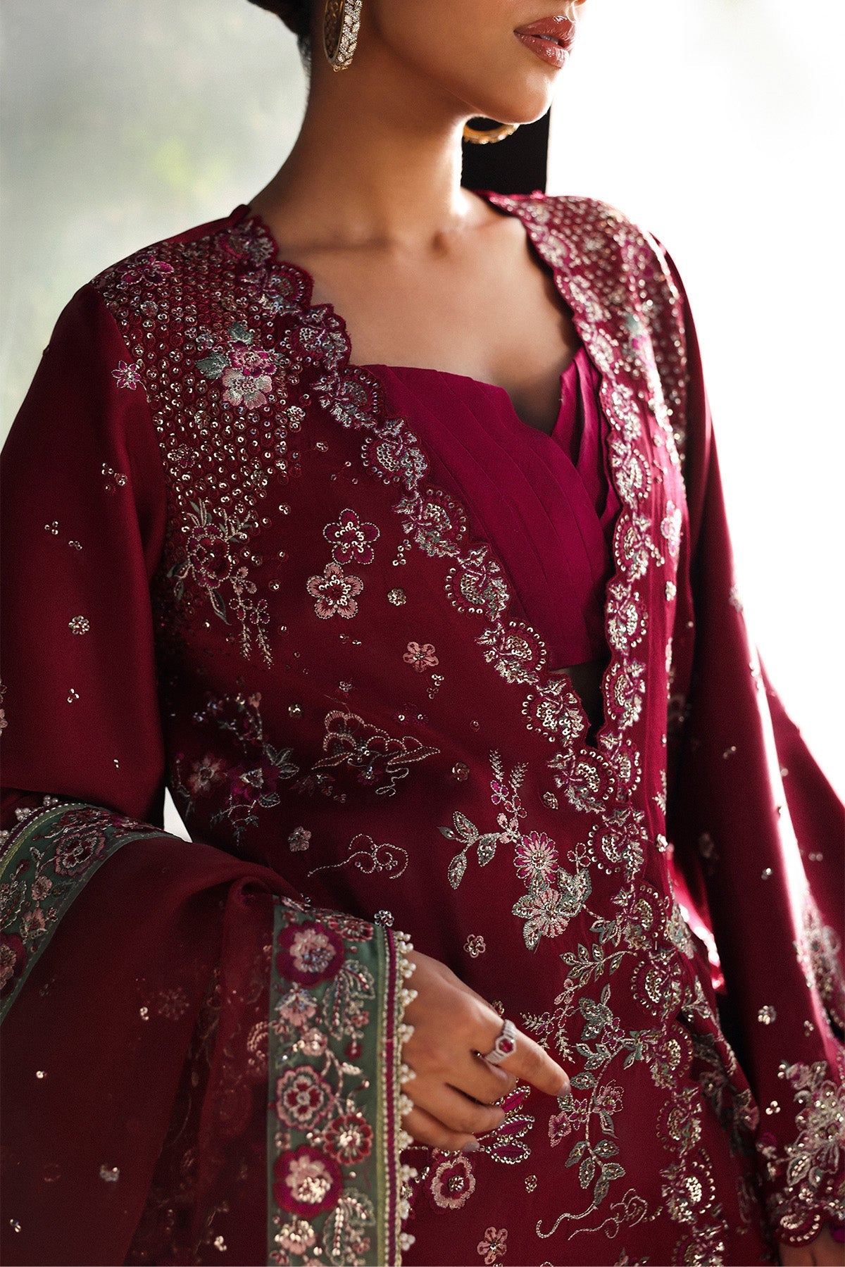 • DESCRIPTION: A striking crimson ensemble featuring angarkha shirt heavily embellished with intricate white threadwork and detailing. Paired with wide-legged trouser and contrasting light green border on sheer dupatta adorned with accents. This look embodies festive grandeur and timeless sophistication.