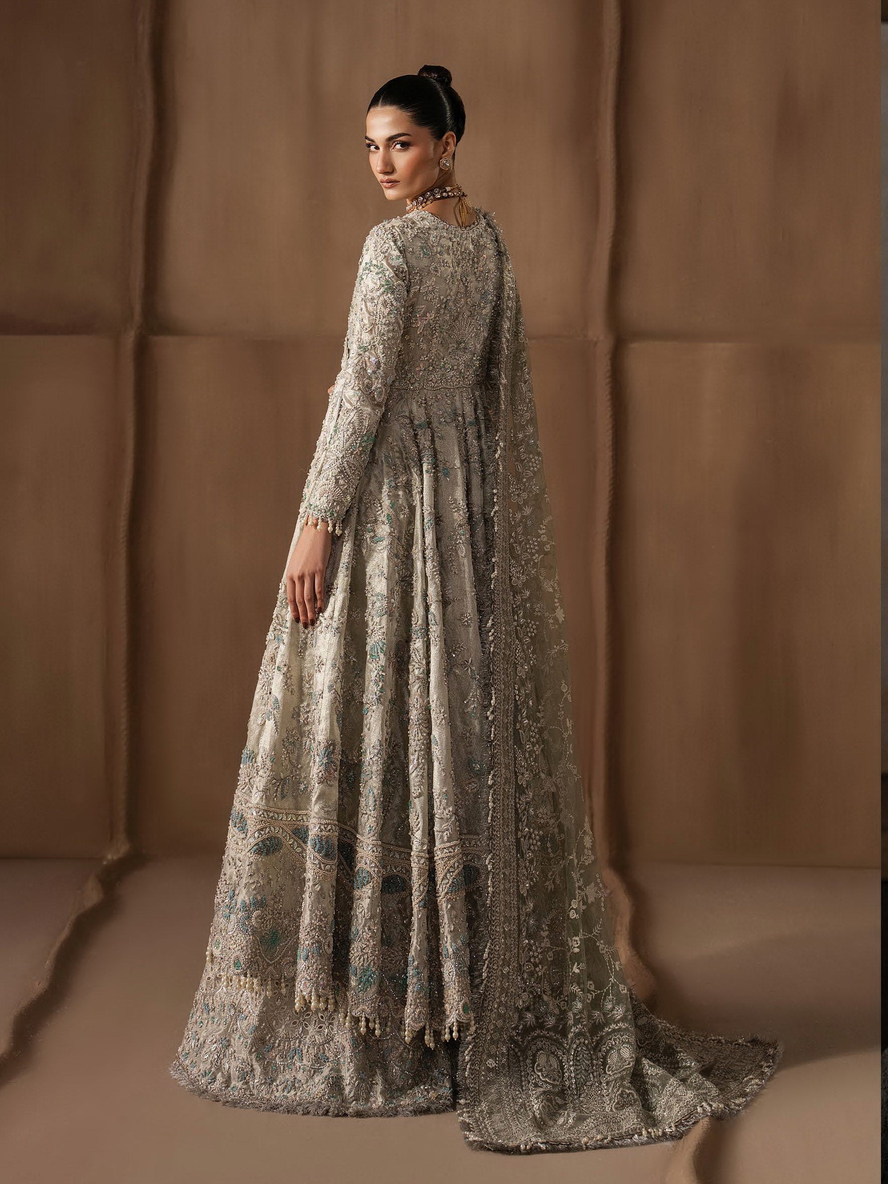 • DESCRIPTION: A long ensemble rendered in a softly muted sage-grey tone, brought to life through layers of intricate hand-embellishment that unfold gently across the silhouette. Fine threadwork and delicate motifs are worked with restraint, creating texture and depth The elongated shirt is richly detailed yet fluid, lending structure while allowing the fabric to fall with quiet grace into the voluminous lehgna below. Each panel of the lehgna carries subtle variation in embroidery, adding movement and dimension as it flows. A sheer dupatta, lightly embroidered and softly bordered, completes the look with an airy finish. The ensemble feels serene and composed and a study in understated luxury.