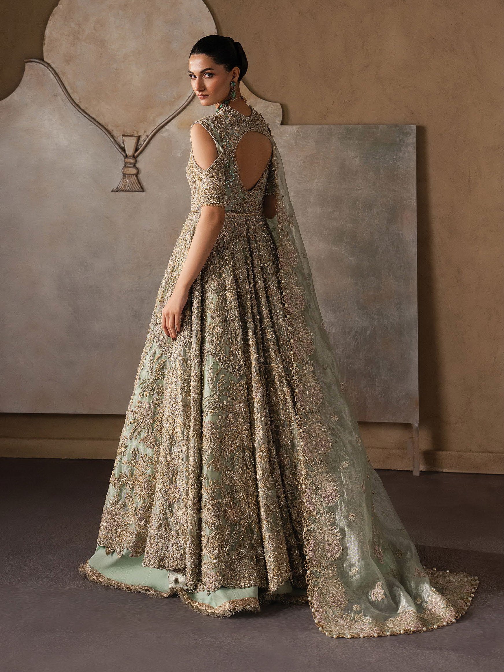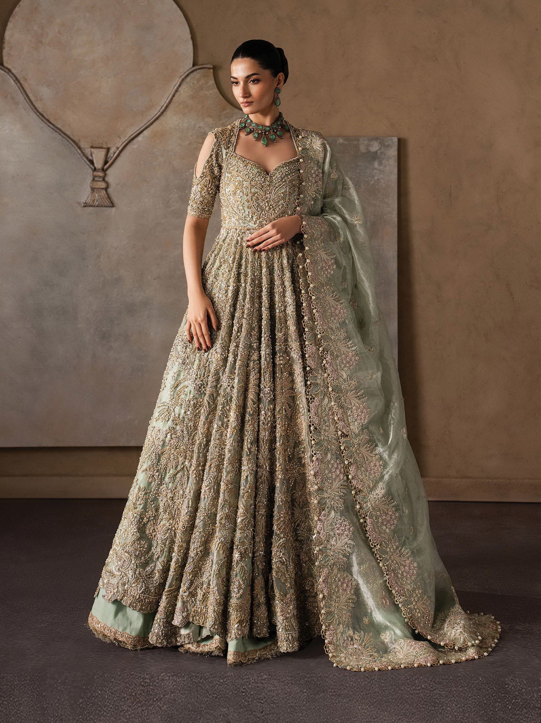 DESCRIPTION: A muted green lehenga adorned with dense hand-embellishment, where antique gold threadwork and delicate motifs cascade across the skirt, creating a rich, textured surface with graceful movement. The blouse is intricately worked, sculpted to complement the volume below while maintaining a refined,