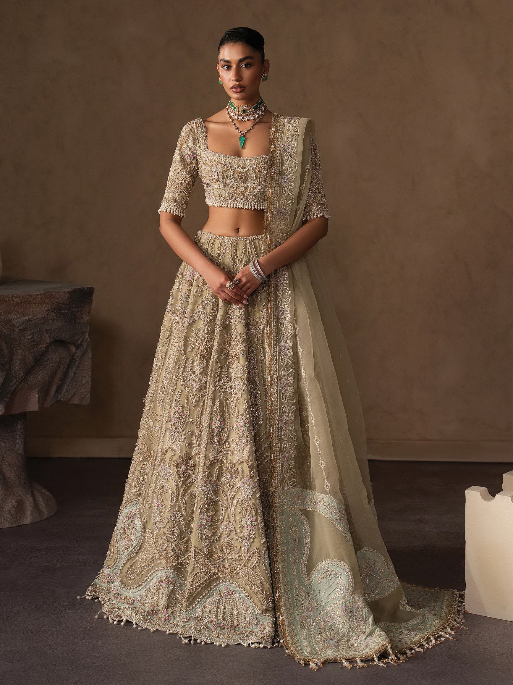 - DESCRIPTION: A beautiful pastel gold lehenga brought to life through intricate hand-embellishment, with flowing paisley and botanical motifs lending depth and quiet movement to the silhouette. The structured blouse is finely detailed to echo the richness of the skirt, offering balance and understated elegance. A sheer dupatta, softly edged with delicate accents, drapes effortlessly to lighten the ornate base. The look is rooted in subtle grandeur. Timeless, composed, and defined by craftsmanship that speaks gently rather than loudly.
