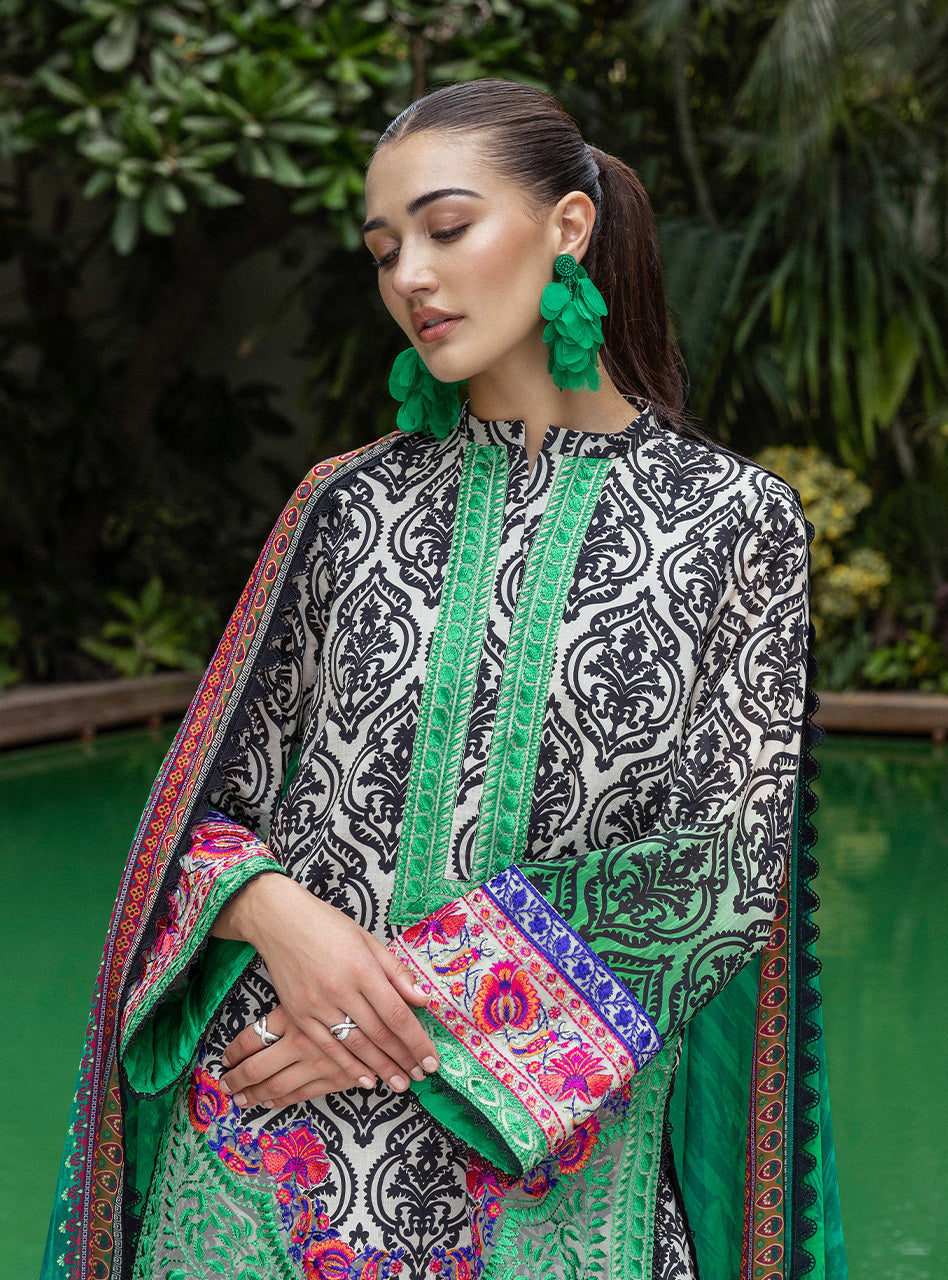 DESCRIPTION: Discover the midnight garden of TIA, an unstitched masterpiece from Zainab Chottani's latest Lawn Collection. Crafted from high-quality lawn, this design showcases a unique black print on a light, creamy background, creating a mesmerizing base. The design truly comes alive with splashes of vibrant green and hot pink on the lower shirt and sleeves.