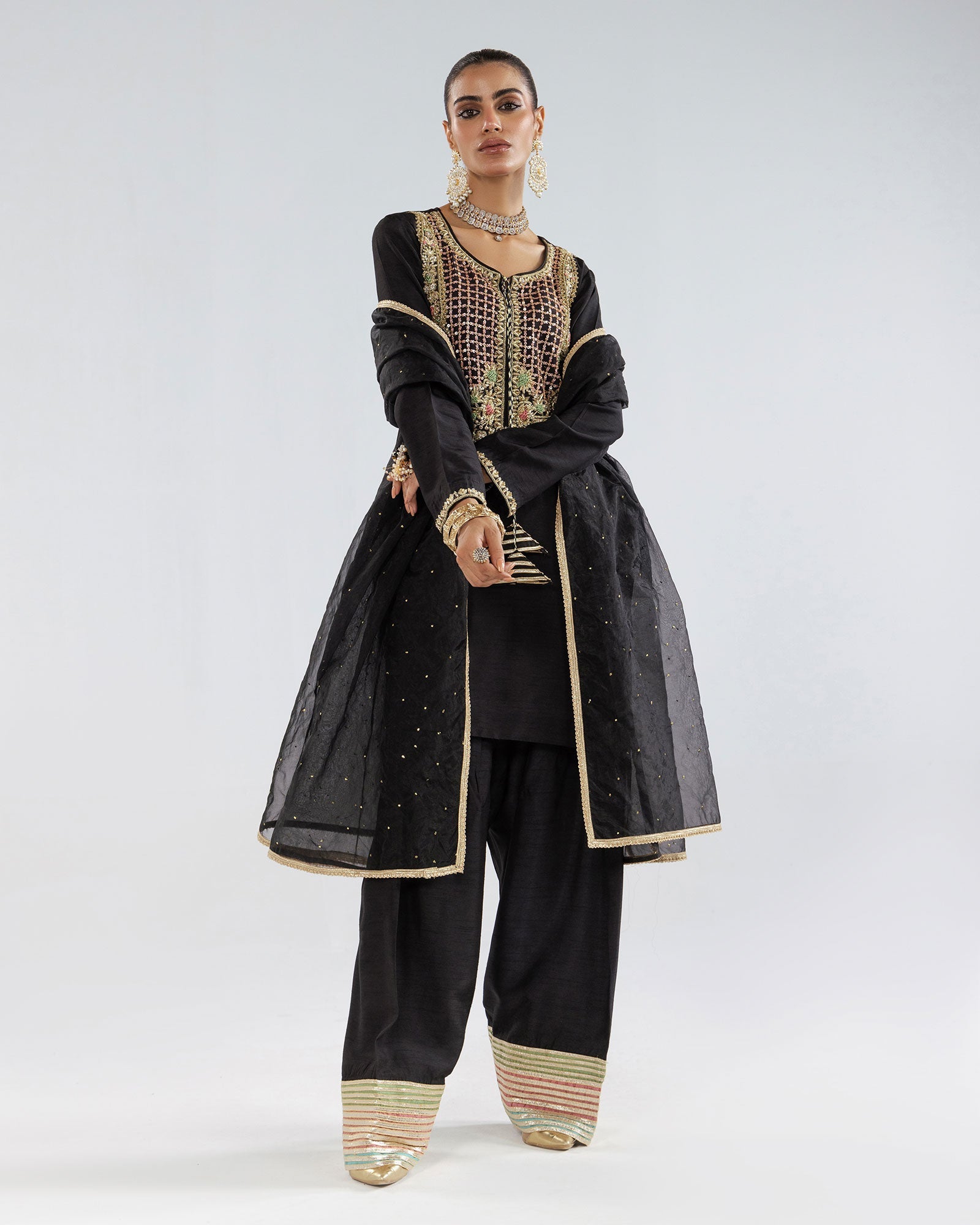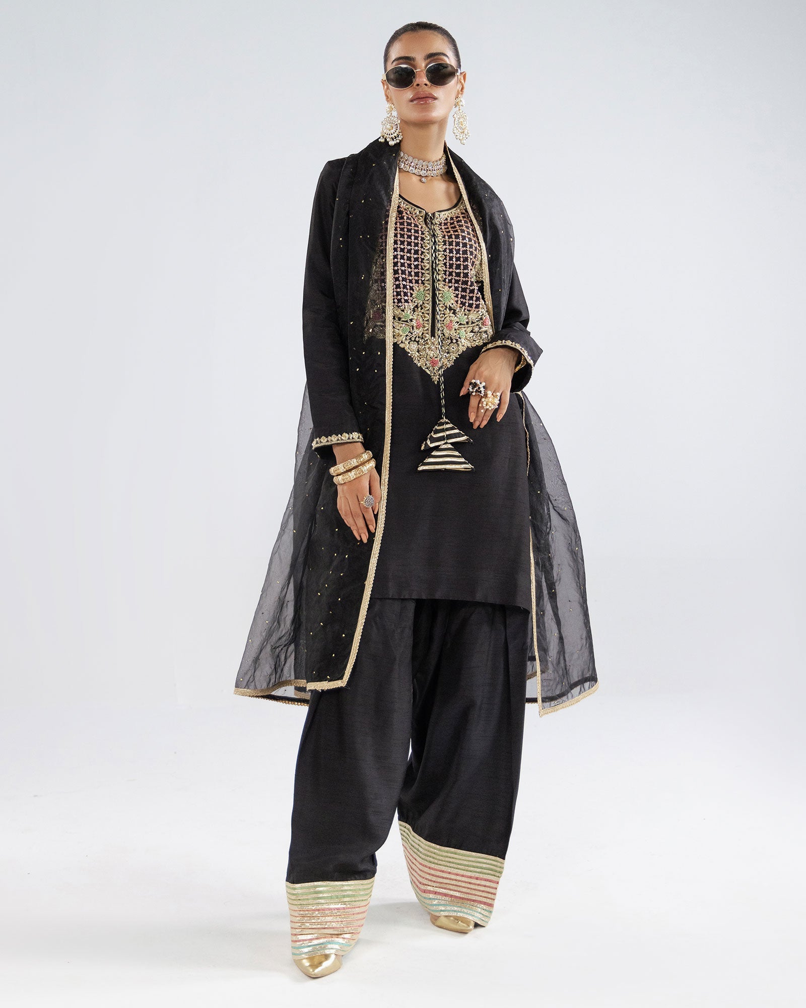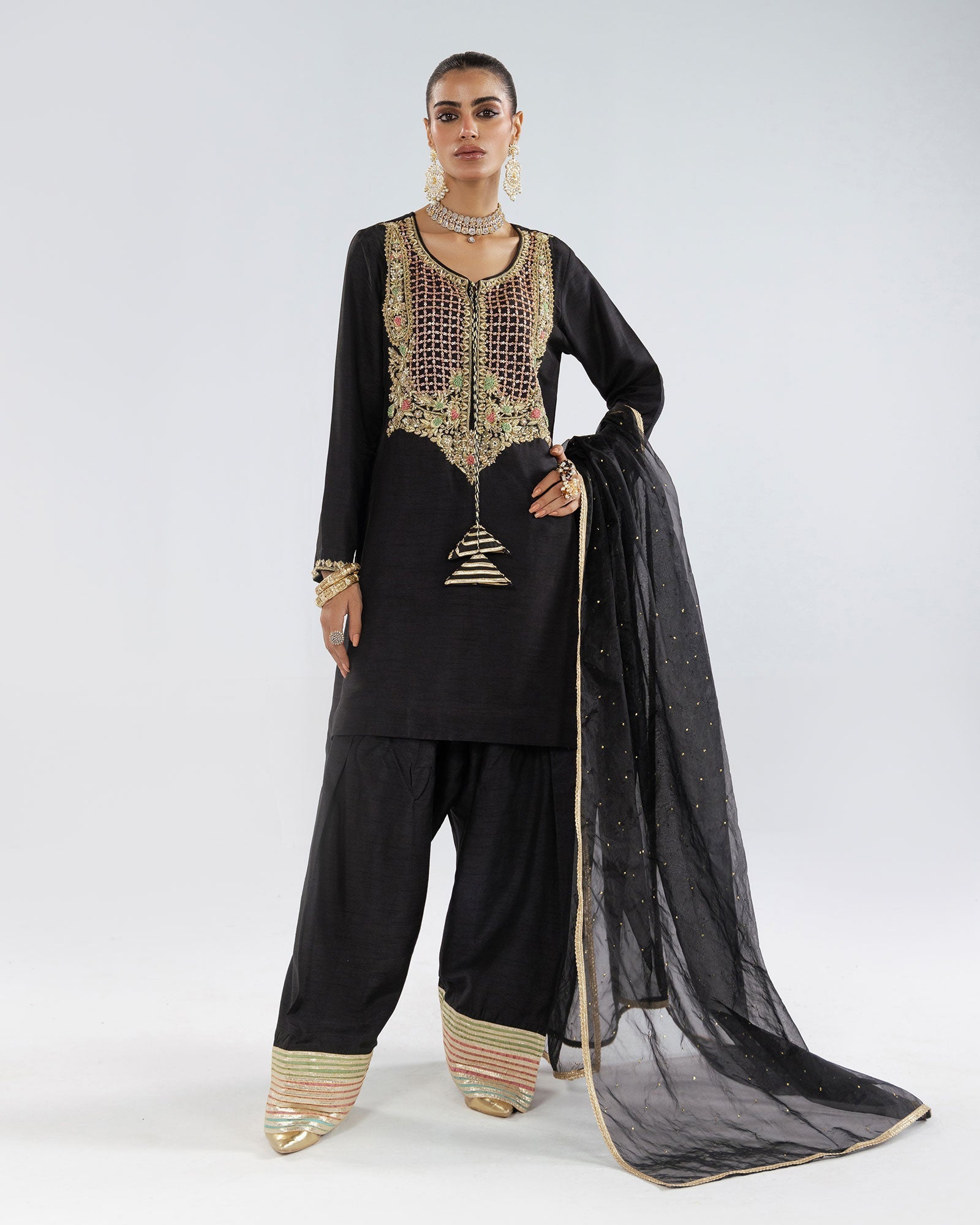 • This is an absolute elegant black raw silk shirt with a heavily embellished neckline, ada work, with tassels adding to the detail and beauty of this outfit. It’s paired with a shalwar with a colorful gota border and organza dupatta filled with sequin spray and four-sided gota lace finishing elegant look.