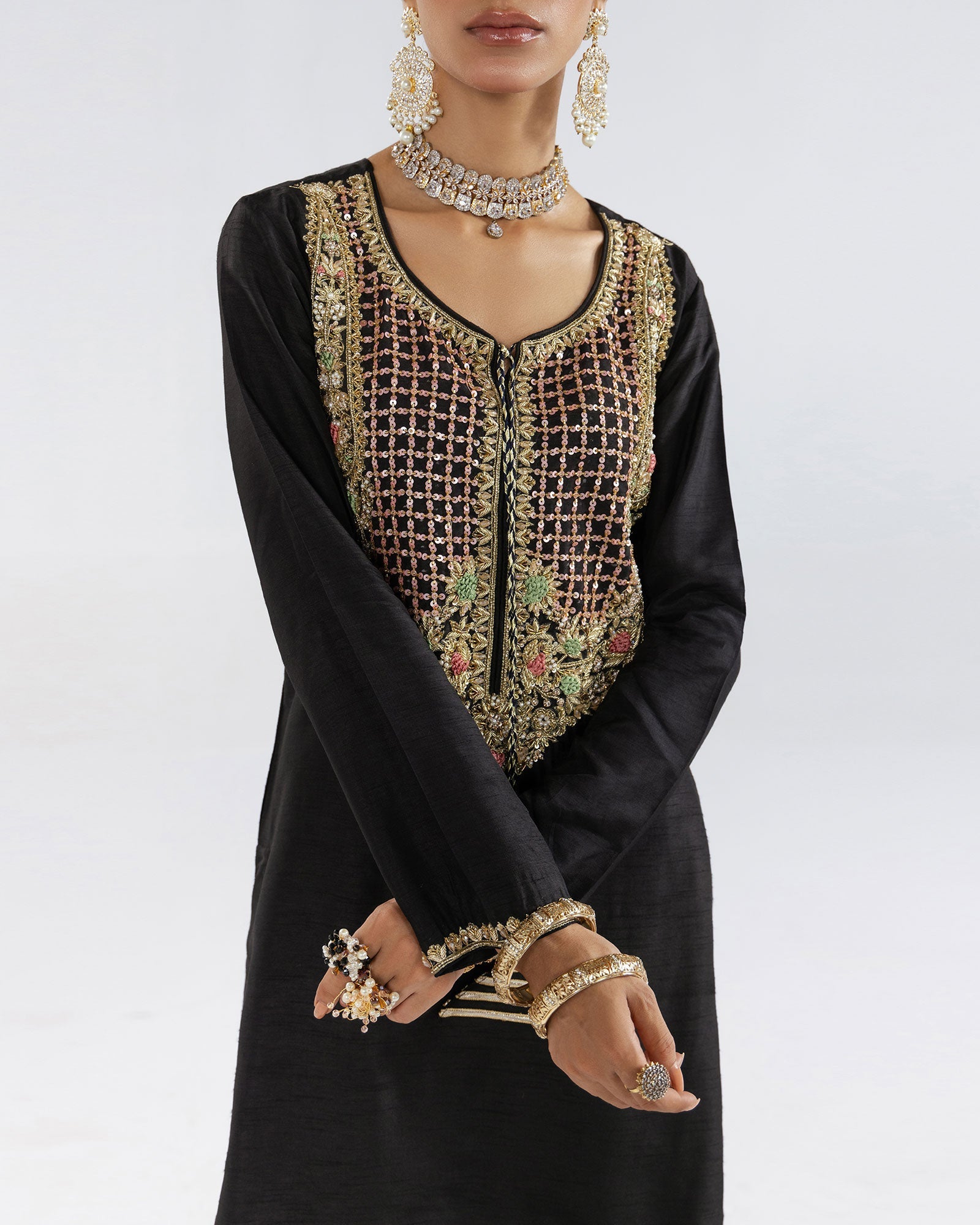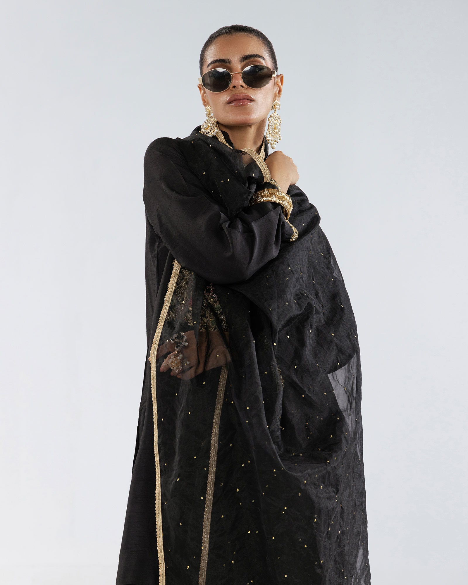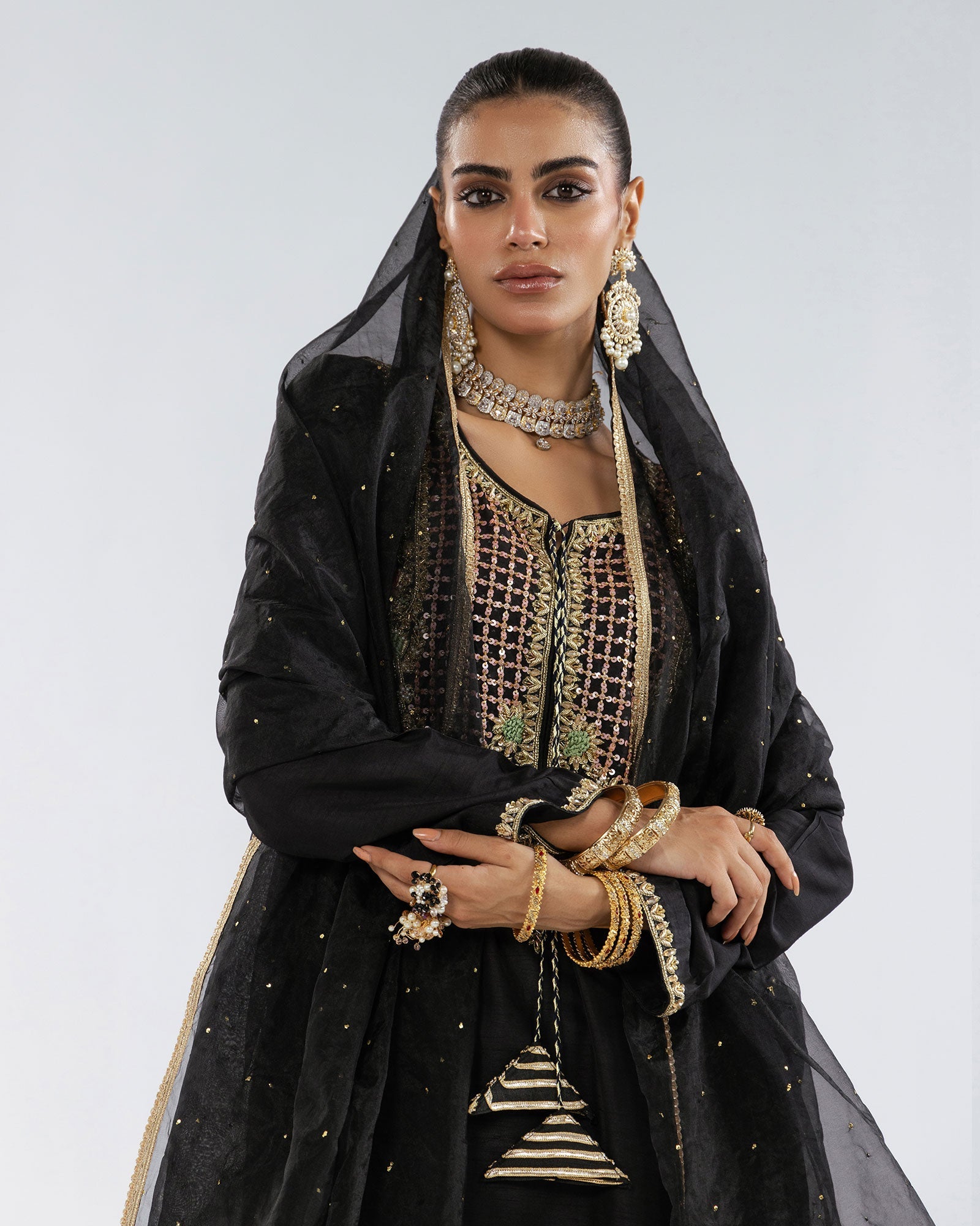 • This is an absolute elegant black raw silk shirt with a heavily embellished neckline, ada work, with tassels adding to the detail and beauty of this outfit. It’s paired with a shalwar with a colorful gota border and organza dupatta filled with sequin spray and four-sided gota lace finishing elegant look.