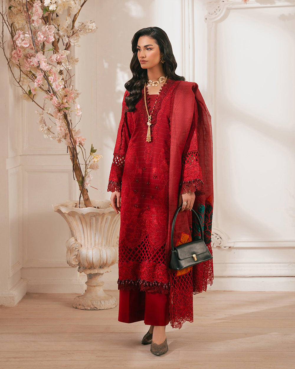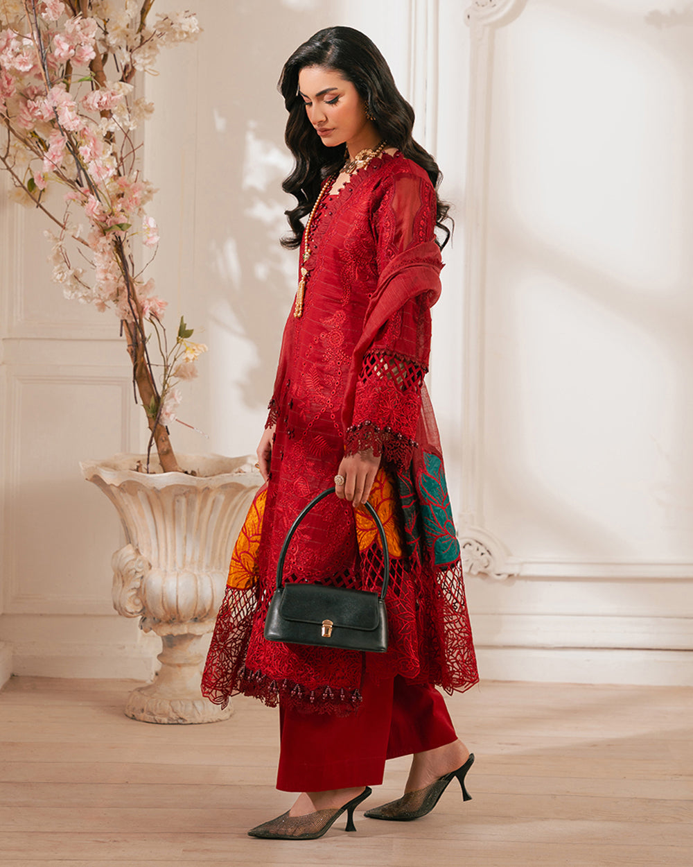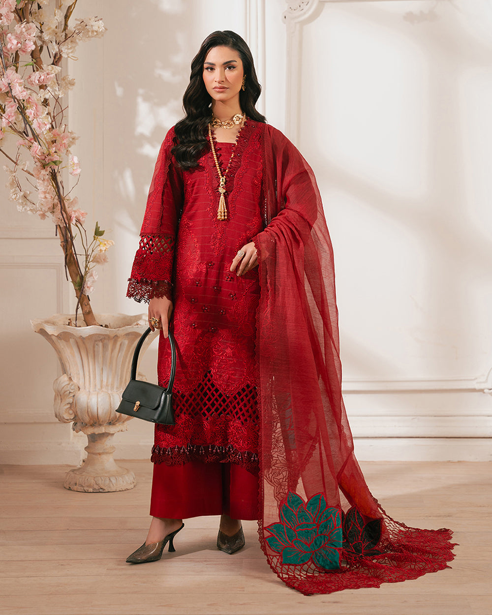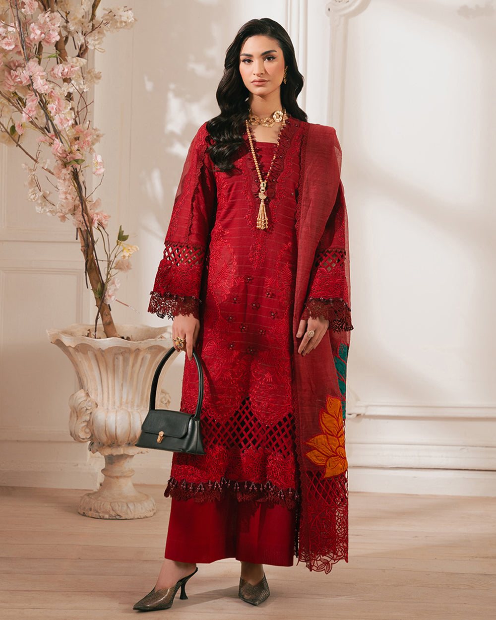 - DESCRIPTION: This stunning radishroon ensemble showcases our signature delicate embroidery with cutout details on the front. The intricate floral patterns create a classic and elegant look, paired with matching pants featuring heavy floral motifs. Completing the outfit is a beautiful cotton net dupatta adorned with exquisite embroidery, paying homage to the timeless beauty of florals.