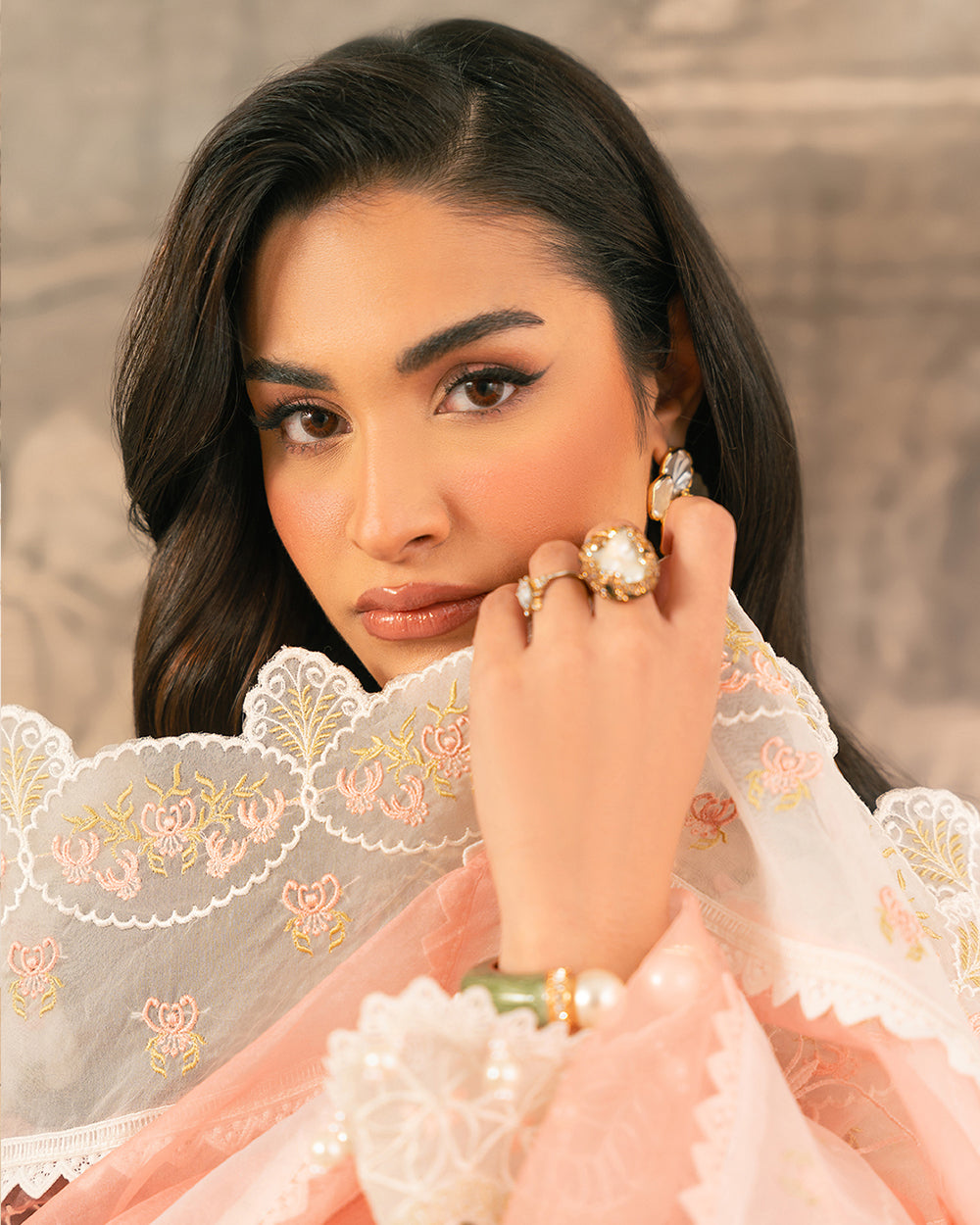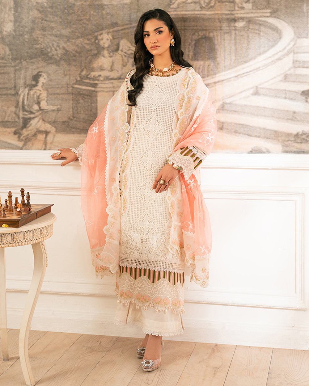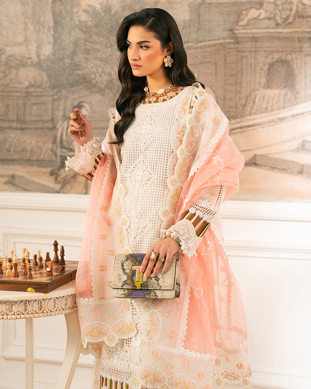 - DESCRIPTION: This exquisite ivory ensemble embodies luxury and refinement, showcasing intricate embroidery on slub lawn fabric. The delicate schiffli-embroidered center panel in soft summer hues adds a touch of whimsy. Paired with a pastel pink pure organza dupatta, adorned with a matching embroidered border, and complemented by rich ivory trousers, this modern outfit is a masterful blend of elegance and sophistication.