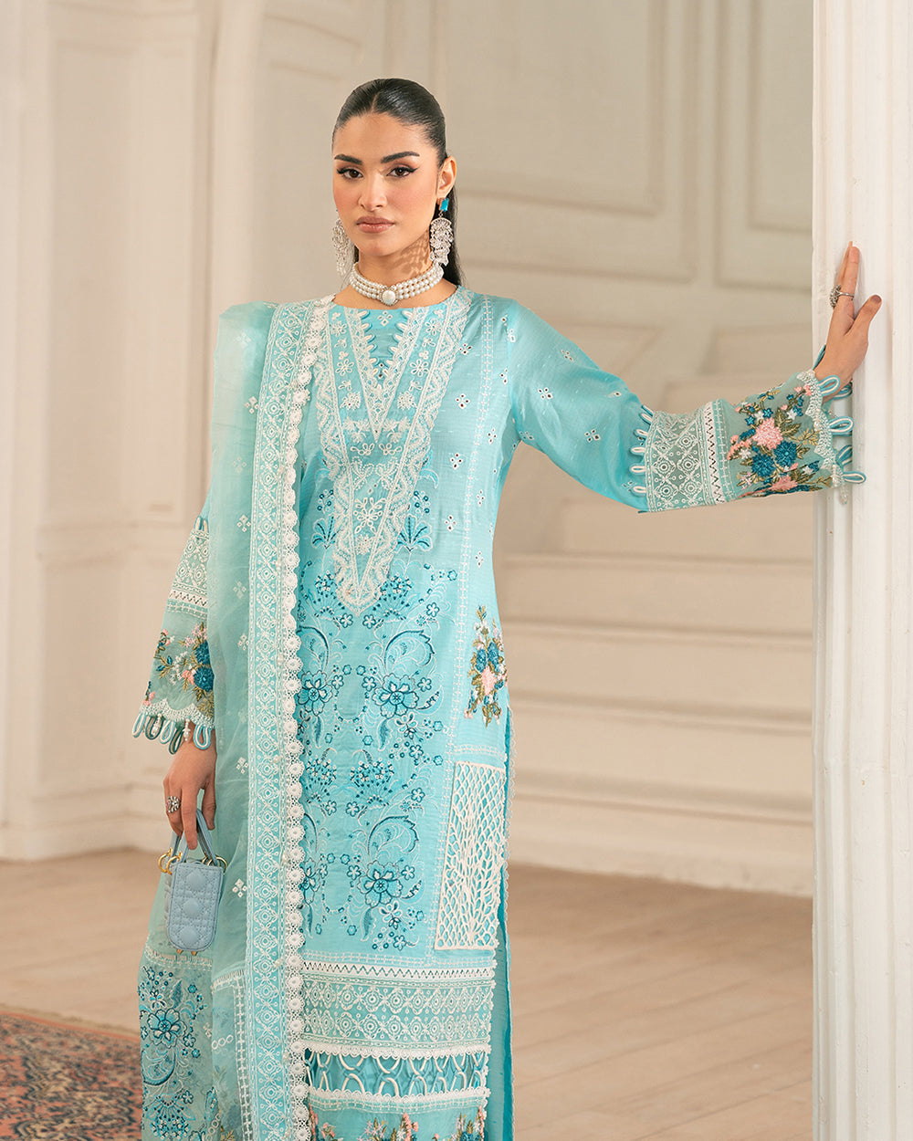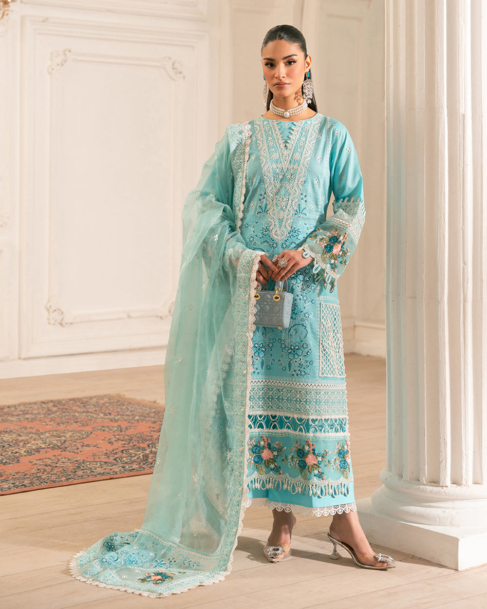 - DESCRIPTION: A summertime turquoise blue outfit, accentuated by finely detailed embroidery on slub lawn fabric, offers a vision of rich history and sophistication. The shirt features enticing flower patterns together with elaborate embroidered patch accents around the neckline add a sense of ethereality. The combination is complemented by a pastel pure organza dupatta with hefty pallu and four embroidered borders. The matching turquoise blue pants round off this sleek and striking silhouette.