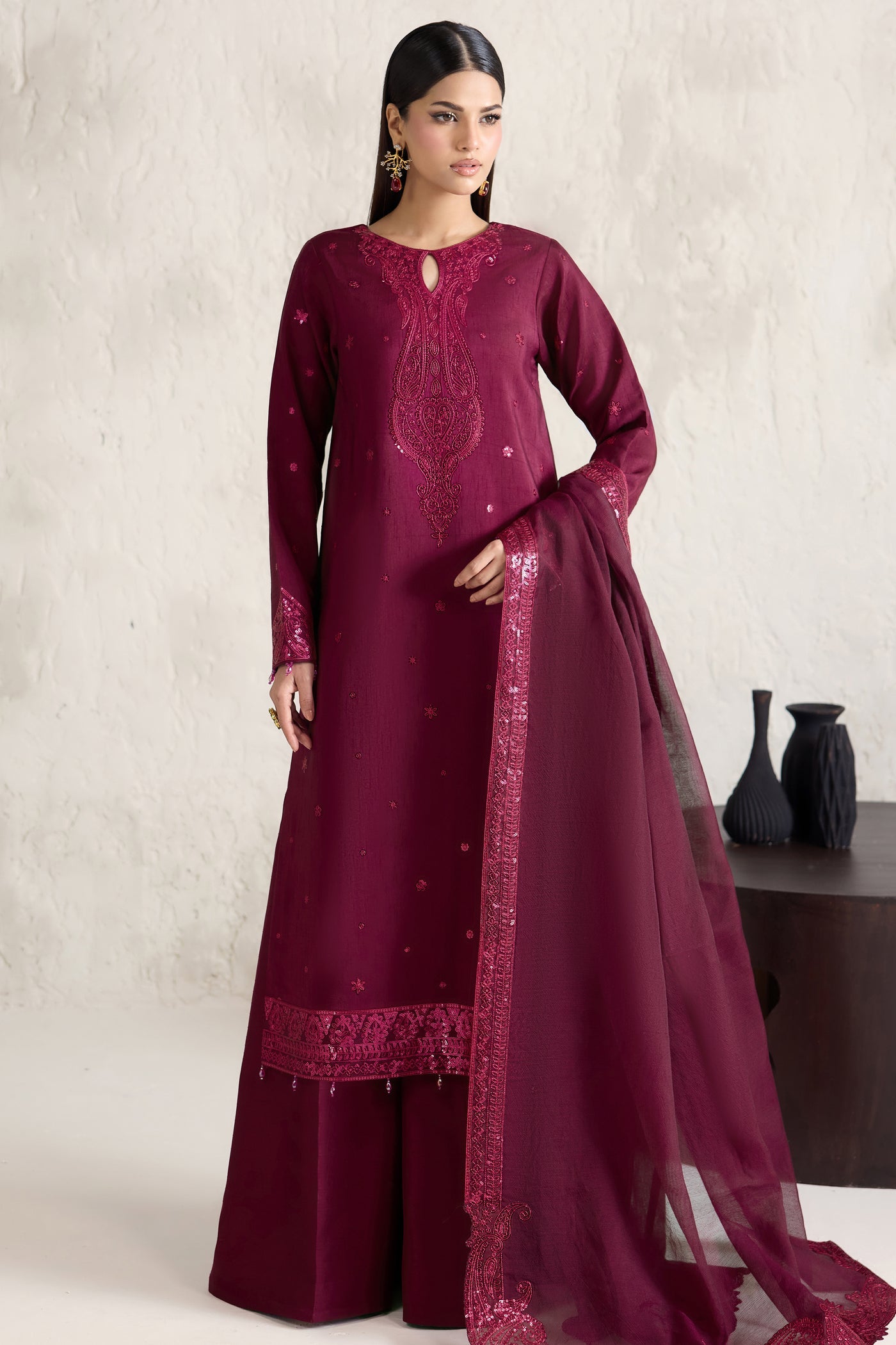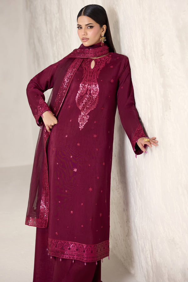 Farasha Embroidered Luxury Korean Raw Silk Unstitched 3Pc Suit - Fuchsia Glow