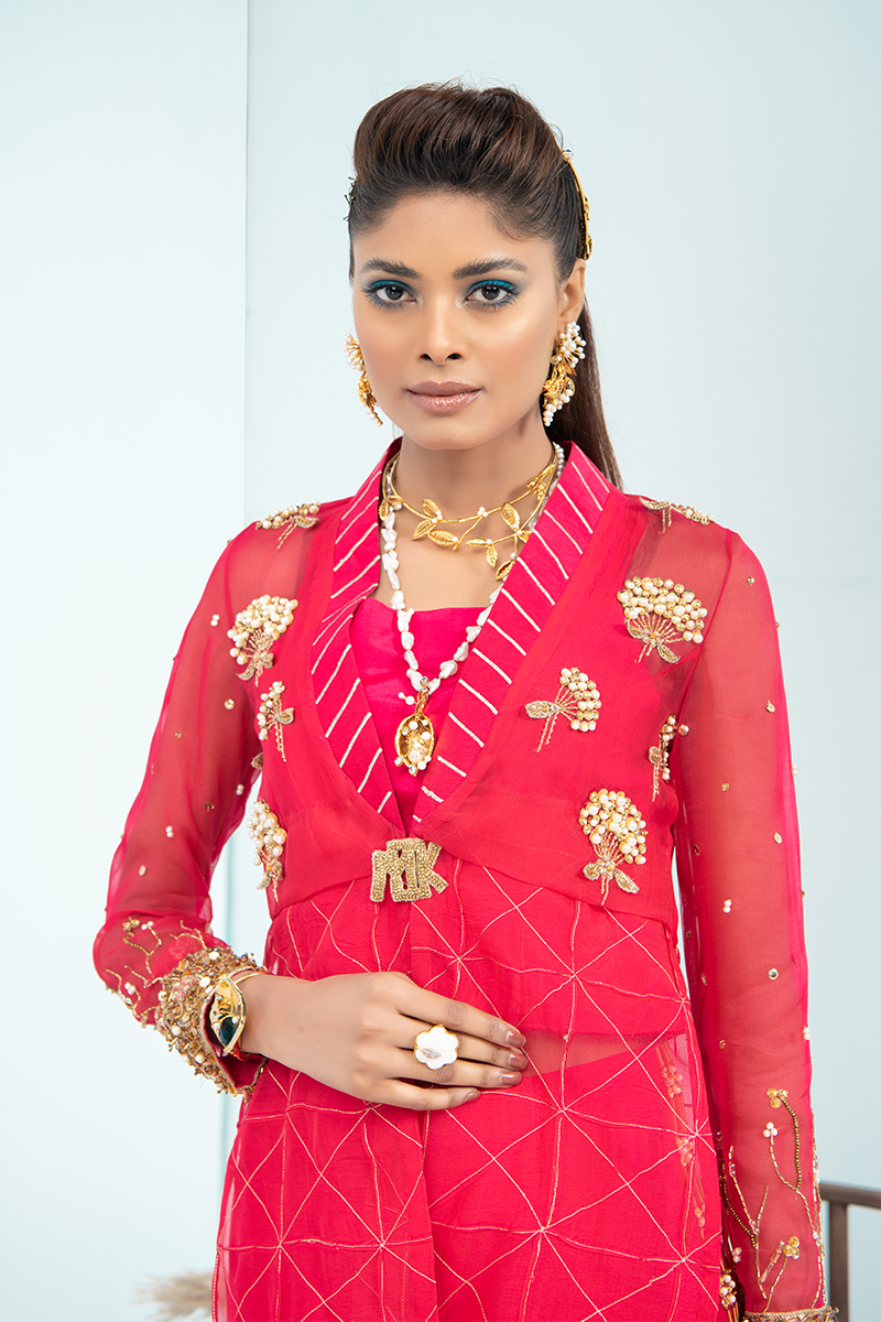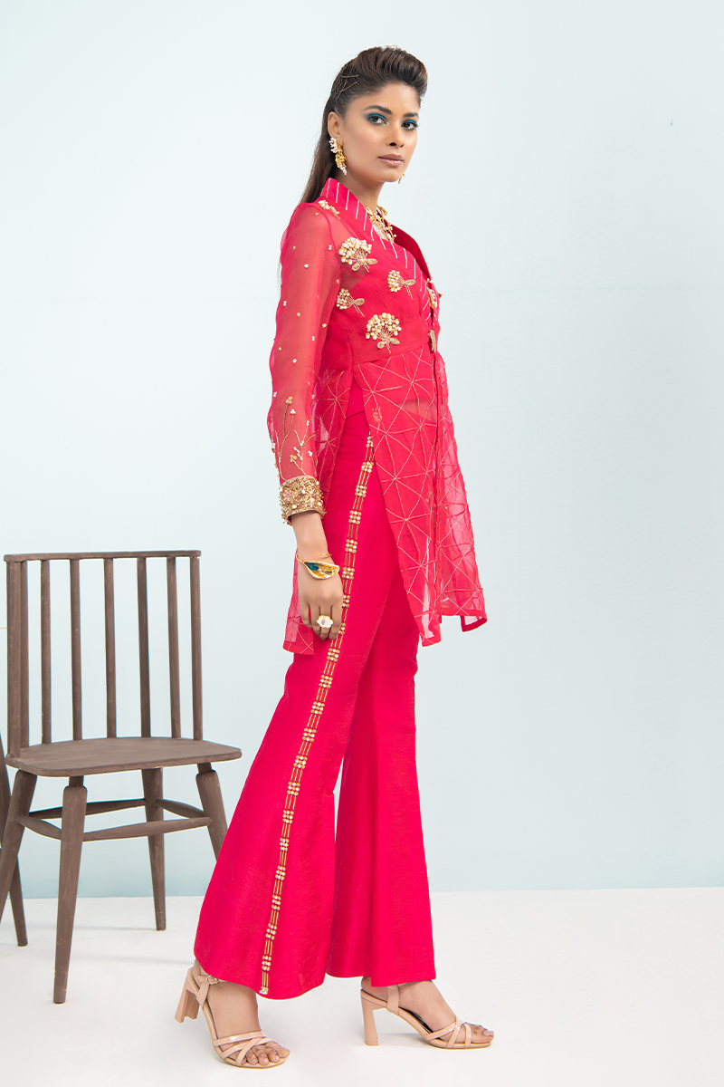 Indulge in this magnificent hot pink jacket adorned with delicate sequins, crystal and Swarovski work paired with our signature raw silk boot-cut pants for an effortlessly chic look!
