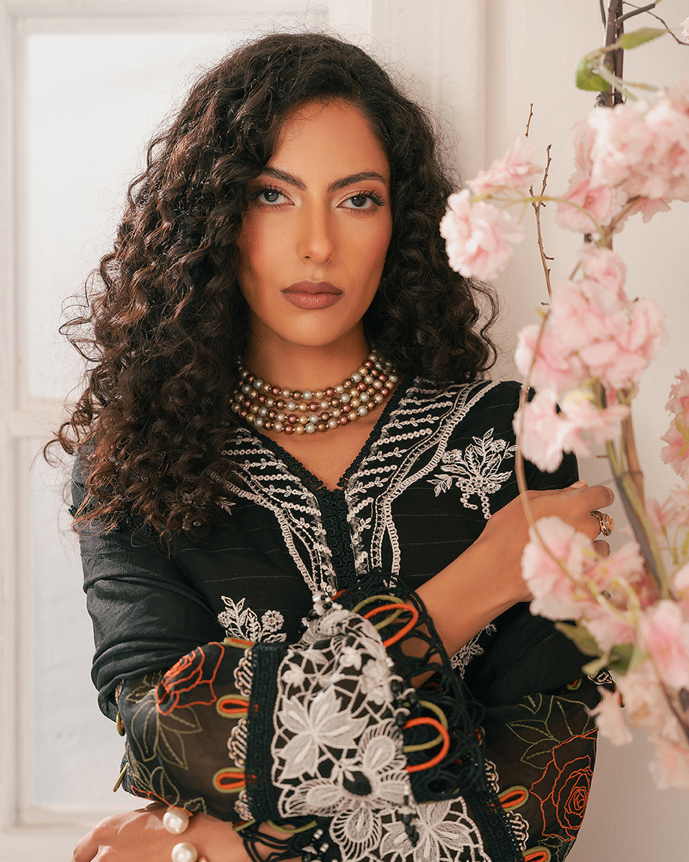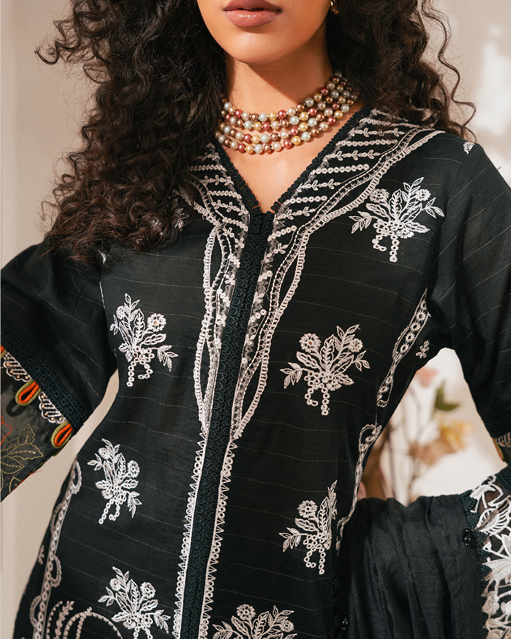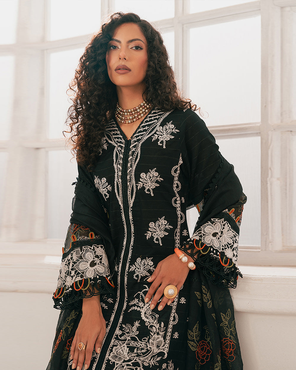 • DESCRIPTION: Make a statement at your summer festivities with this breathtaking black ensemble, expertly designed to elevate your celebration. The intricately embroidered white motifs on the shirt create a striking contrast, paired with sleek black trousers featuring subtle designs. The finishing touch is the vibrant marmalade-colored embroidery on the dupatta's pallu, adding a pop of color to this chic monochromatic ensemble.