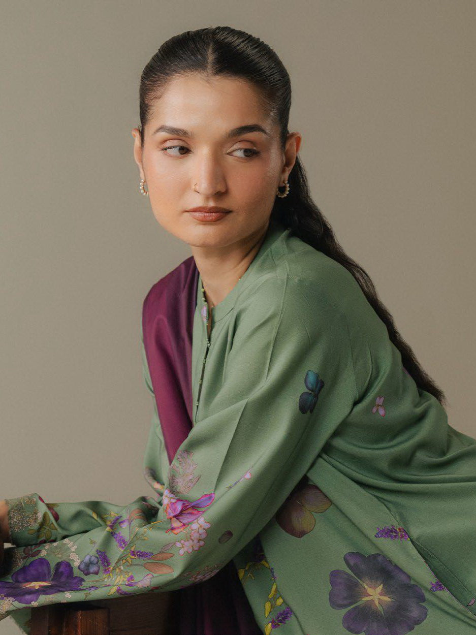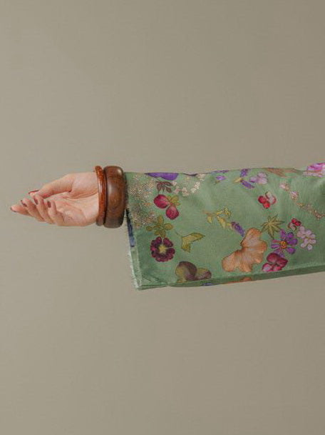 - DESCRIPTION: A hedge green shirt inspired by botanical motifs, paired with matching hedge green trousers featuring soft floral patterns. The ensemble is elevated with a deep purple shawl adorned with a blend of stripes and florals, adding a striking contrast and a touch of artistic sophistication to the look.