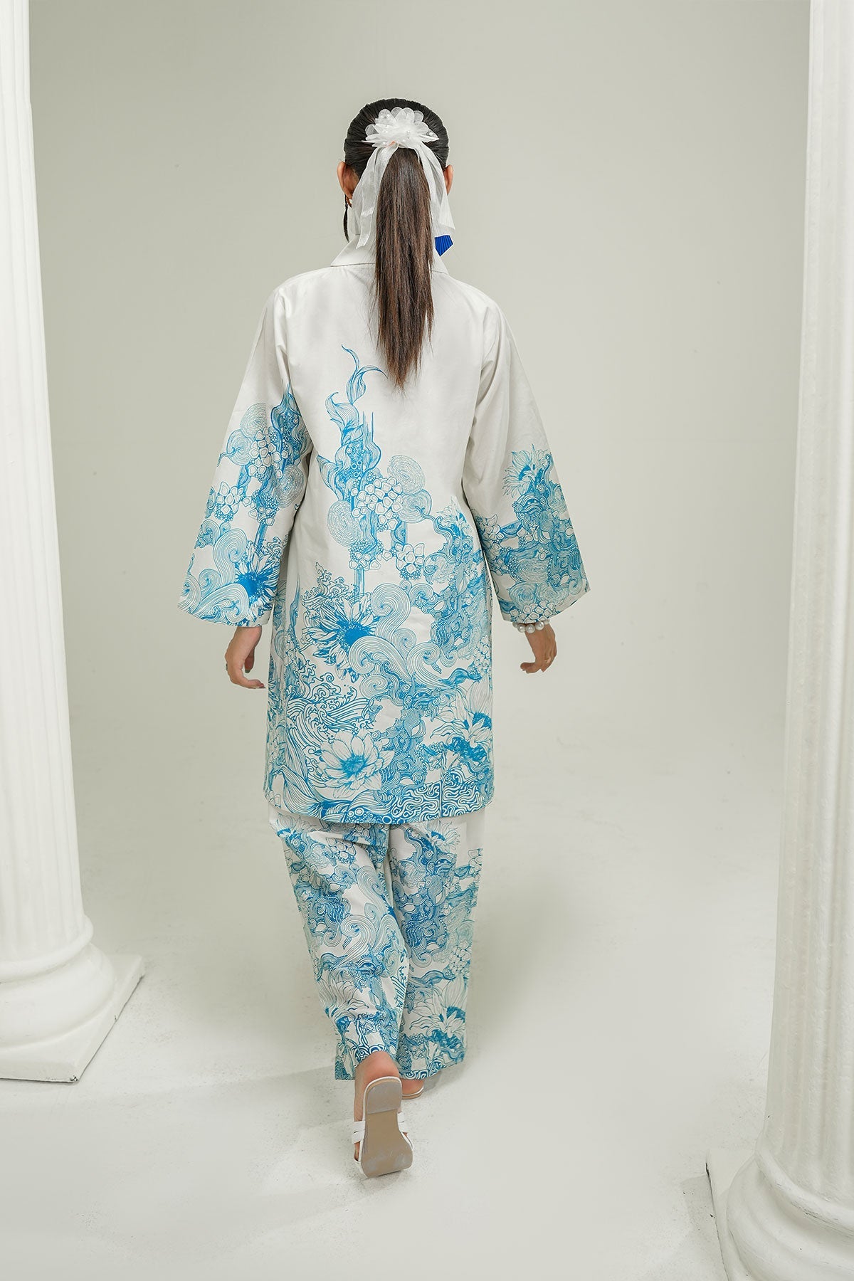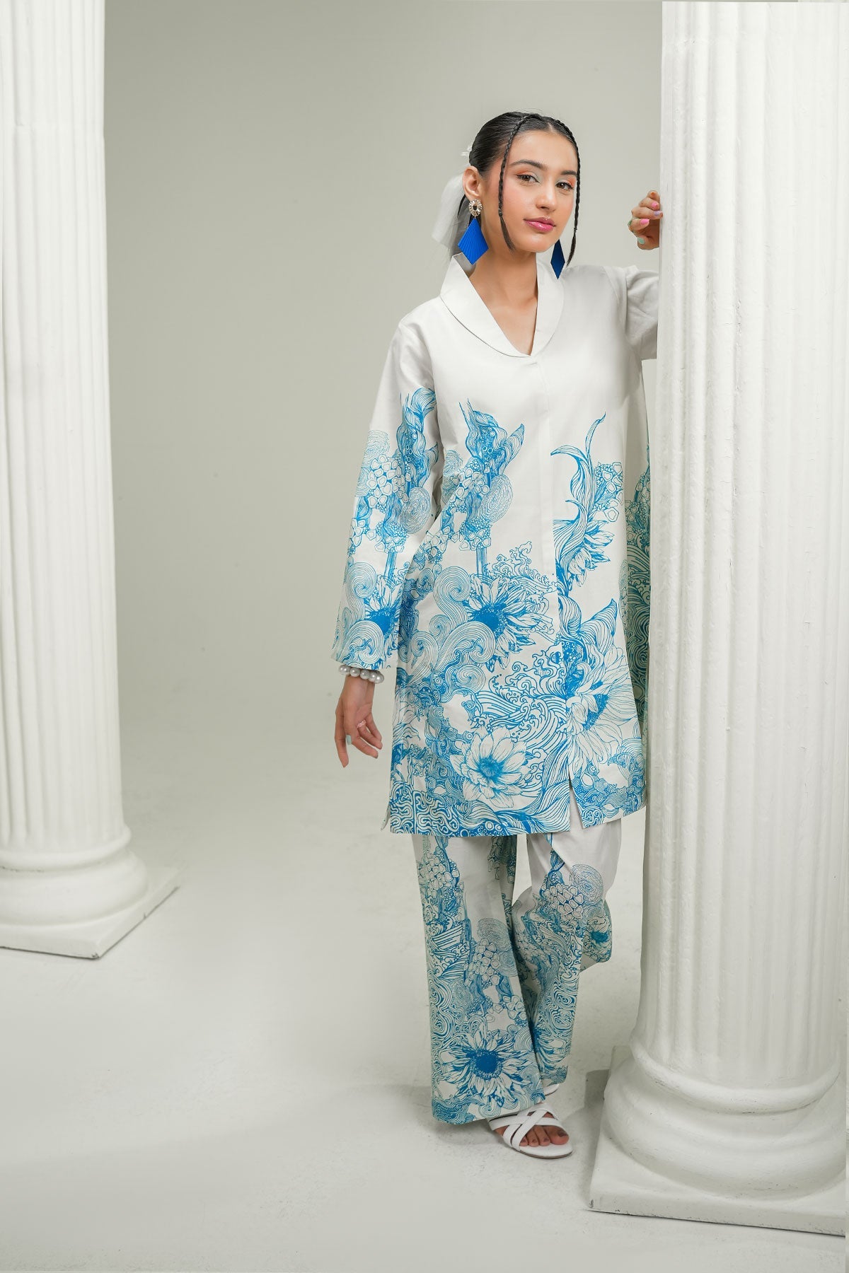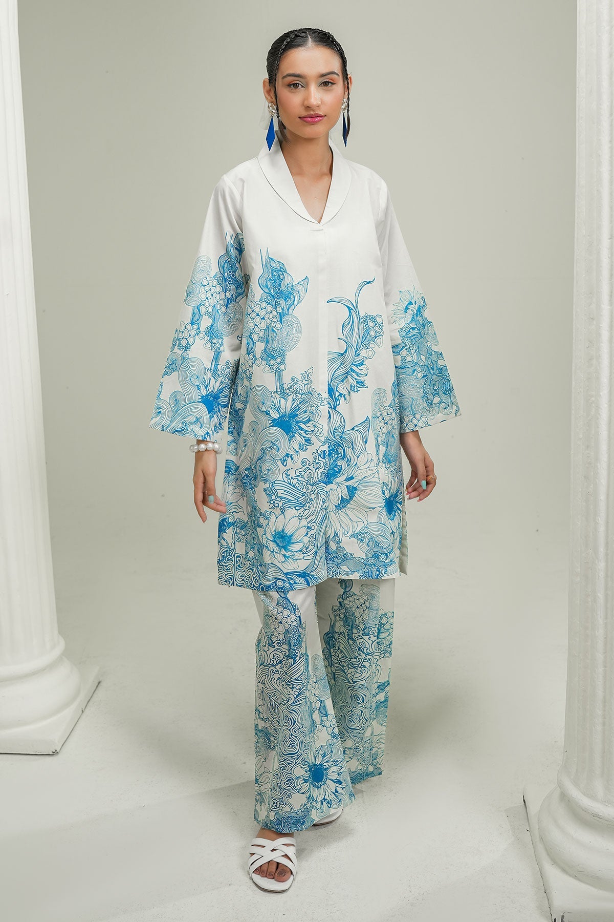 White base with intricate blue print, this co-ord set features a traditional pattern, straight kurta, and wide-leg trousers — perfect for a timeless, graceful look.