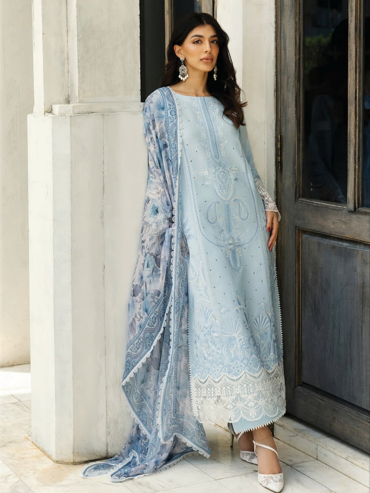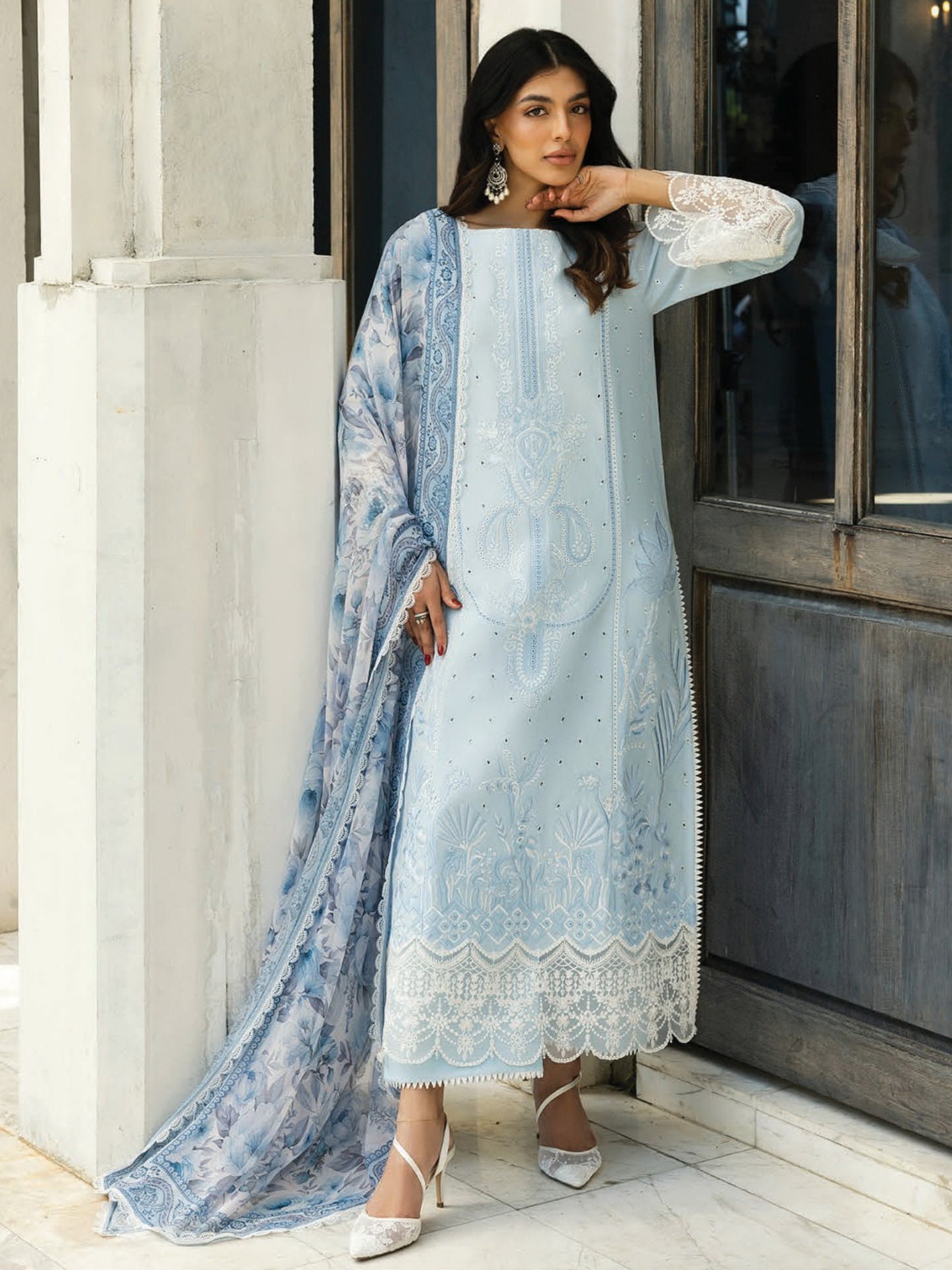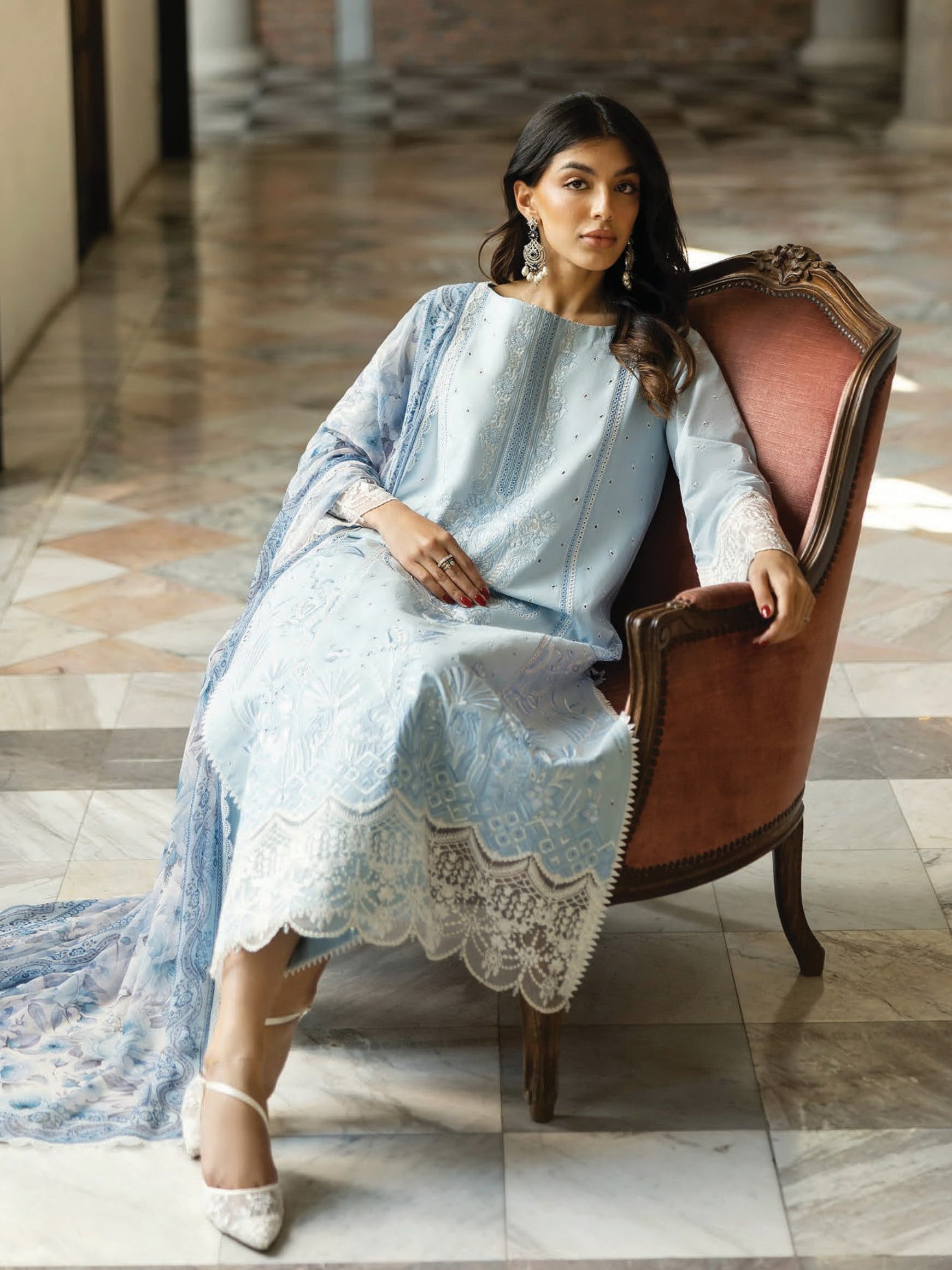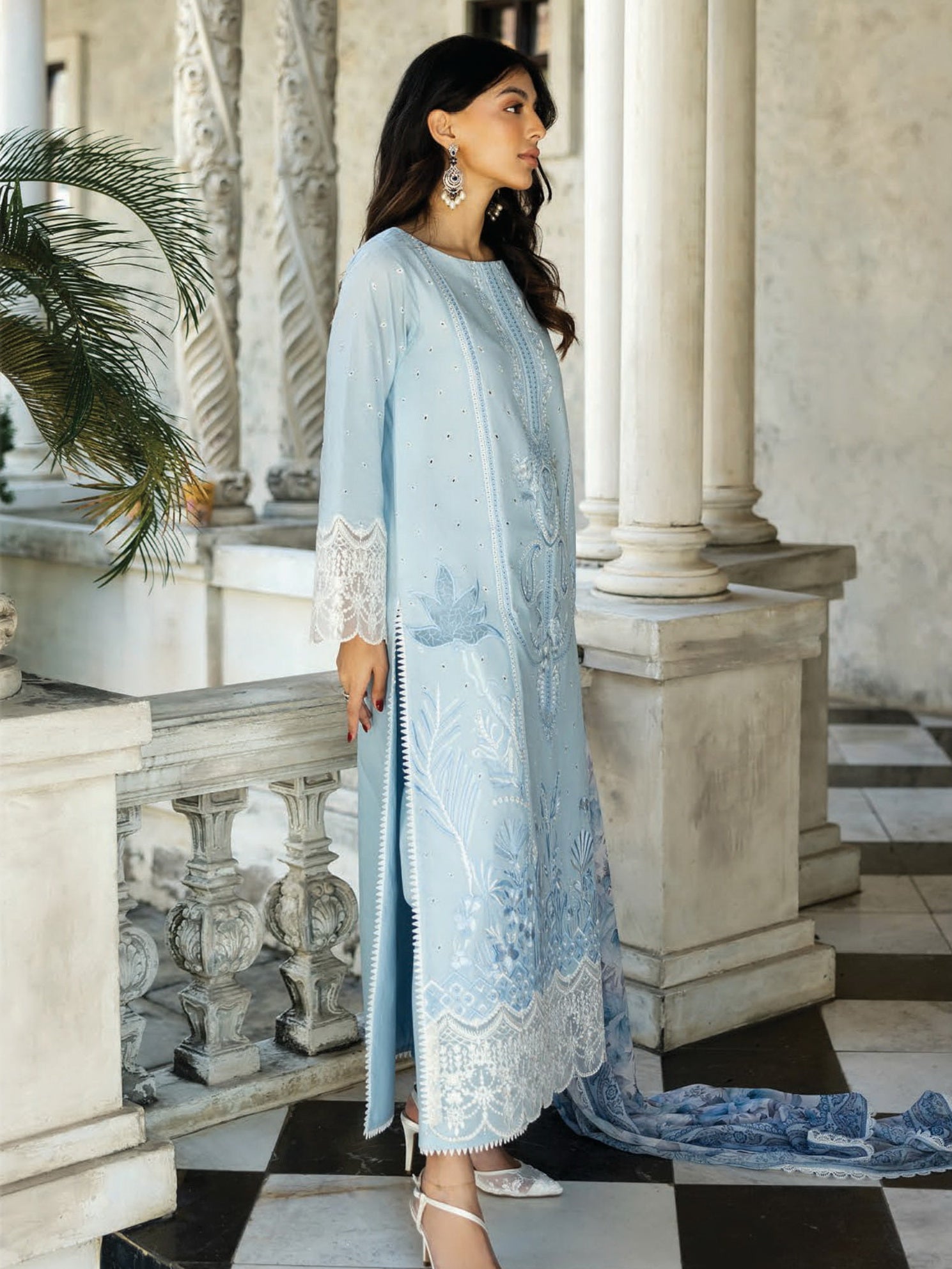 • DESCRIPTION: This exquisite soft light blue shirt adorned with intricate white Chikankari embroidery. The delicate floral and traditional motifs are meticulously handcrafted, creating a mesmerizing play of light and shadow across the fabric. The neckline is further embellished with detailed embroidery, adding a touch of regal sophistication. A lightweight, flowing dupatta in a complementary pink shade drapes effortlessly, enhancing the ethereal charm of the ensemble. Coordinating pink trousers, tailored for a flattering silhouette, complete the look, making it perfect for both daytime elegance and evening soirees.