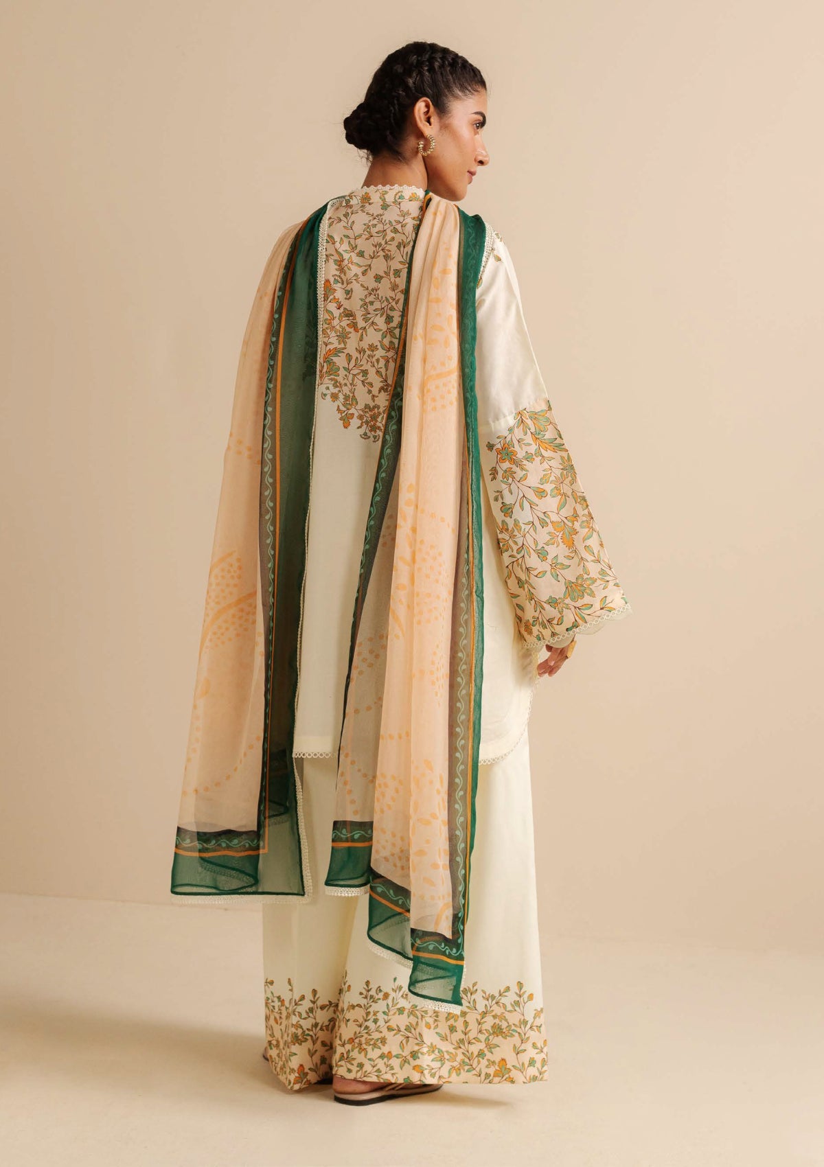 • A breezy printed shirt with tonal embroidery, styled with crisp trousers with heavy border and a dreamy light shade dupatta in blended hues.